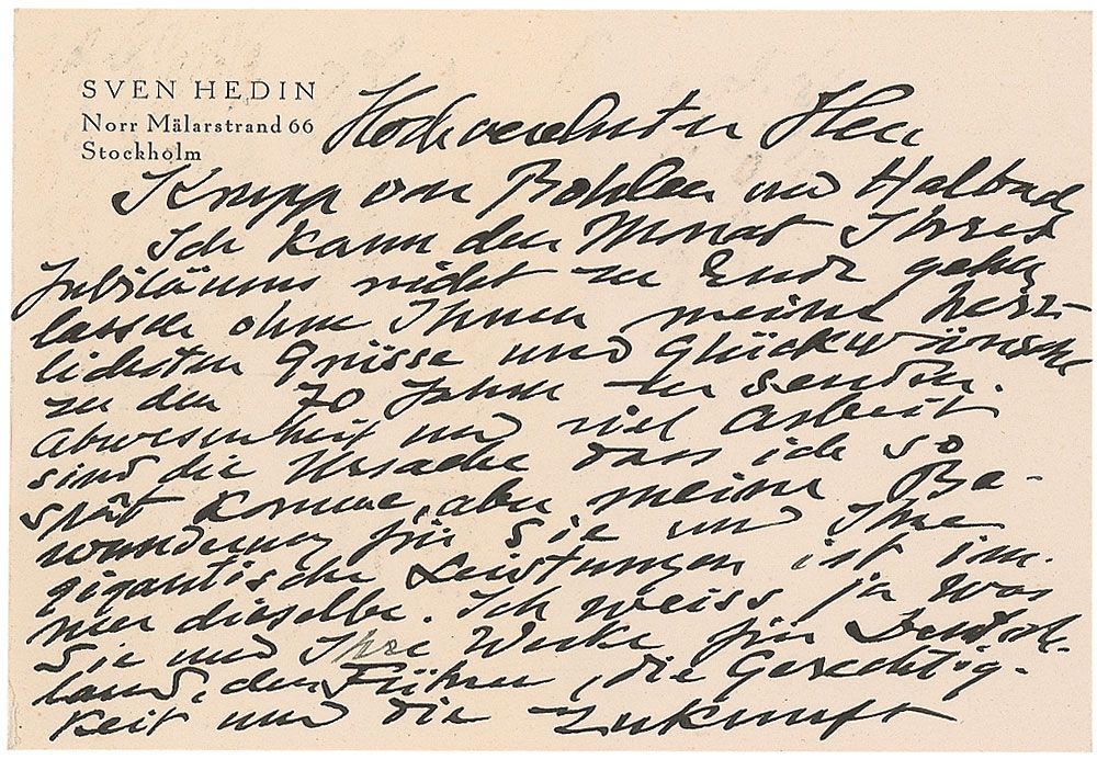 ALS in German, on the inside of two pages of his personal note card, 6 x 4, August 30, 1940. Letter to German industrialist Krupp von Bohlen und Halbach. Hedin sends his good wishes to Krupp on the celebration of his 70th birthday, and praises his work “for Germany, the Führer, Justice…the future of the German people…”front of card bears a reproduction sketch by Hedin on the front, from his 1898 work, “Through Asia,” captioned in the book, “An Ornamental Gate in the Interior of Si-Ning-Fu.” Accompanied by a 5 x 4 slip, inscribed in another hand, to von Bohlen, dated November 24, 1942, receipt stamping, imprinted in German “Presented by the Author,” with “Swen Hedin ‘Amerika’” typed in. In fine condition.