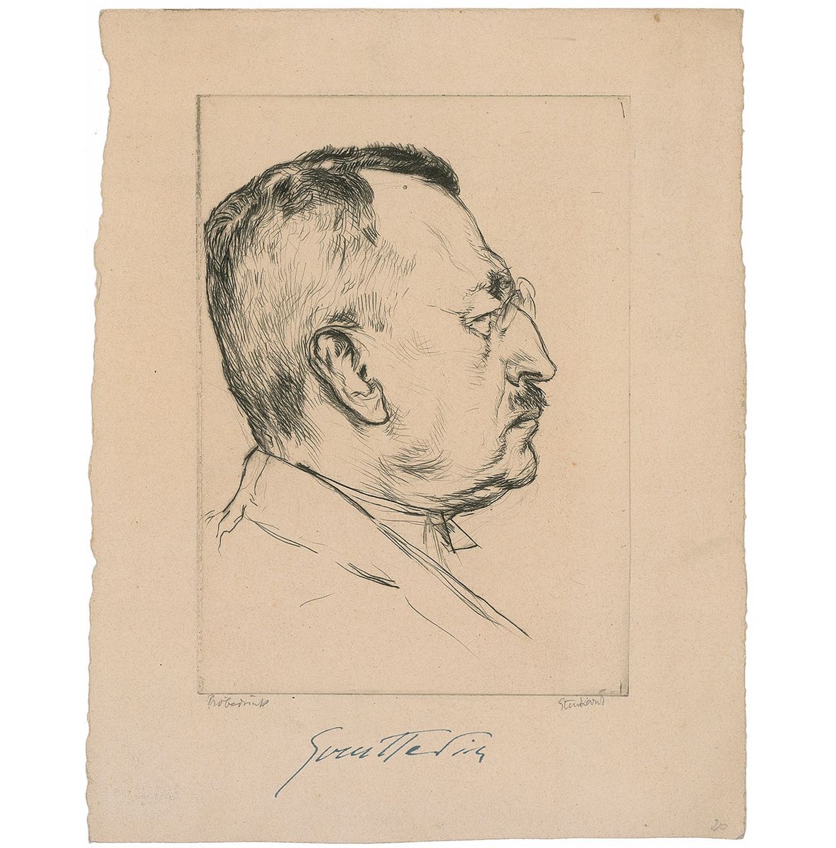 Swedish explorer (1865–1952) who mapped the Himalayas and other regions in Central Asia. Handsome profile portrait etching of Hedin, 8 x 10.25, neatly signed in the lower border in fountain pen. Also signed in pencil by the artist. In fine condition.
