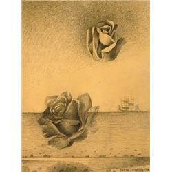 coal drawing, signed and dated -74, surreal scene with roses, 20 x 15 cm