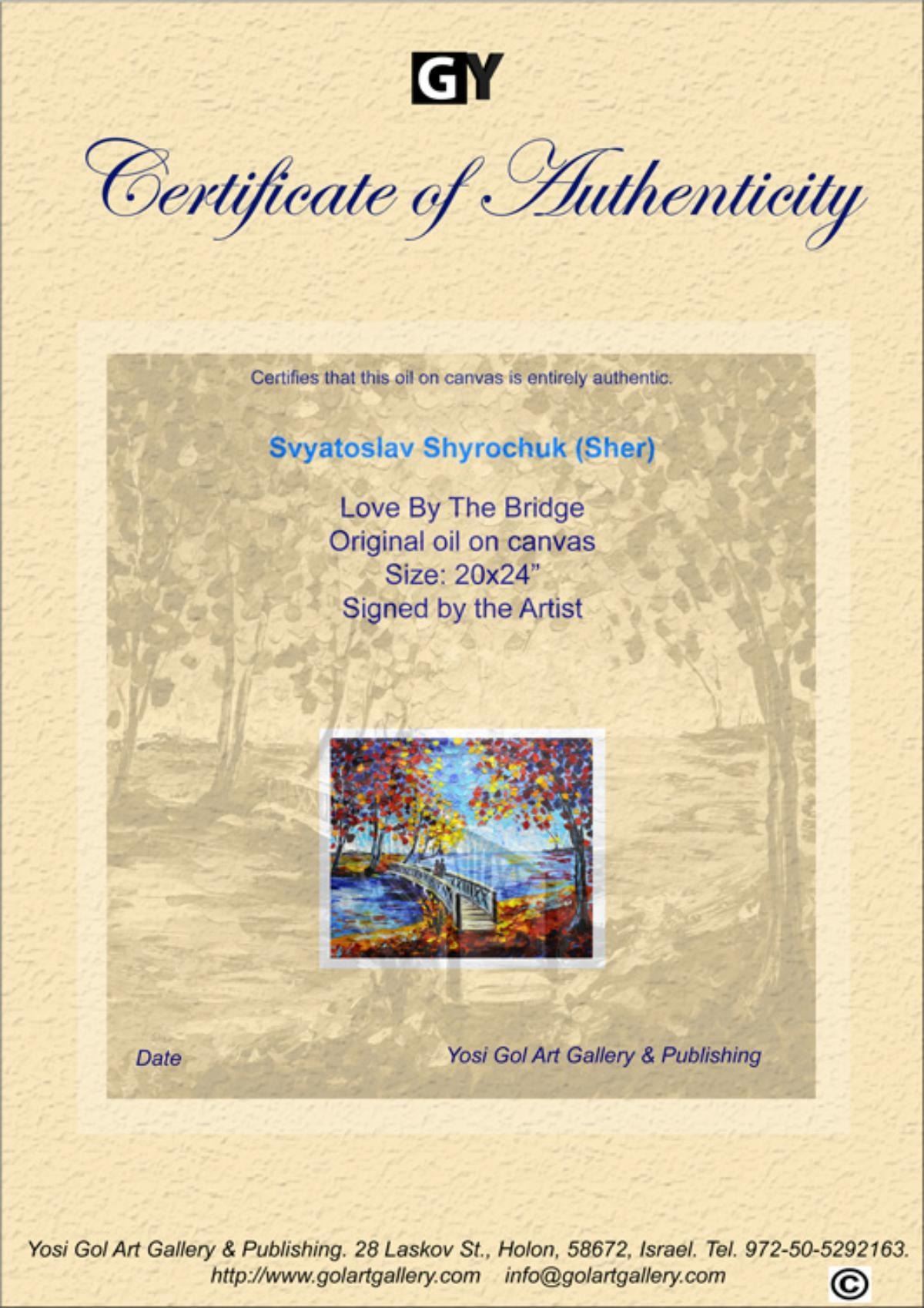 Artist: Svyatoslav Shyrochuk. Medium: Original Oil on Canvas. Title: Love By The Bridge. Size (Unframed): 20" x 24". Certificate of Authenticity: From the publisher. Reference# 10667.