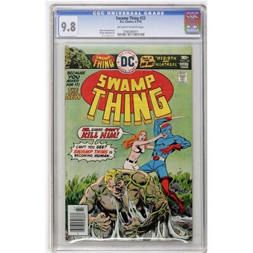 <B>Swamp Thing #23 (DC, 1976) CGC NM/MT 9.8 Off-white to white pages.</B></I> New logo. Ernie Chan cover. Nestor Redondo art. Swamp Thing reverts back to Dr. Holland. Highest grade yet assigned by CGC for this issue. Overstreet 2007 NM- 9.2 value = $22. CGC census 10/07: 2 in 9.8, none higher. <I> From the Fantastic Frank Collection.</B></I><BR><BR><b>Shipping:</b> Comics - Slabbed (certified) (<a target="_blank" href="http://www.heritageauctions.com/common/shipping.php">view shipping information</a>)