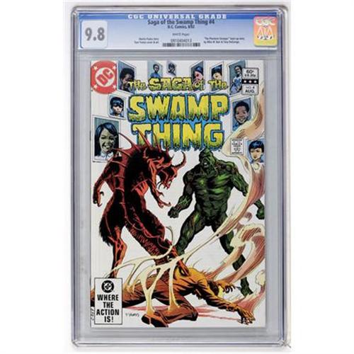 <B>Saga of the Swamp Thing #4 (DC, 1982) CGC NM/MT 9.8 White pages.</B></I> Phantom Stranger backup story. Tom Yeates cover and art. Overstreet 2007 NM- 9.2 value = $4. CGC census 3/08: 1 in 9.8, none higher.<BR><BR><b>Shipping:</b> Comics - Slabbed (certified) (<a target="_blank" href="http://www.heritageauctions.com/common/shipping.php">view shipping information</a>)