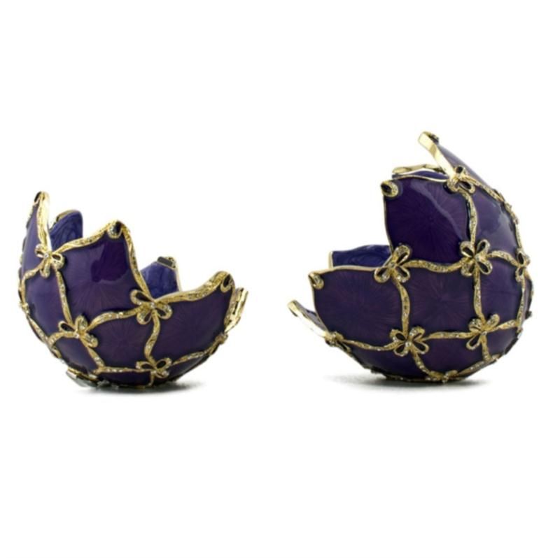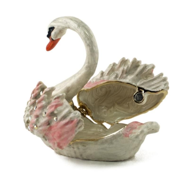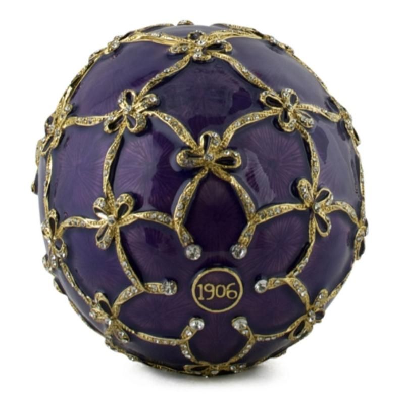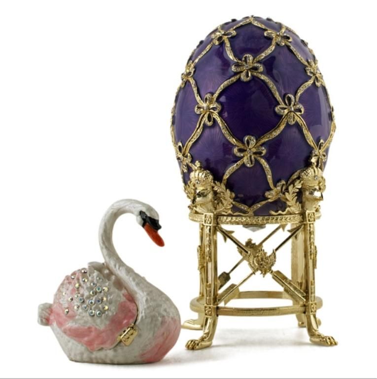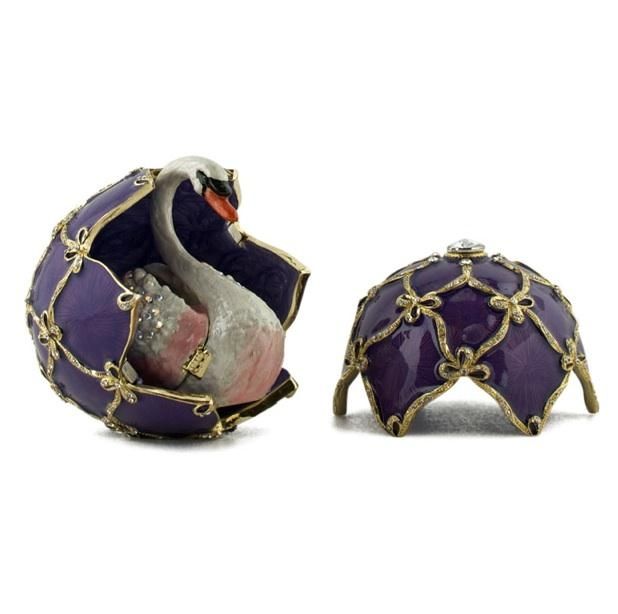 The Swan Egg was ordered in 1906 by Tsar Nicholas II, the egg was presented to the Dowager Empress Maria Feodorovna on Easter that year for her 40th wedding anniversary. Design The egg was made of mauve enamel, with gold trim. On the exterior is a twisted ribbon trellis design of rose-cut diamonds, as well as a portrait diamond on the top inscribed "1906". Another portrait diamond on the other end once held the Imperial monograph. The "surprise" that came inside the egg is a miniature gold and silver swan on a "lake" of aquamarine. By winding a gear beneath one of the wings, the swan's mechanical neck and wings move. In Russia, the swan is considered a symbol of family life and the permanence of the bond of marriage. 6" (H) X 3" (D) Pewter, Enamel, Crystals