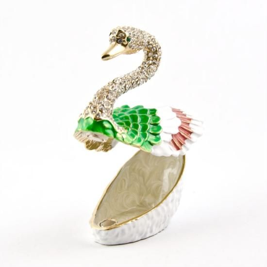 Swan Faberge Trinket Box, This jewelry box is beautifully ornamented with crystals all over the neck of the graceful swan. The eyes are made of green miniature crystals. The feathers are made of green, white, and red enamel. The upper part of the this beautiful swan opens up for jewelry storage underneath. Material: Pewter, Austrian Crystals, Enamel. Dimensions: 2.5in (H) X 2.5in (Base Diameter) 2.5in (L) The famed Faberge eggs are jeweled eggs, often with the most ornate, minuscule designs on them. The House of Faberge made the original pieces from 1885 to 1917. At that time, they became popular gifts given during the Easter season. Larger versions were made for the Russian royal family, including Alexander III and Nicolas II. Of these, 42 of the 50 originals exist today. Most Faberge eggs, though, were much smaller and hung from a chain around the neck. These eggs have precious metals on them or gemstone decorations, often with intricate detailing. These are a symbol of luxury and thought of as individual masterpieces.