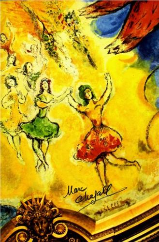Swan Lake. Chagall's glorification of the ballet, a whirl of twirling ballerinas against a yellow ground. Double page lithograph, 12 -1/2 x 1 9, authentically signed by Chagall in his usual black crayon, on yellow background at lower right. Tschaikowsky's music illuminated in a riot of colors: reds, greens, blues, each dancer set in a white outline, the prima ballerina in blue, resting on the swan itself. One of Chagall's most joyous visions. Excellent.