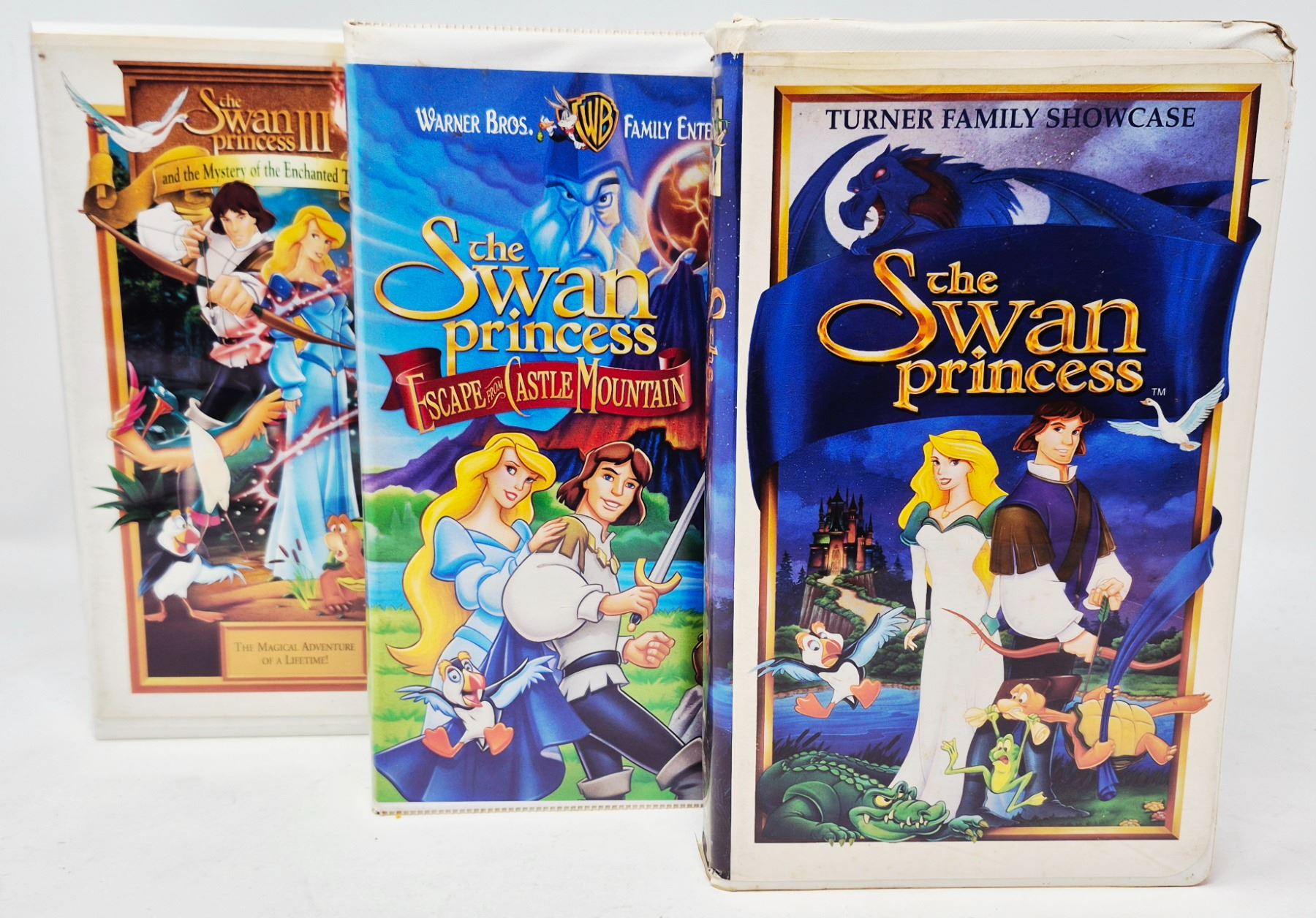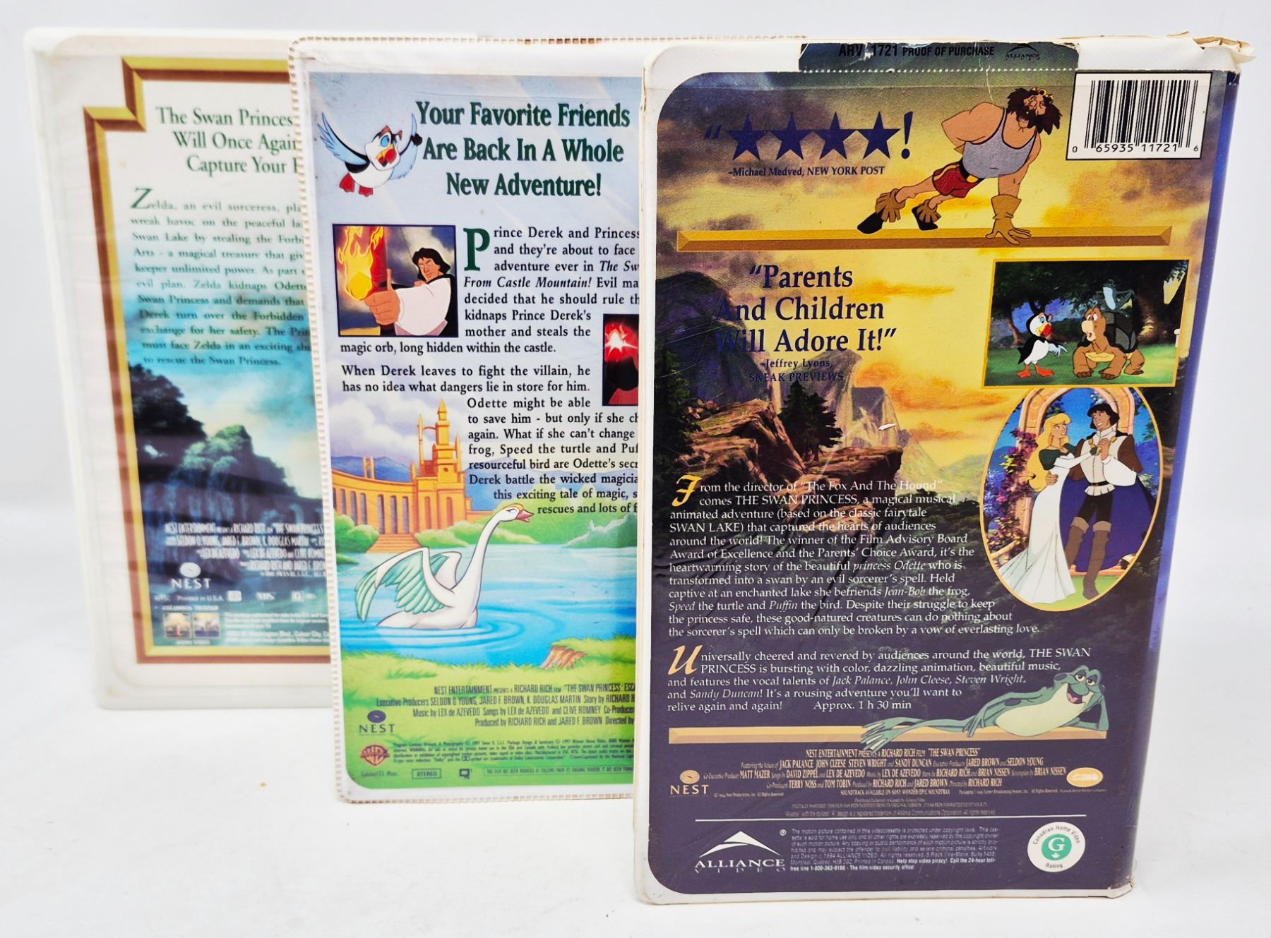 Original VHS tapes of “The Swan Princess” series: Parts 1–3. Family-friendly animated adventures with colorful clamshell cases. Great collector set!