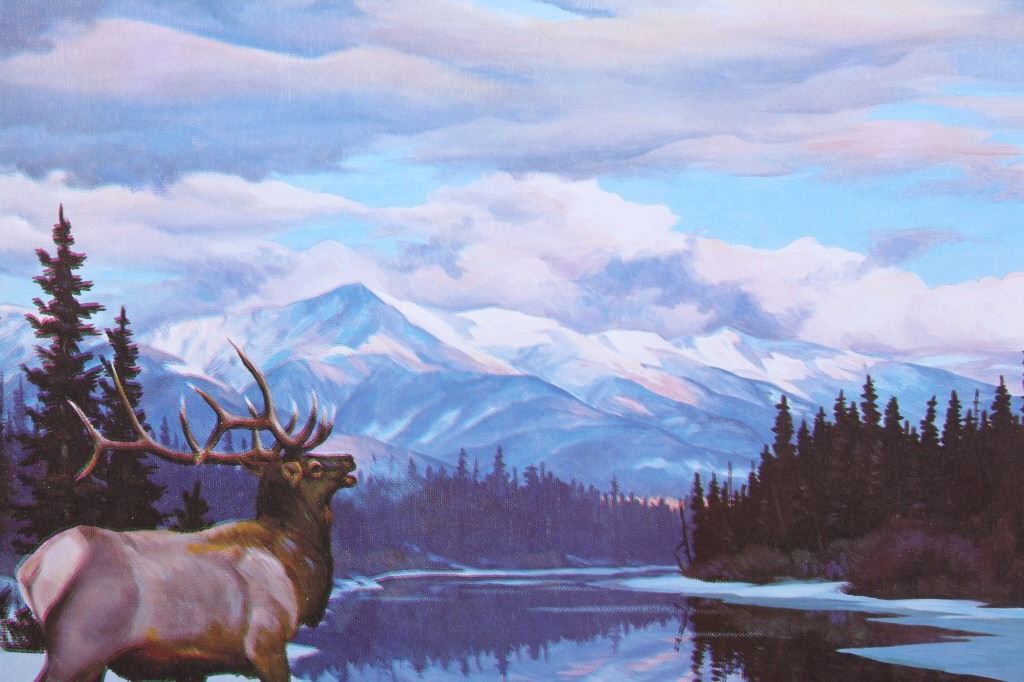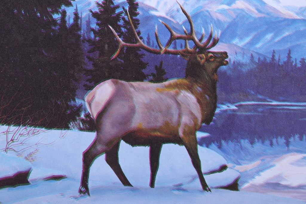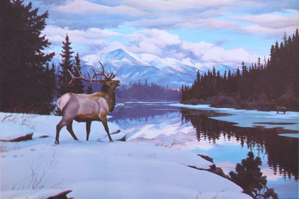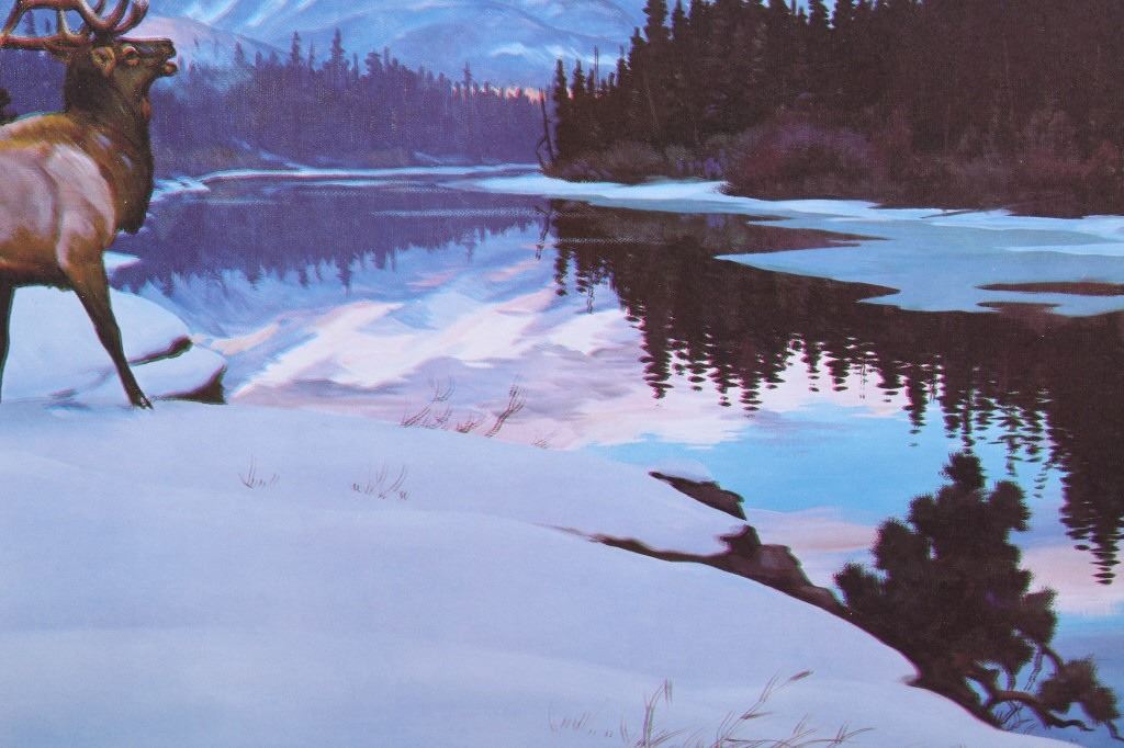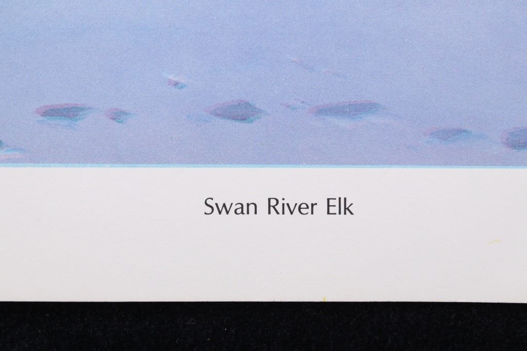 Featured in this lot we have a limited edition print of Elmer Sprunger's painting titled "Swan River Elk". Elmer Sprunger (1919-2007) was a Montana born artist known for his landscape and wildlife artwork. Sprunger studied art under Elizabeth Lochrie and spent World War II as a commercial artist for the army. Eventually Sprunger moved back to Montana in the 1950's and became a full time wildlife painter in 1972. Sprunger was recognized for his vivid paintings capturing the beauty of the north west outdoors. This print depicts a bull elk as he moves to the snow covered bank of the Swan River. The bull is shown as he prepares to call to elk on the other side of the river. The scenery depicts a beautiful snowy forest with snow covered mountains rising in the distance. The print shows wonderful detail and captures the beauty of Montana. The piece is signed in the bottom left hand corner of the print reading "Sprunger" with the bottom of the piece is marked "Swan River Elk". The piece was printed by Ken Carlson in 1974 and is numbered in the bottom left corner. The print shows good condition overall with little to no wear. It measures 26" wide by 20" tall.