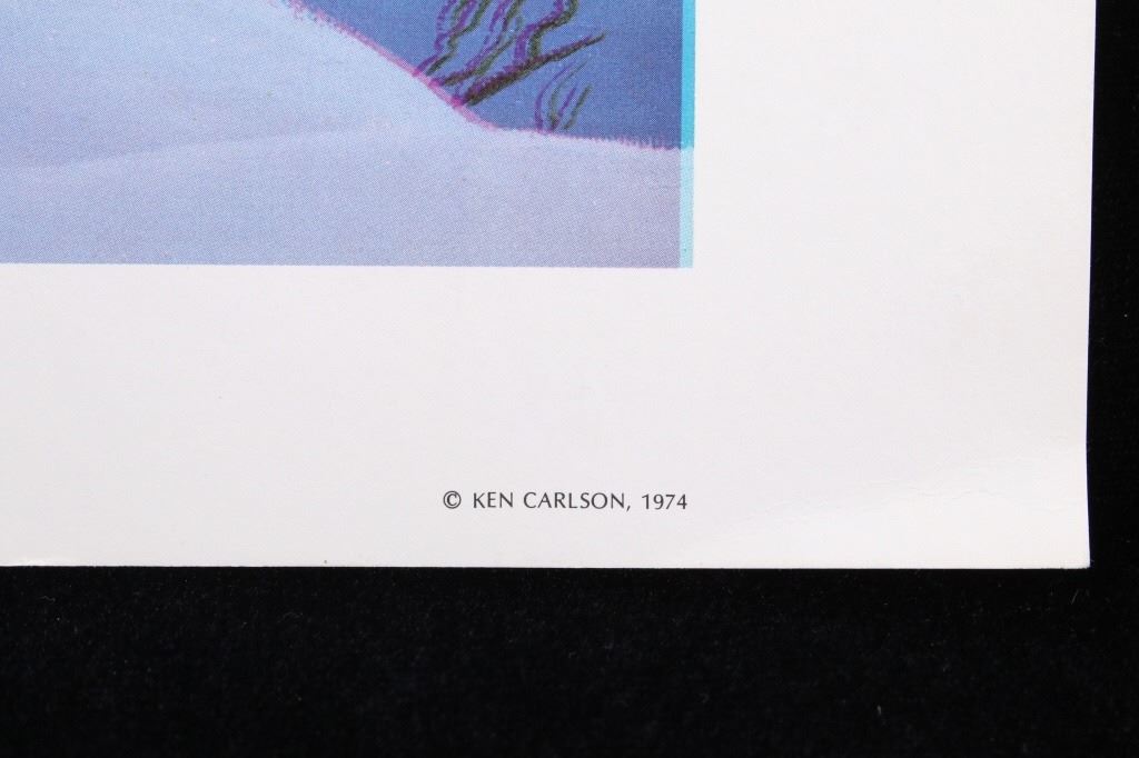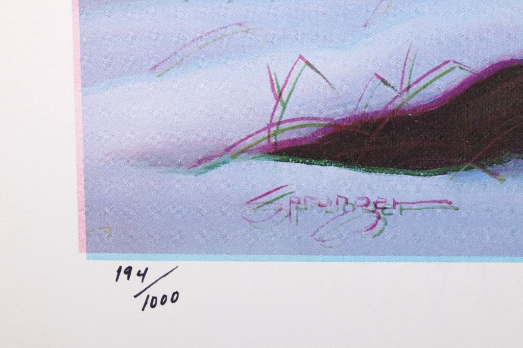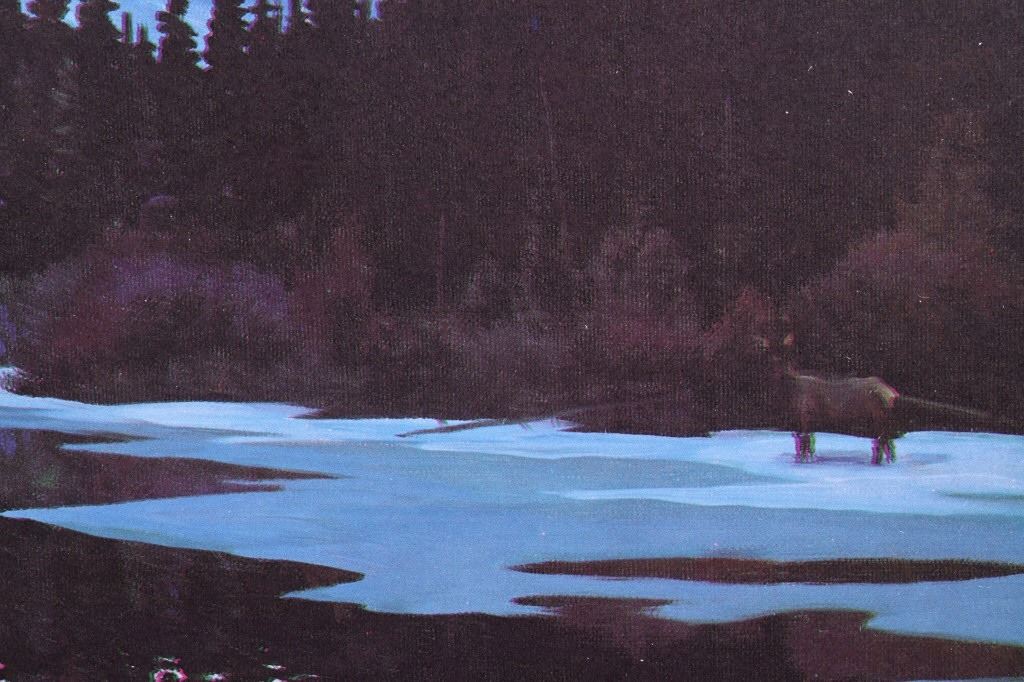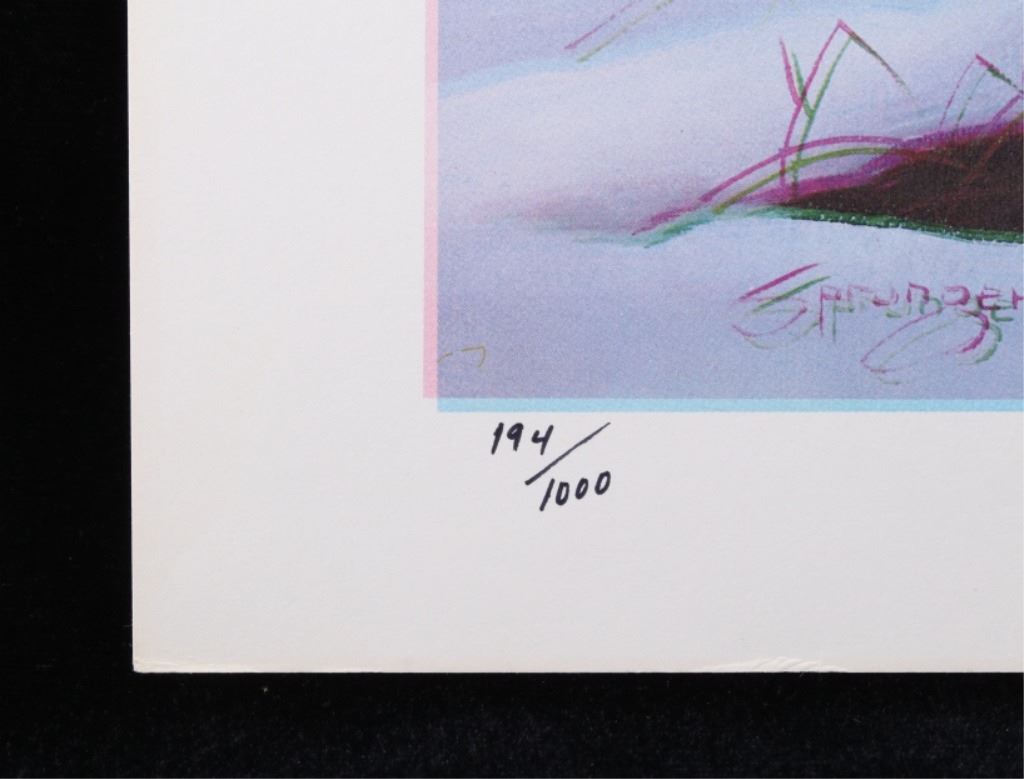 Featured in this lot we have a limited edition print of Elmer Sprunger's painting titled "Swan River Elk". Elmer Sprunger (1919-2007) was a Montana born artist known for his landscape and wildlife artwork. Sprunger studied art under Elizabeth Lochrie and spent World War II as a commercial artist for the army. Eventually Sprunger moved back to Montana in the 1950's and became a full time wildlife painter in 1972. Sprunger was recognized for his vivid paintings capturing the beauty of the north west outdoors. This print depicts a bull elk as he moves to the snow covered bank of the Swan River. The bull is shown as he prepares to call to elk on the other side of the river. The scenery depicts a beautiful snowy forest with snow covered mountains rising in the distance. The print shows wonderful detail and captures the beauty of Montana. The piece is signed in the bottom left hand corner of the print reading "Sprunger" with the bottom of the piece is marked "Swan River Elk". The piece was printed by Ken Carlson in 1974 and is numbered in the bottom left corner. The print shows good condition overall with little to no wear. It measures 26" wide by 20" tall.