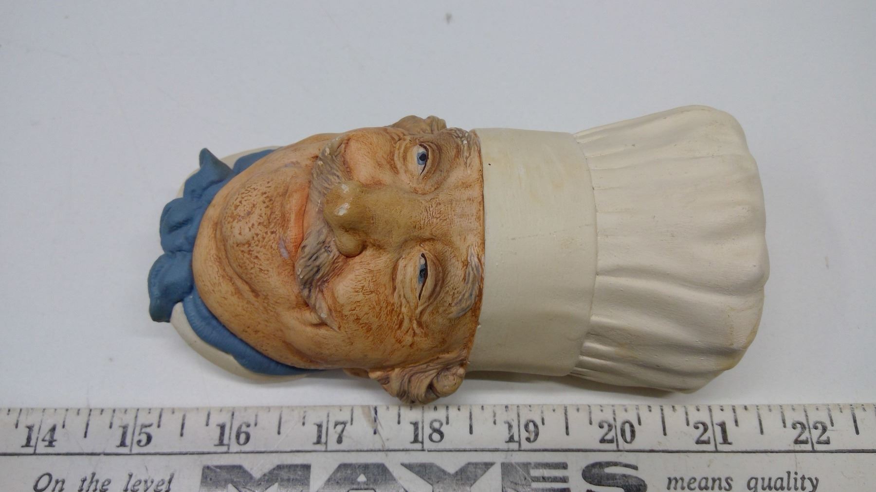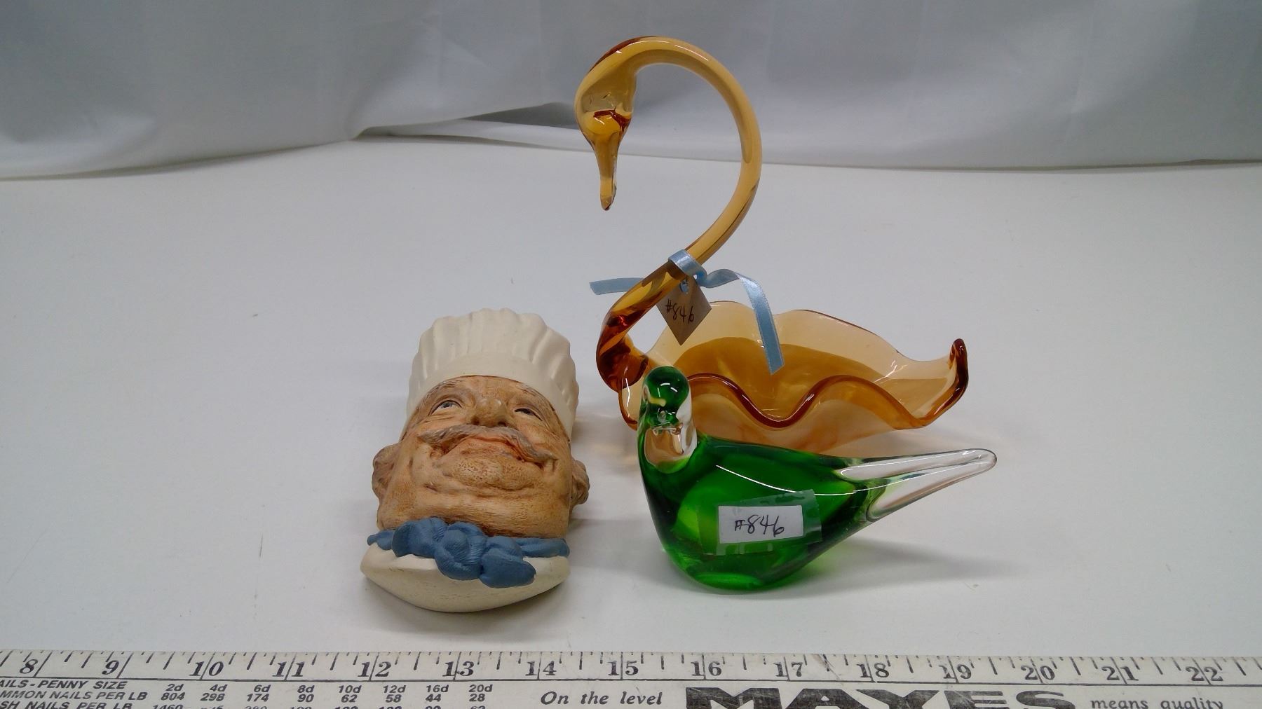 Swan dish, green bird paperweight and chalkware Chef’s head