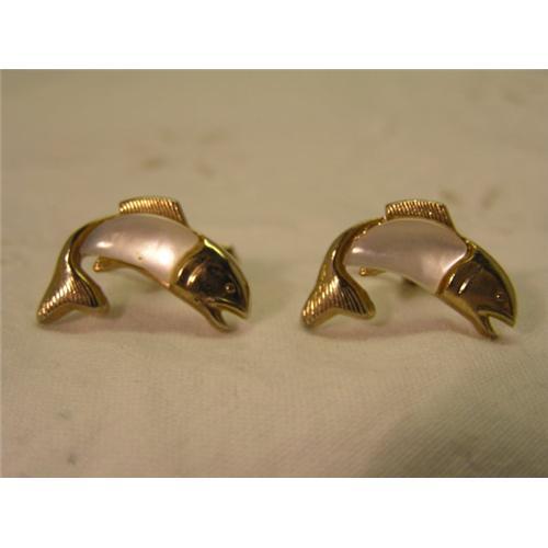 These Swank cuff links are goldtone and have a fish design with mother of pearl in the center of each fish. In very good condition.