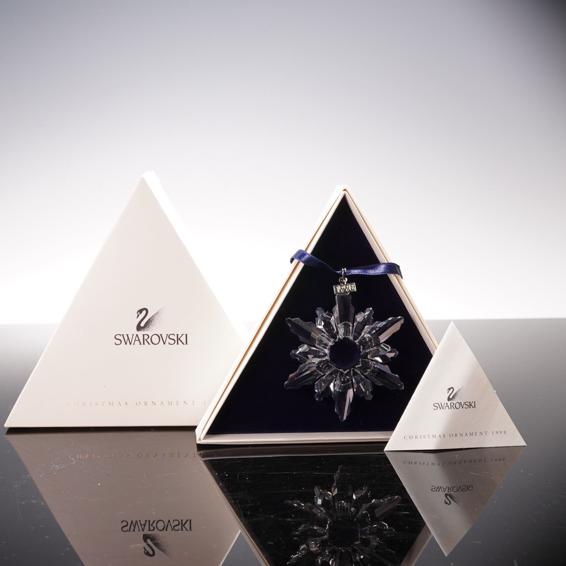 This exquisite clear crystal snowflake ornament features precision-cut facets that beautifully capture and reflect light. It is suspended from a blue satin ribbon and includes a polished metal tag engraved with the year "1998." Presented in its original triangular Swarovski box, this collectible piece bears the Swarovski swan logo mark etched into the crystal, signifying authenticity and craftsmanship. The model number is 220037.