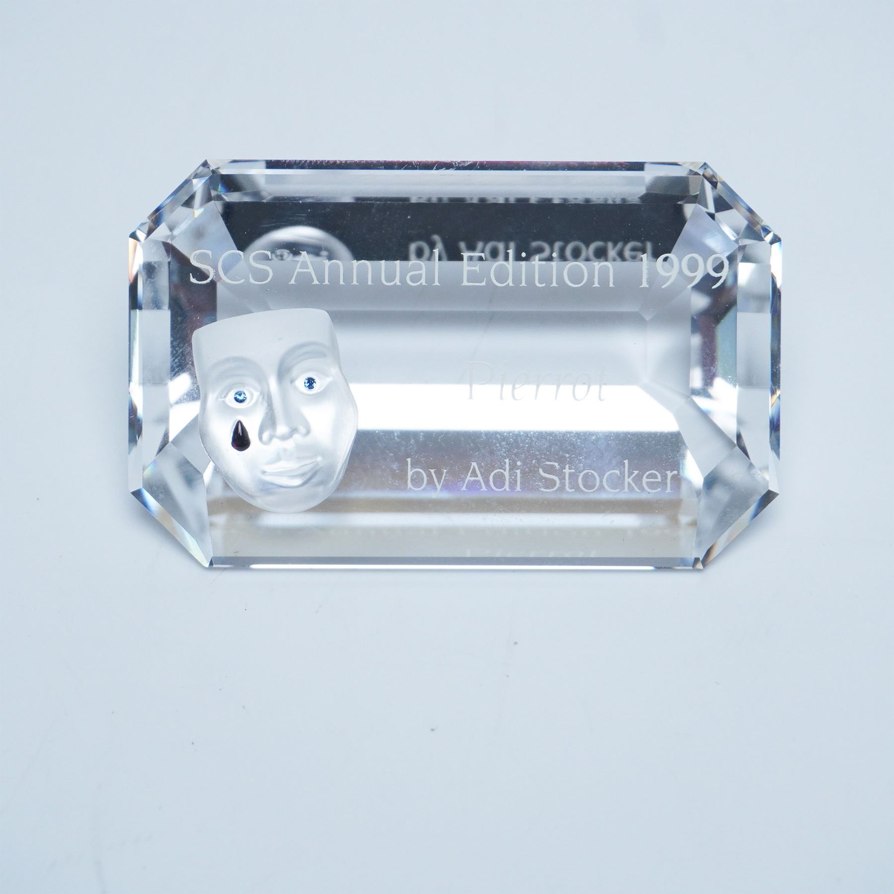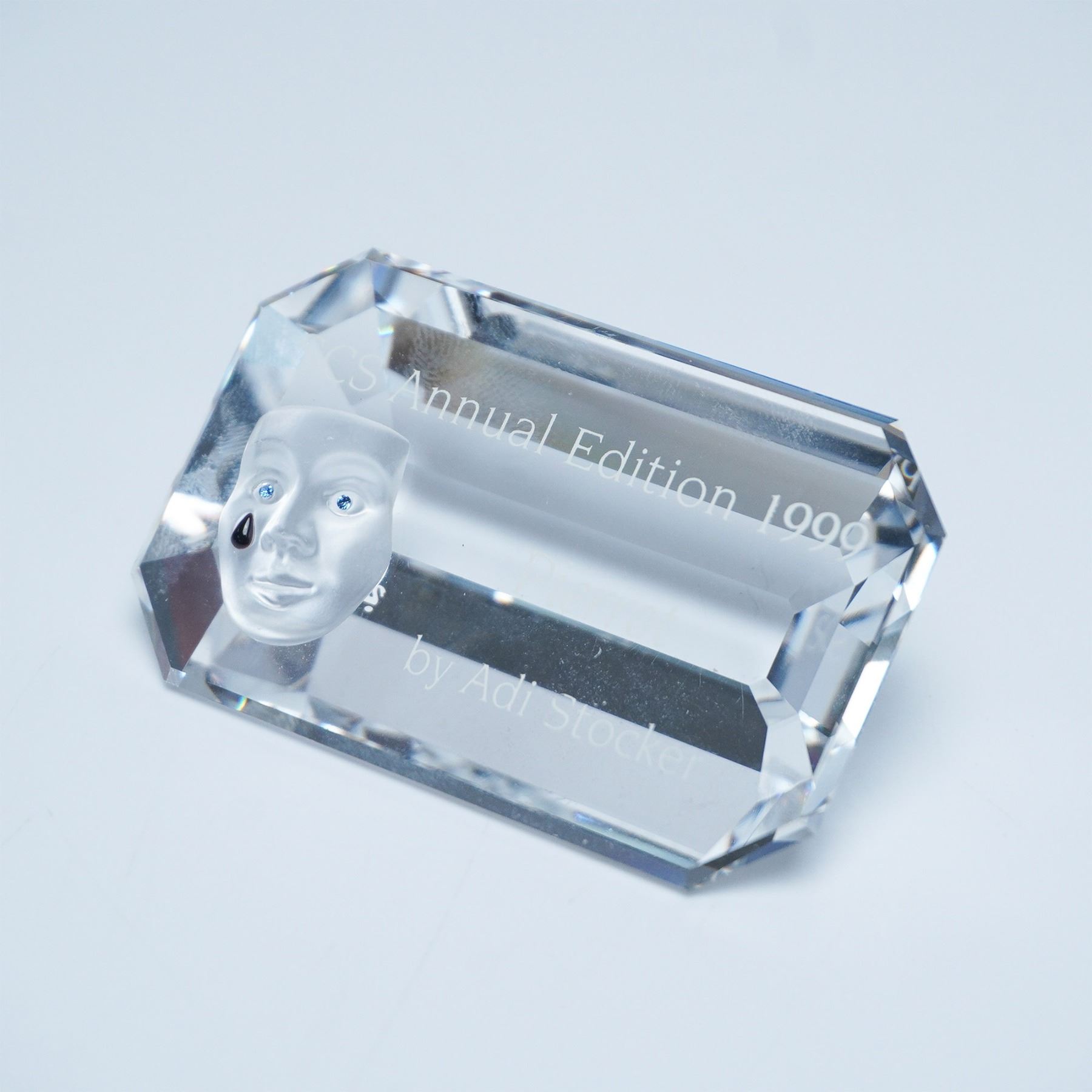 This Swarovski crystal plaque, released as part of the 1999 Annual Edition, features an exquisite beveled rectangular design with an attached frosted crystal face of Pierrot, the melancholic clown. This piece was created to accompany the 1999 SCS Annual Edition figurine and serves as a collector's display accessory. The plaque is expertly crafted with precision-cut crystal that reflects light beautifully. The frosted mask is accented by blue eyes and a black tear, adding an element of dramatic artistry to this rare collectible. The Swarovski swan mark is etched on the plaque, confirming its authenticity. A highly sought-after piece for Swarovski collectors and admirers of theatrical art. 231678.