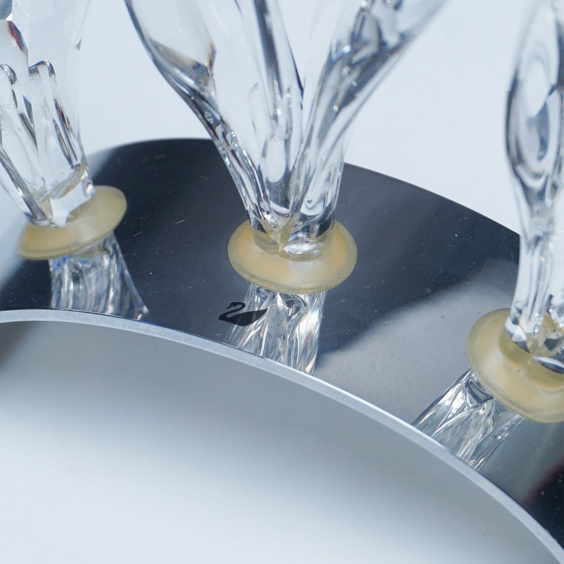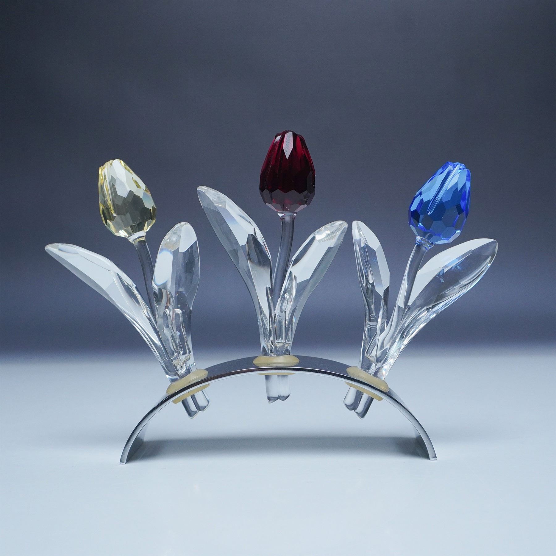 This exclusive Swarovski SCS members loyalty gift set features 3 stunning crystal tulip figurines, each representing a different year of membership. The collection includes the 2002 blue tulip, the 2003 red tulip, and the 2004 yellow tulip, all beautifully designed with faceted crystal petals and clear crystal leaves. The set is completed with the original chrome display stand, designed specifically to showcase the trio of tulips in a graceful arrangement. Each piece bears the Swarovski swan mark. A highly sought-after collectible for Swarovski enthusiasts. 2002 tulip blue (606546), 2003 red tulip (626481), 2004 yellow tulip (657335), and stand (600346).