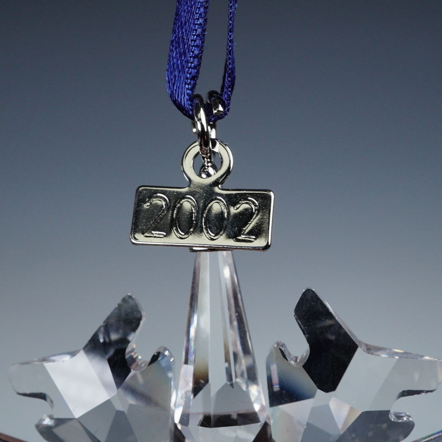 This exquisite crystal snowflake ornament features a radiant multi-faceted star design that captures and reflects light beautifully, creating a dazzling display. Suspended from a royal blue satin ribbon, it includes a polished metal tag engraved with "2002" to commemorate the year of issue. The piece bears the Swarovski swan logo etched on the crystal, confirming its authenticity. Presented in its original triangular blue box marked "Swarovski Christmas Ornament 2002." Model number 288802. This item has its original box.