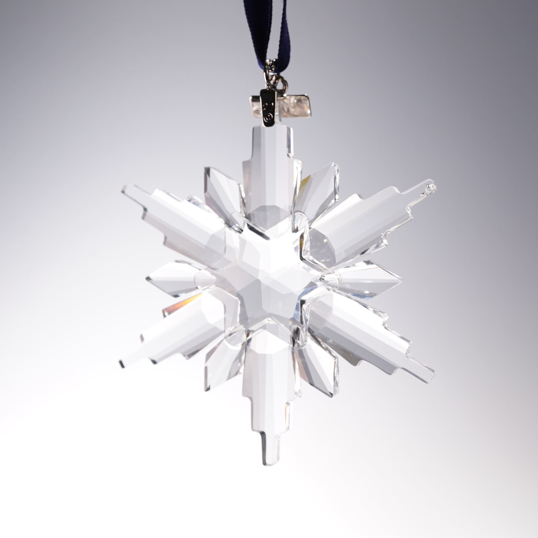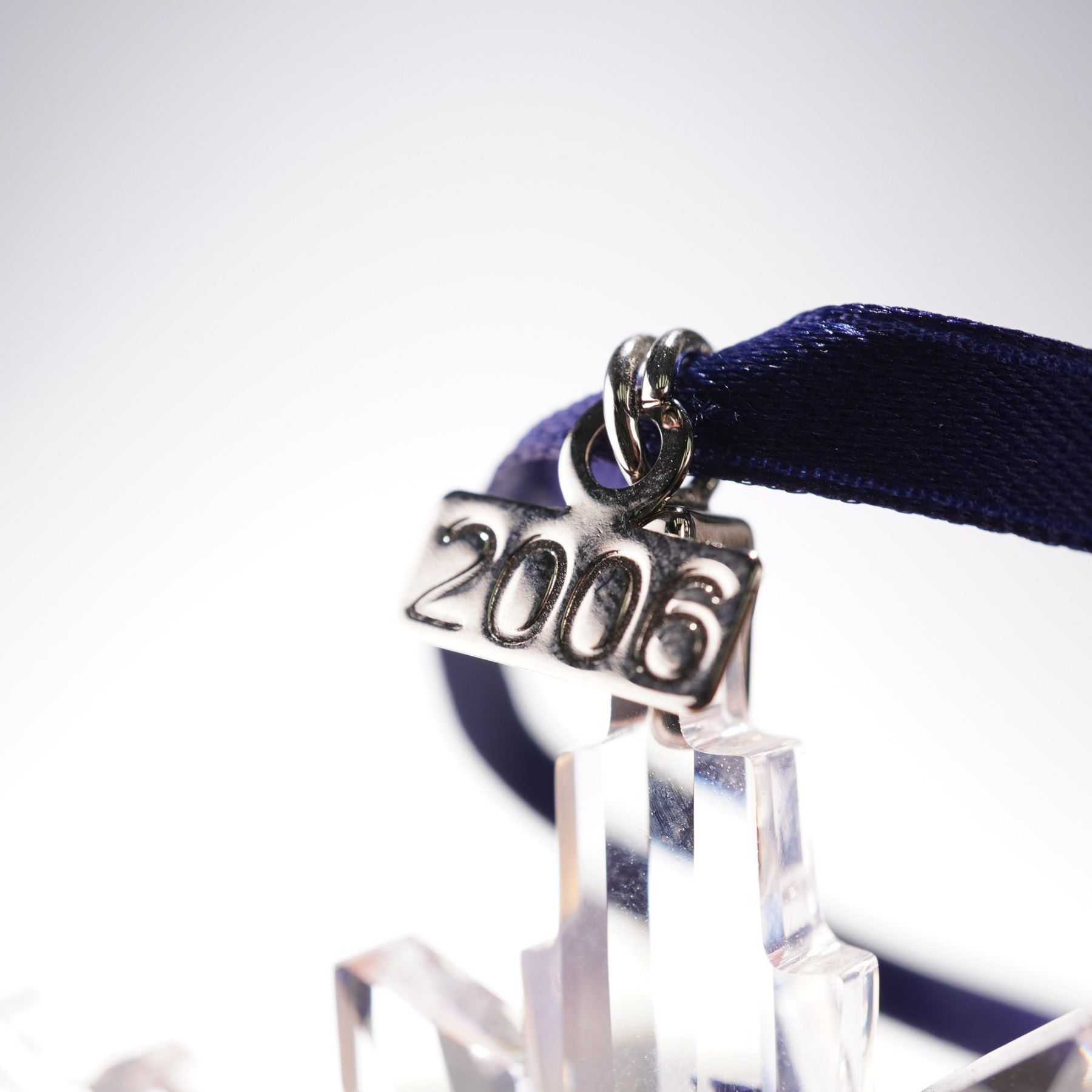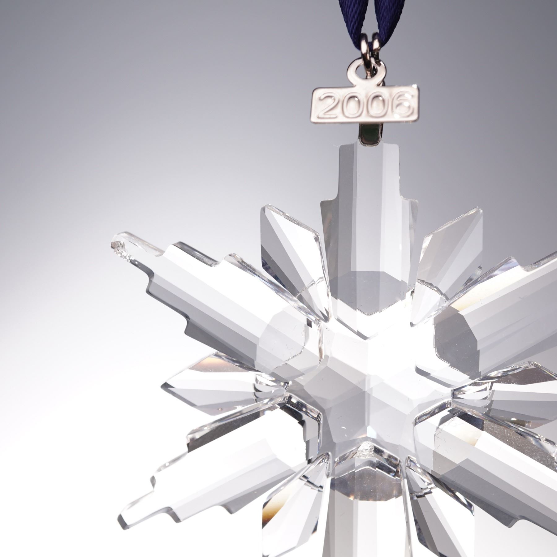This exquisite clear crystal snowflake ornament features precision-cut facets that reflect light beautifully, capturing the elegance and craftsmanship of Swarovski's annual holiday tradition. Suspended from a deep blue satin ribbon, the ornament includes a gleaming metal tag inscribed with the year "2006" and bears the Swarovski swan logo charm at the top, symbolizing authenticity and artistry. Presented in its original signature blue triangular box. Model No. 843555.