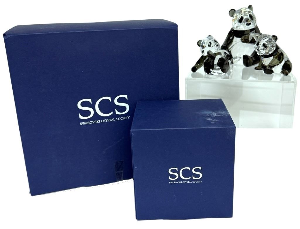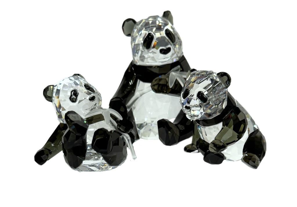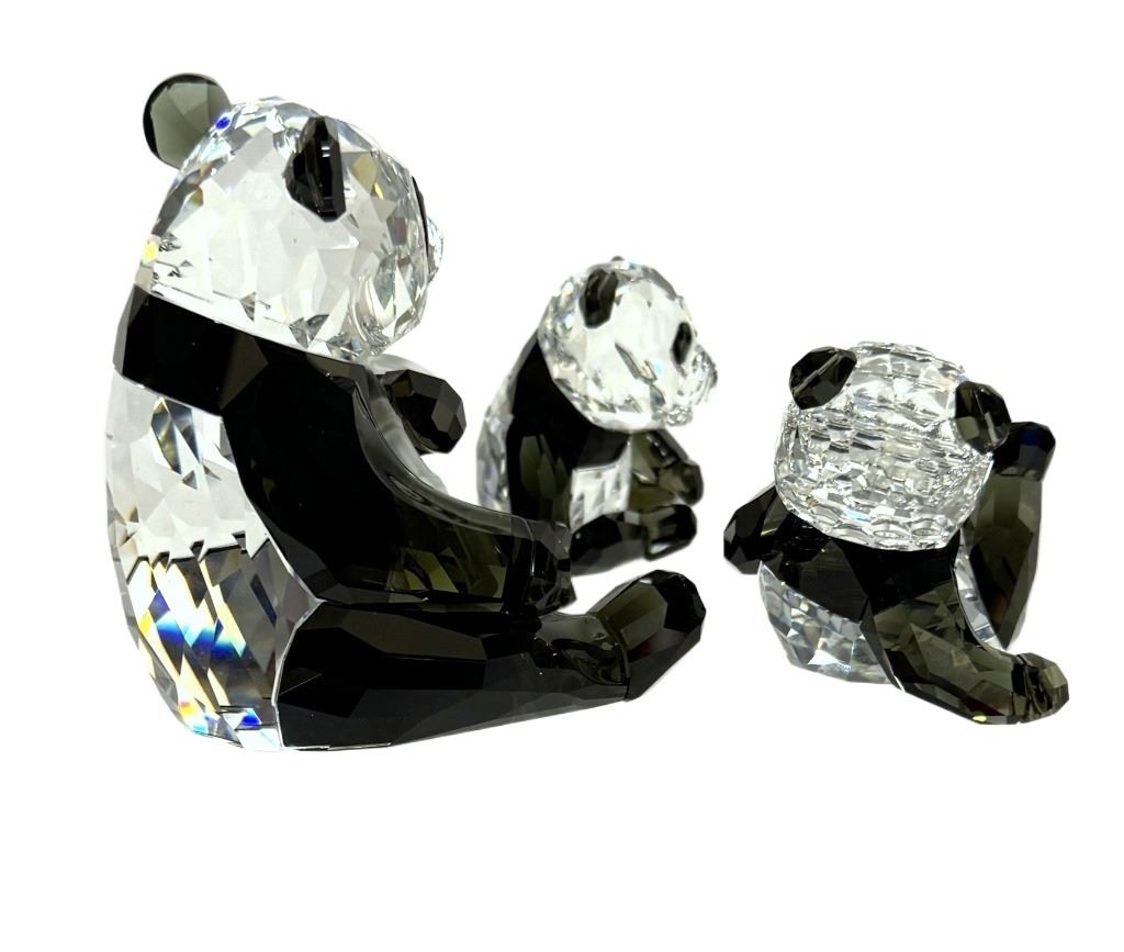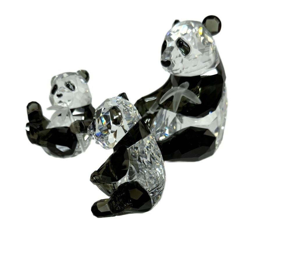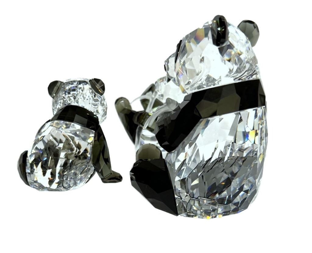 Item/Description: Swarovski Crystal Society (SCS) Annual Edition 2008 Panda figurines of a mother and baby panda cubs holding bamboo. Designed by Heinz Tabertshofer, this piece marks the first installment in the "Endangered Wildlife" trilogy, followed by the gorilla in 2009 and the tiger in 2010. Includes original boxes.