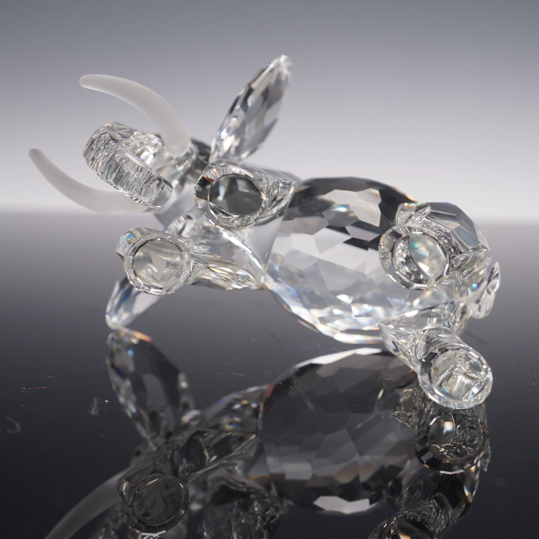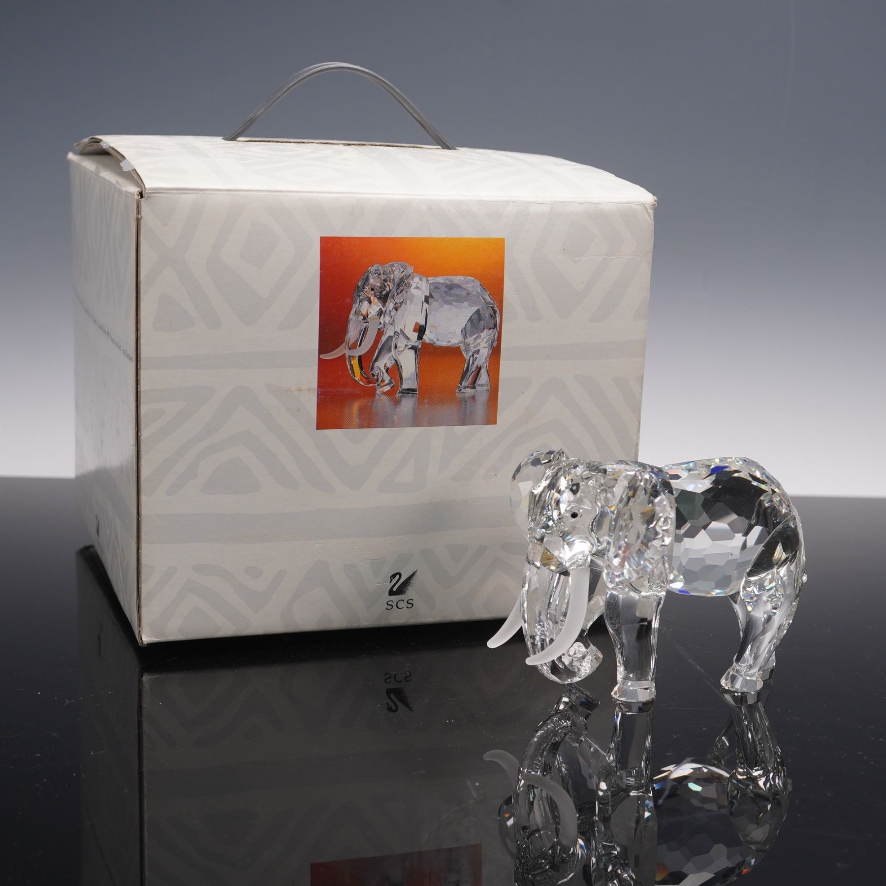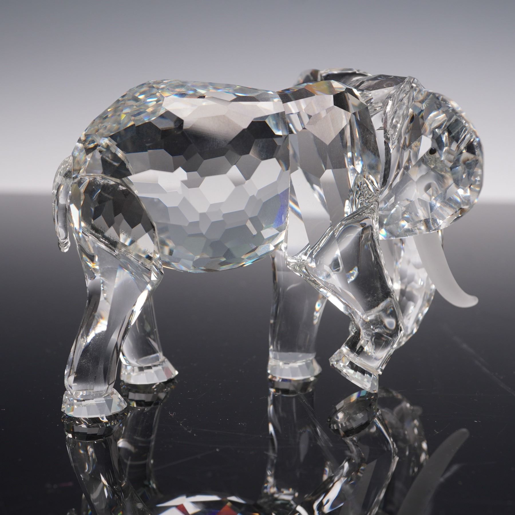 Designed as part of the Swarovski Crystal Society collection, this faceted clear crystal elephant features frosted white tusks and detailed sculpting to emphasize the animal's strength and elegance. Accompanied by its original Swarovski box with printed image and SCS logo. This figurine's model number is 169970.