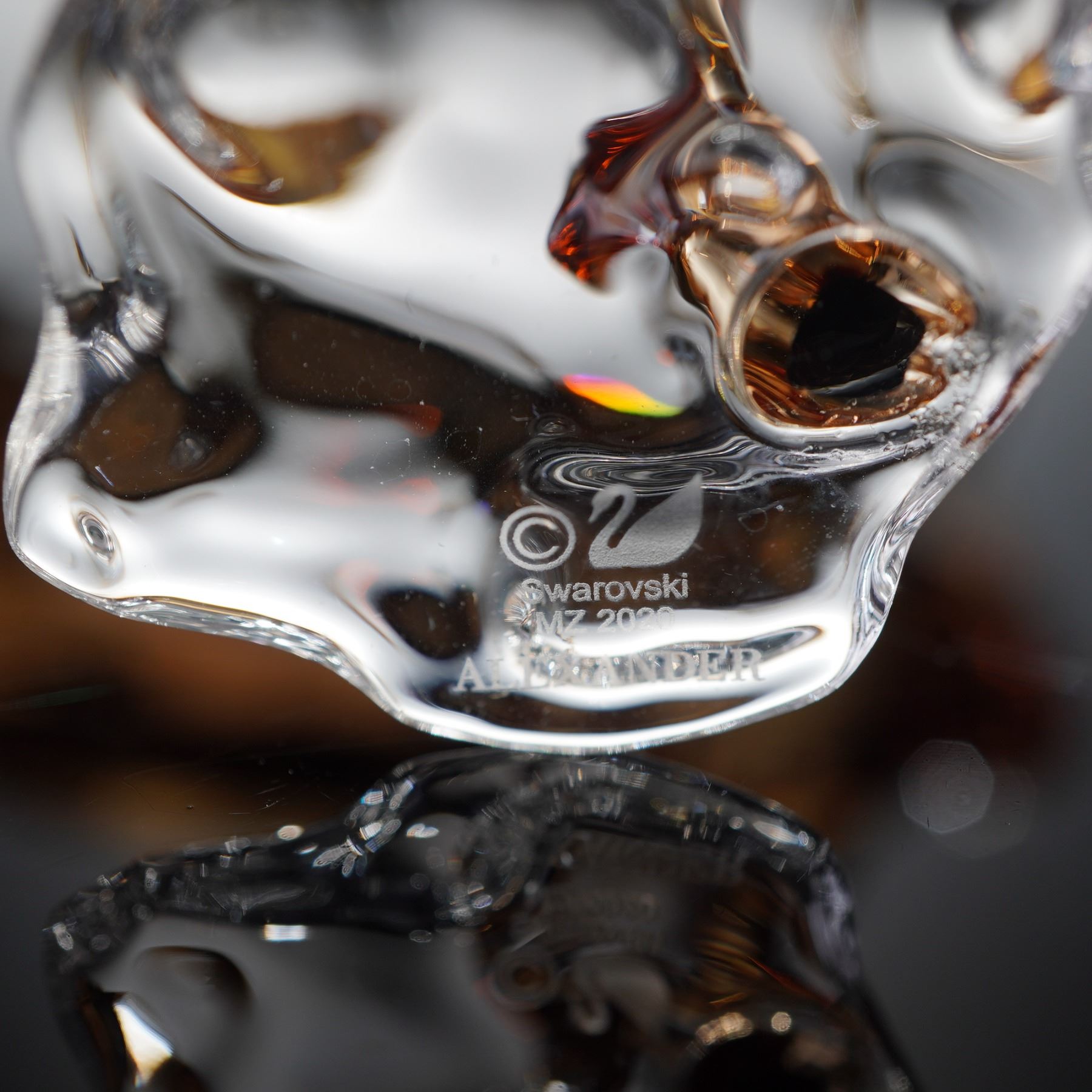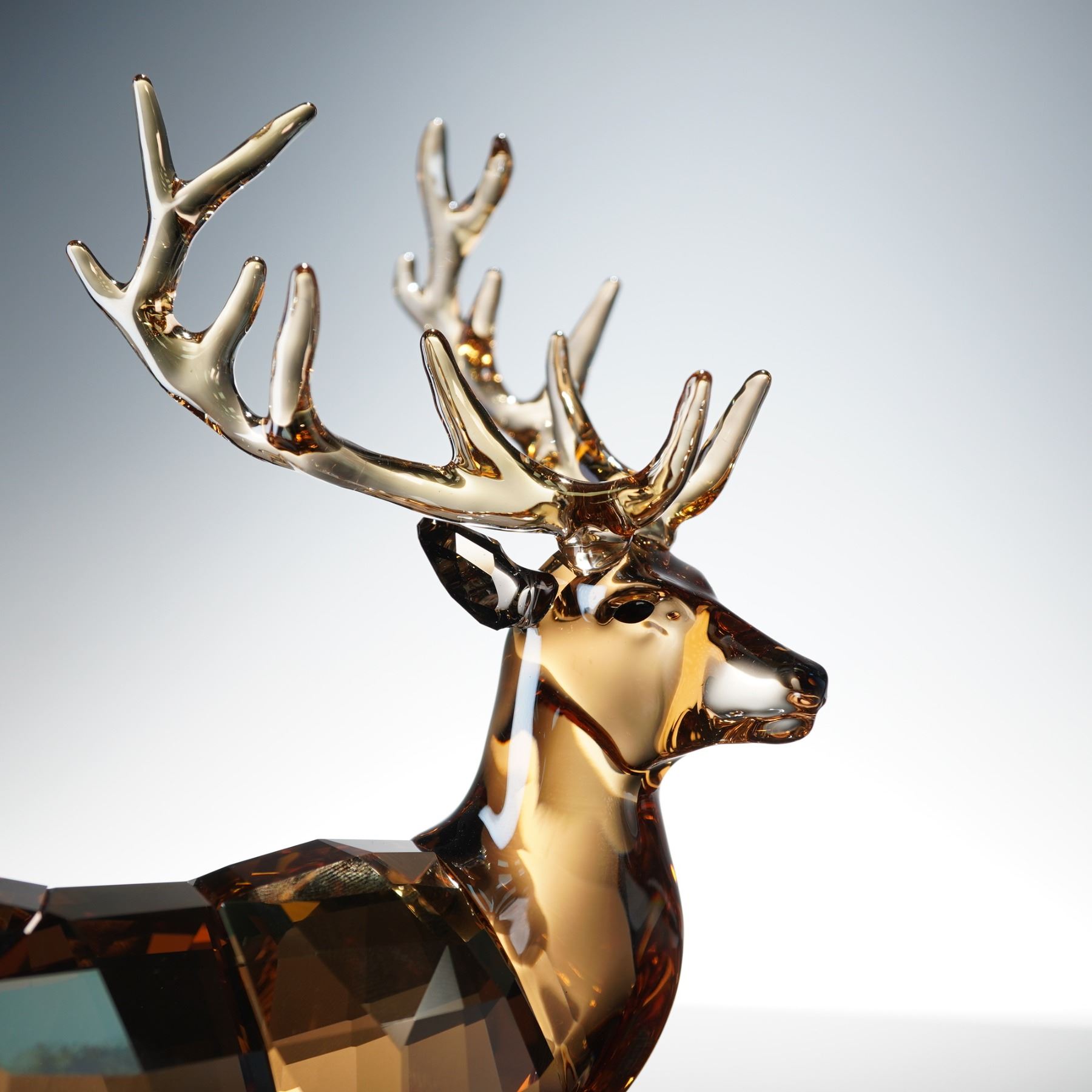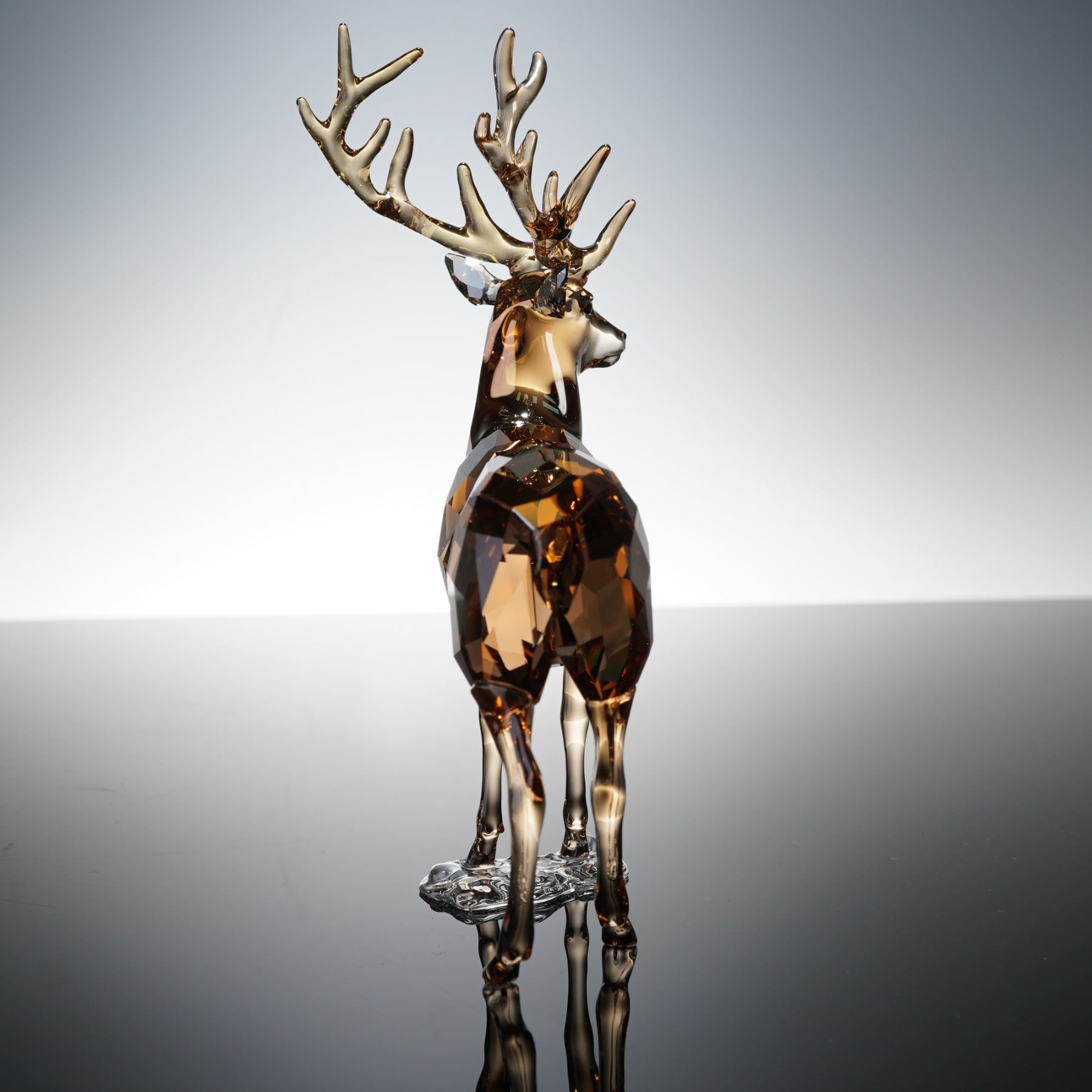 A masterfully crafted crystal stag, rendered in a spectrum of warm amber and golden tones that capture and refract light with exceptional brilliance. This elegant sculpture showcases intricate faceting across the body, with delicately sculpted clear crystal antlers and legs that convey lifelike grace and poise. The piece is presented with its original Swarovski box and features the etched swan logo and inscription "Alexander" along with the year mark. Model No. 5487948.