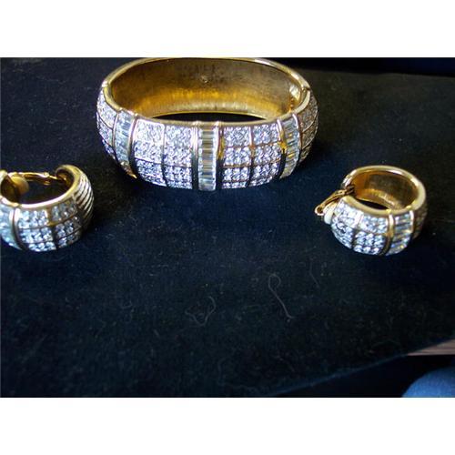 This is one of the most beautiful sets I have had in a long time.Total Swarovskie crystals.Many channel set.On one earring there are two small crystals missing.You have to have a jewelrs loop to see that they are not there as there are so many crystals.Heavy bracelet,measuring 1 1/4" across.Clip on earrings .Just a beautiful set and has so much sparkle.All three pieces marked with a swan.