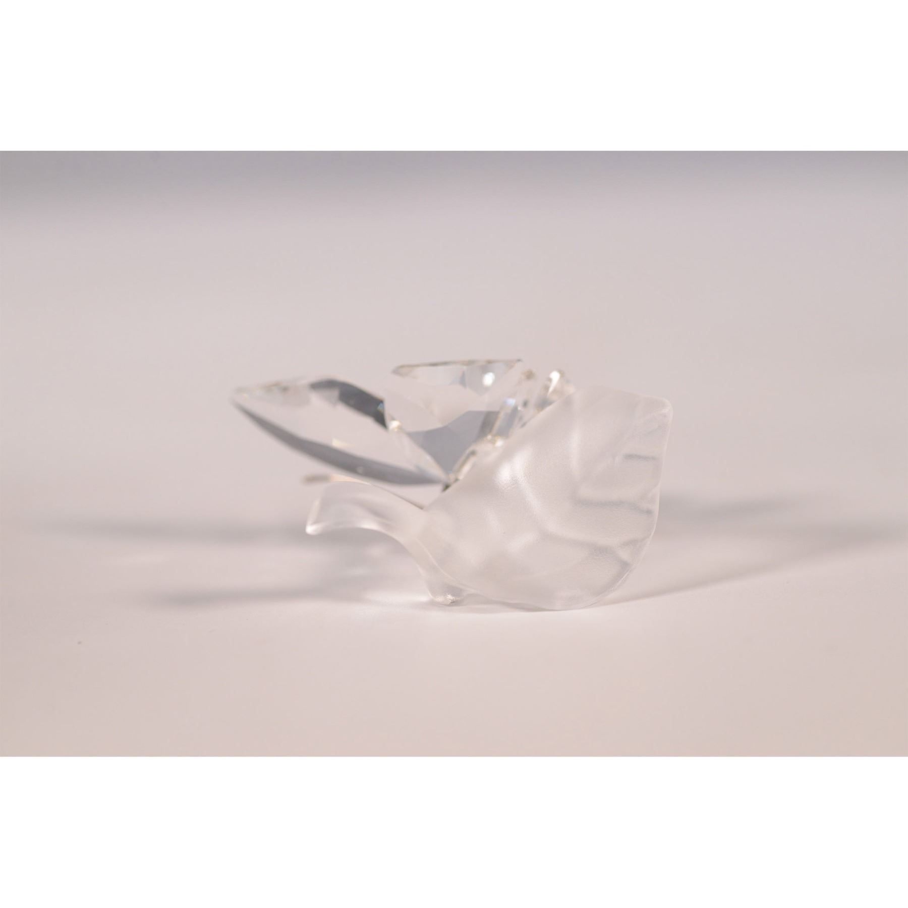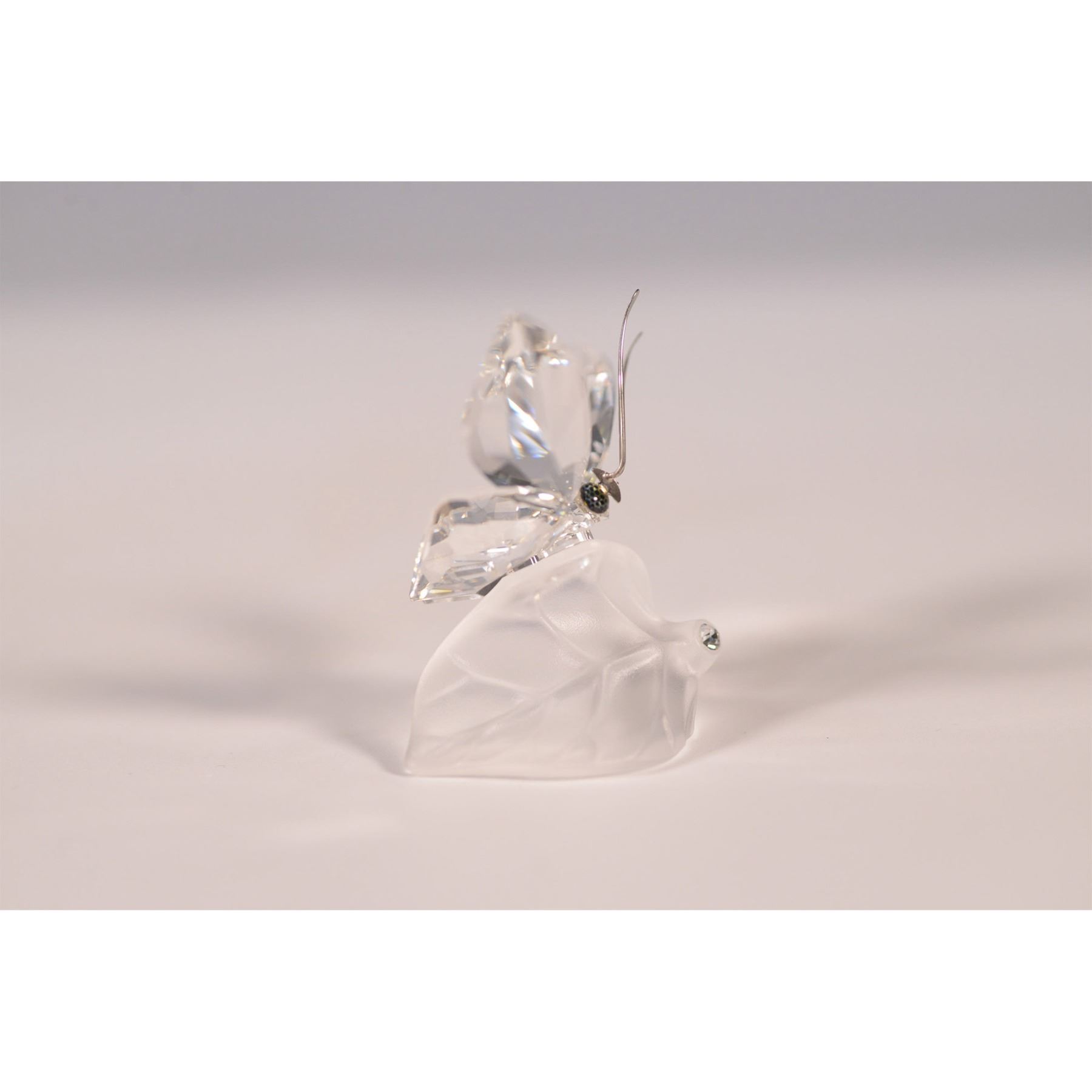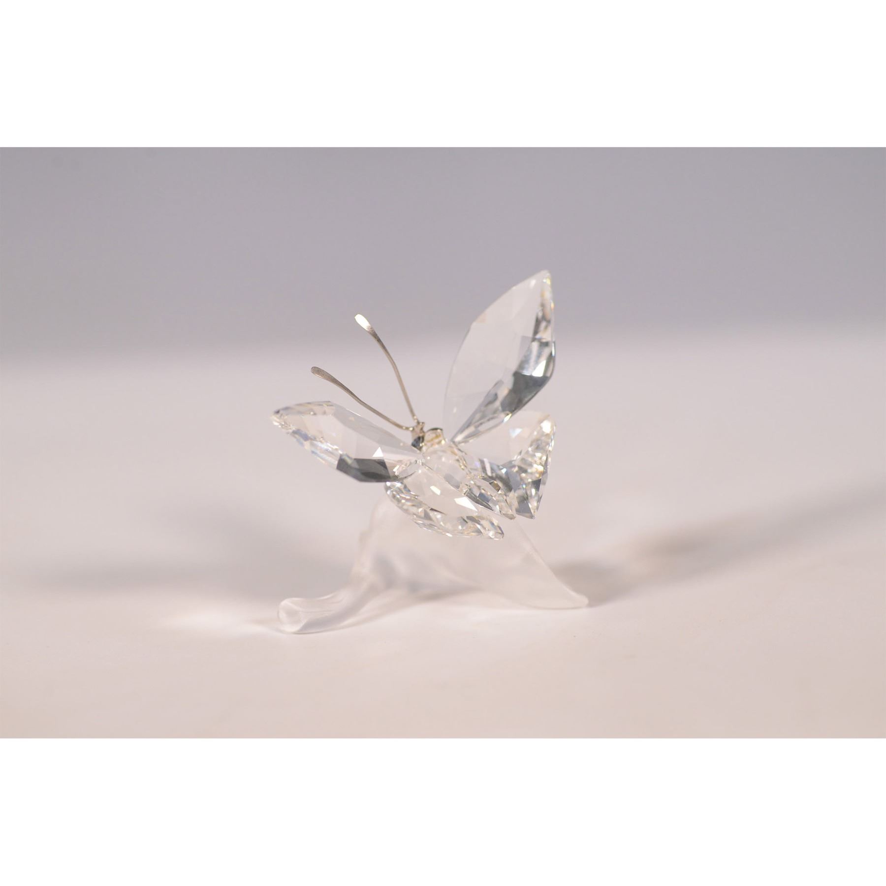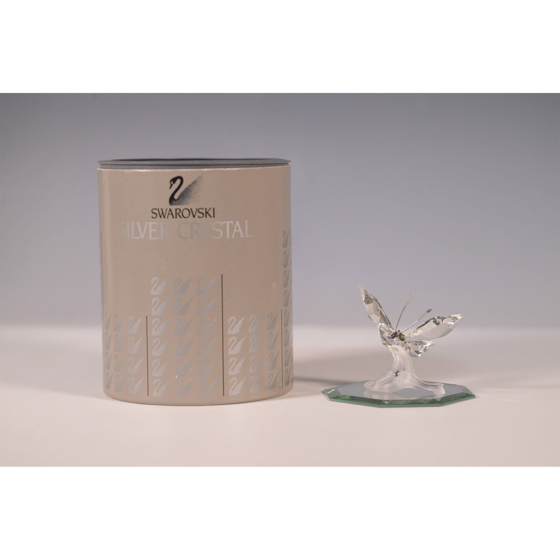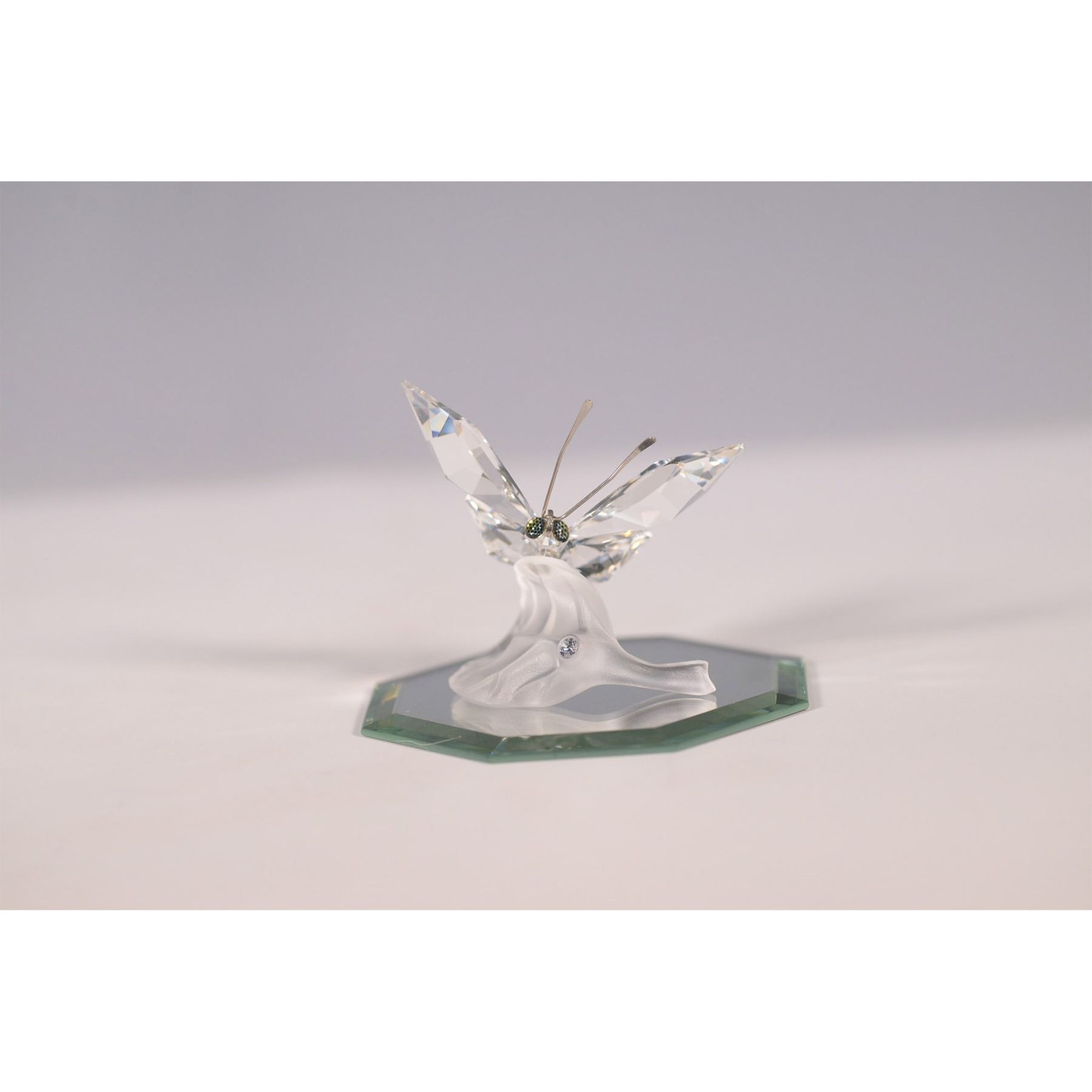 Elegant Swarovski crystal figurine featuring a delicate butterfly with intricately faceted clear crystal wings, perched on a frosted crystal stem attached to a mirrored base. The butterfly's antennae are accented with fine metal detailing, adding to the exquisite craftsmanship of this piece. Designed to capture and reflect light beautifully, this collectible embodies Swarovski's signature brilliance. Includes the original Swarovski Silver Crystal packaging. 182920.