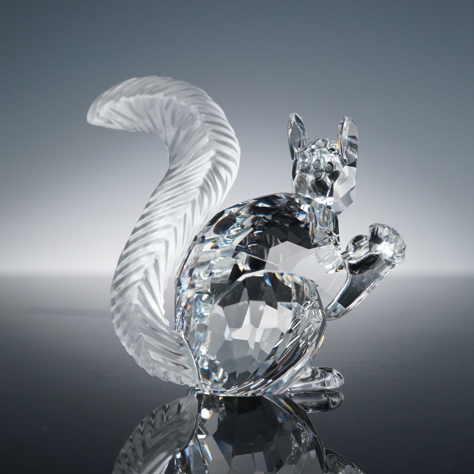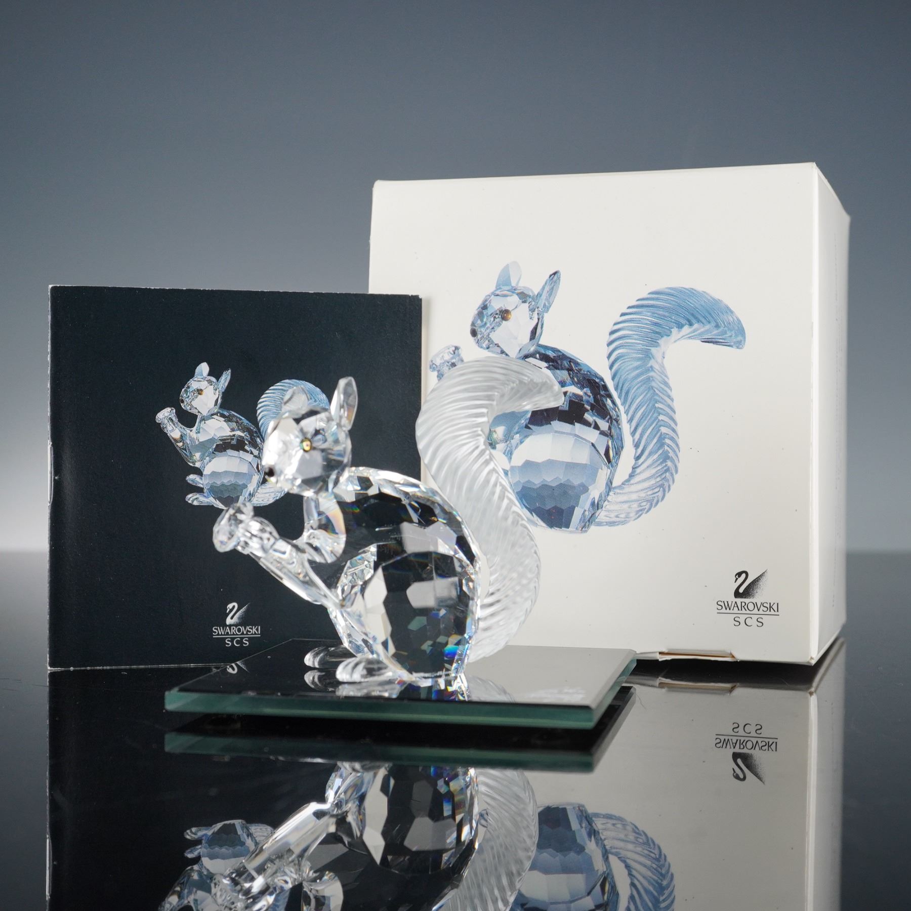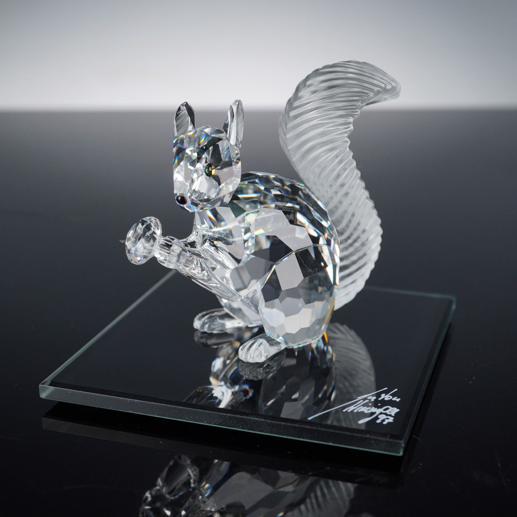 Exquisite Swarovski Crystal Society (SCS) 10th Anniversary Squirrel figurine, issued in 1997 and designed by Anton Hirzinger. Created to celebrate a decade of the SCS collection (1987-1997), this charming crystal squirrel features precision-cut clear facets with a finely ribbed tail and faceted acorn clasped between its paws. The figurine rests on a mirrored base, hand-signed and dated Anton Hirzinger 97, with the SCS anniversary logo also etched beneath. This special signed edition embodies the artistry and excellence for which Swarovski is renowned. Includes the original SCS box, certificate and anniversary display mirror. 208433.