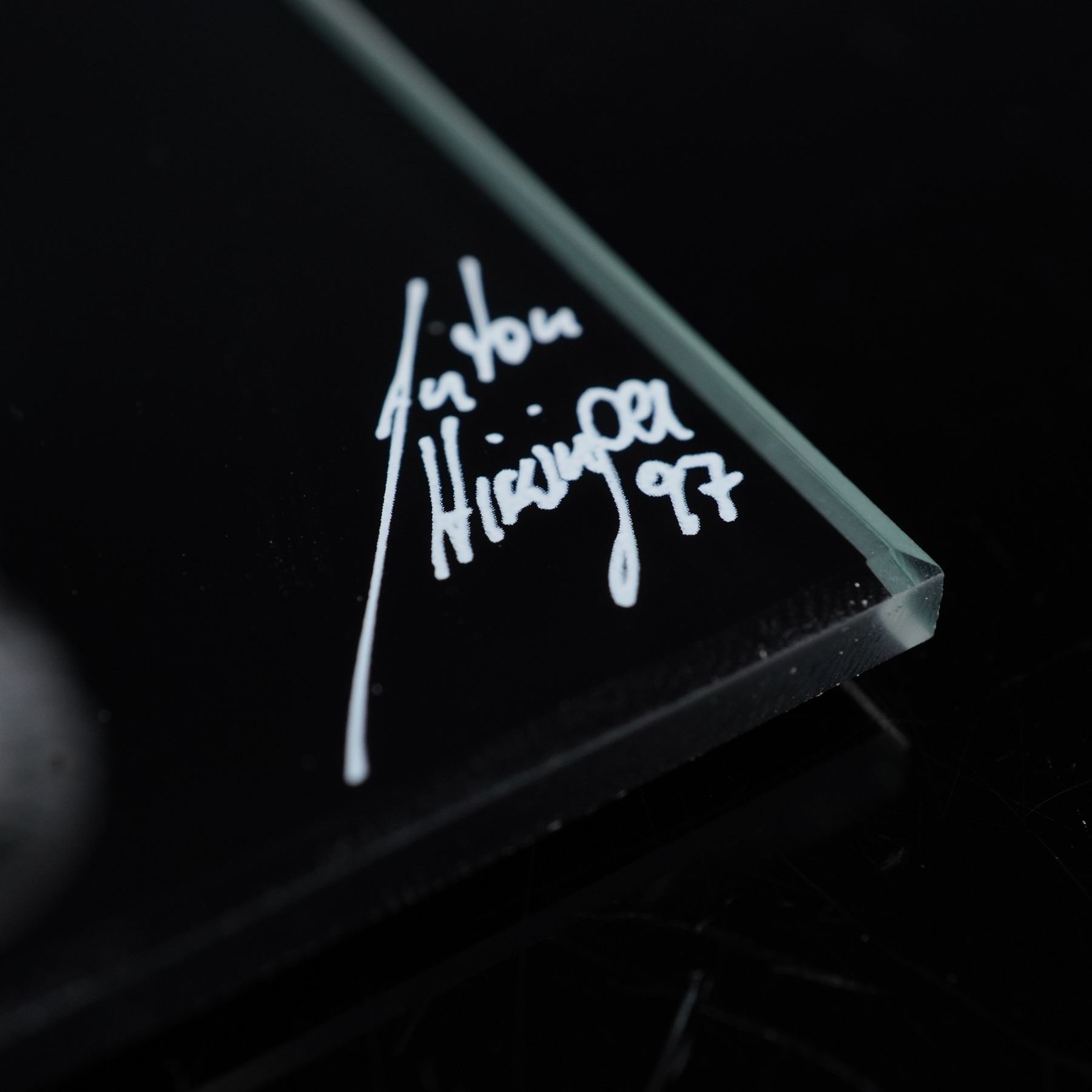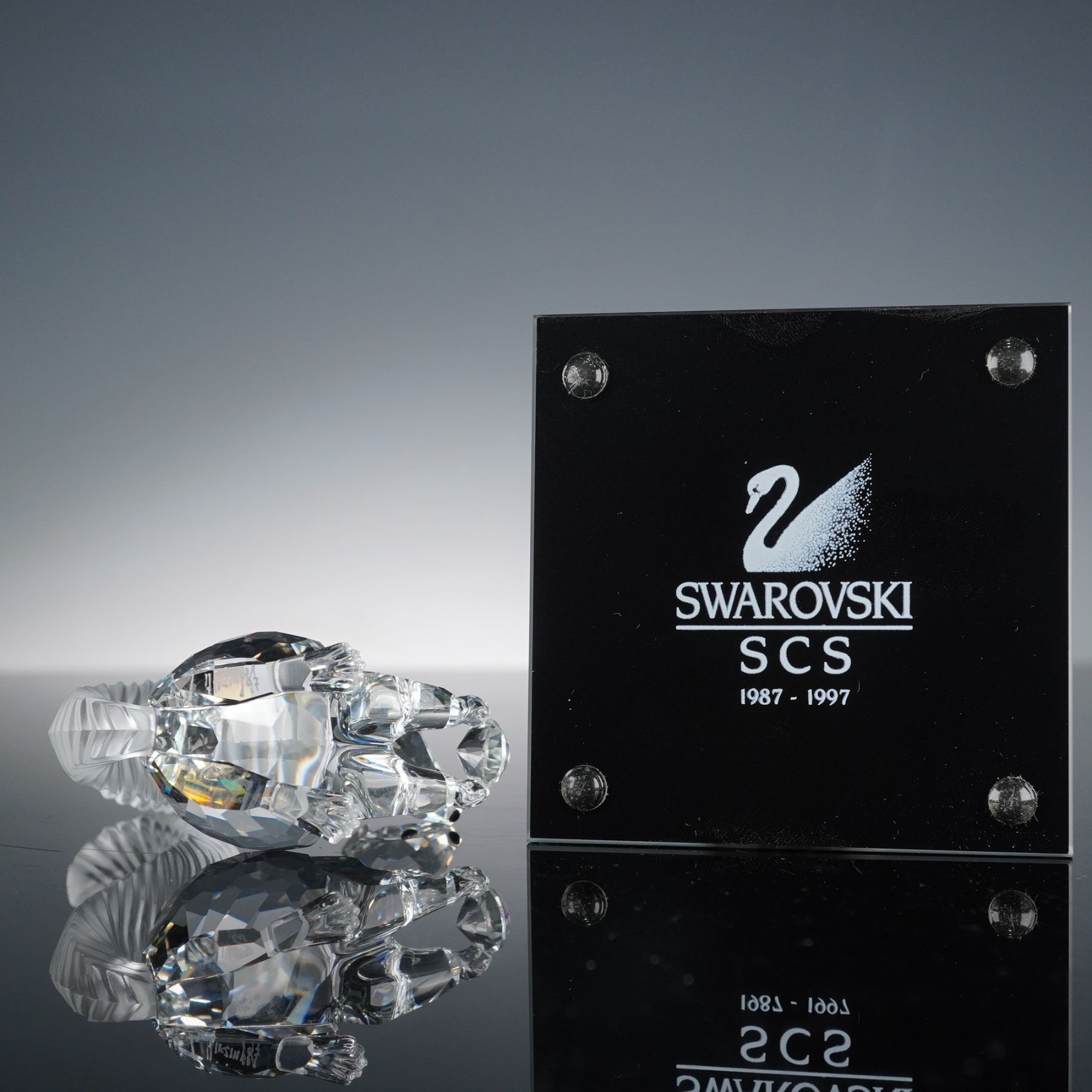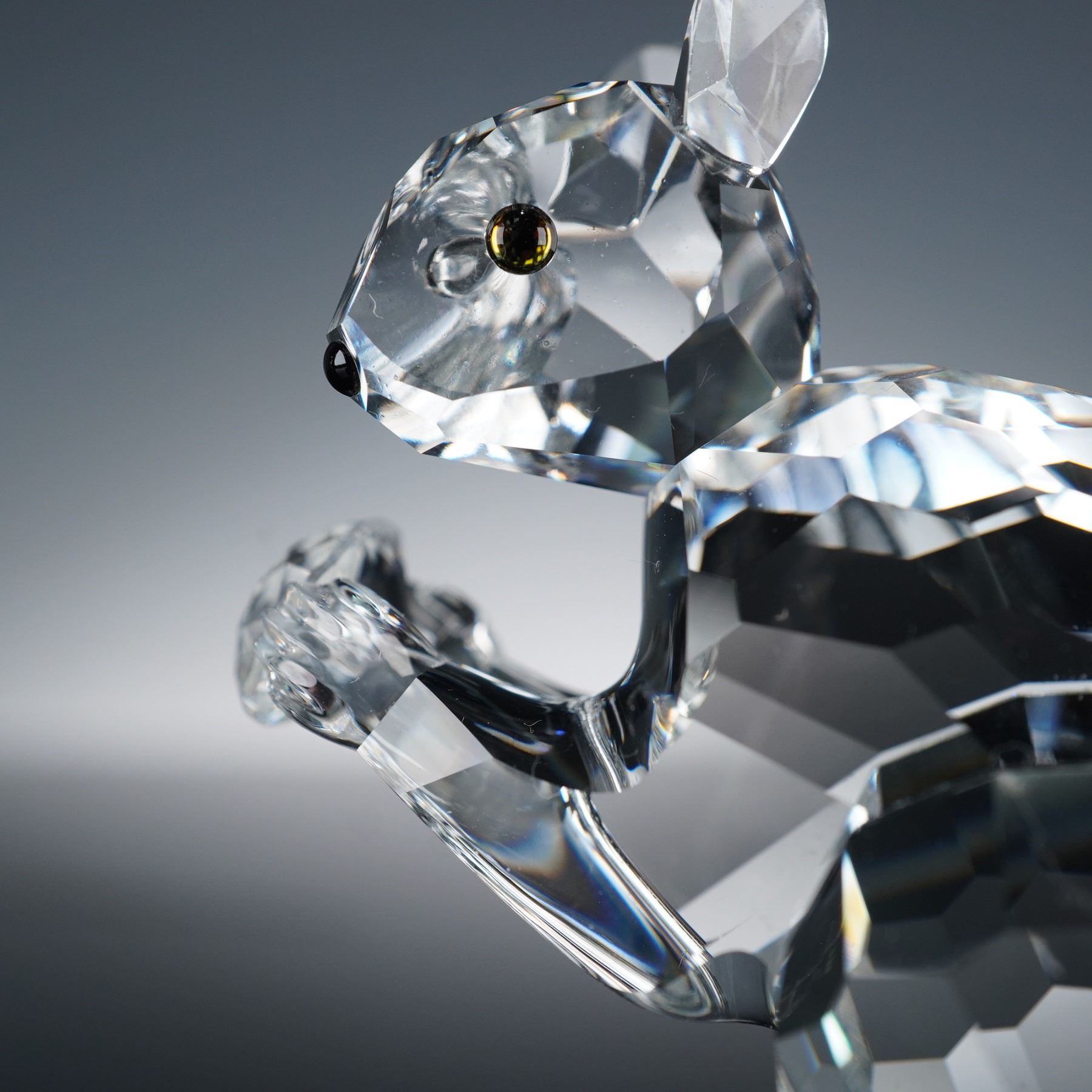 Exquisite Swarovski Crystal Society (SCS) 10th Anniversary Squirrel figurine, issued in 1997 and designed by Anton Hirzinger. Created to celebrate a decade of the SCS collection (1987-1997), this charming crystal squirrel features precision-cut clear facets with a finely ribbed tail and faceted acorn clasped between its paws. The figurine rests on a mirrored base, hand-signed and dated Anton Hirzinger 97, with the SCS anniversary logo also etched beneath. This special signed edition embodies the artistry and excellence for which Swarovski is renowned. Includes the original SCS box, certificate and anniversary display mirror. 208433.