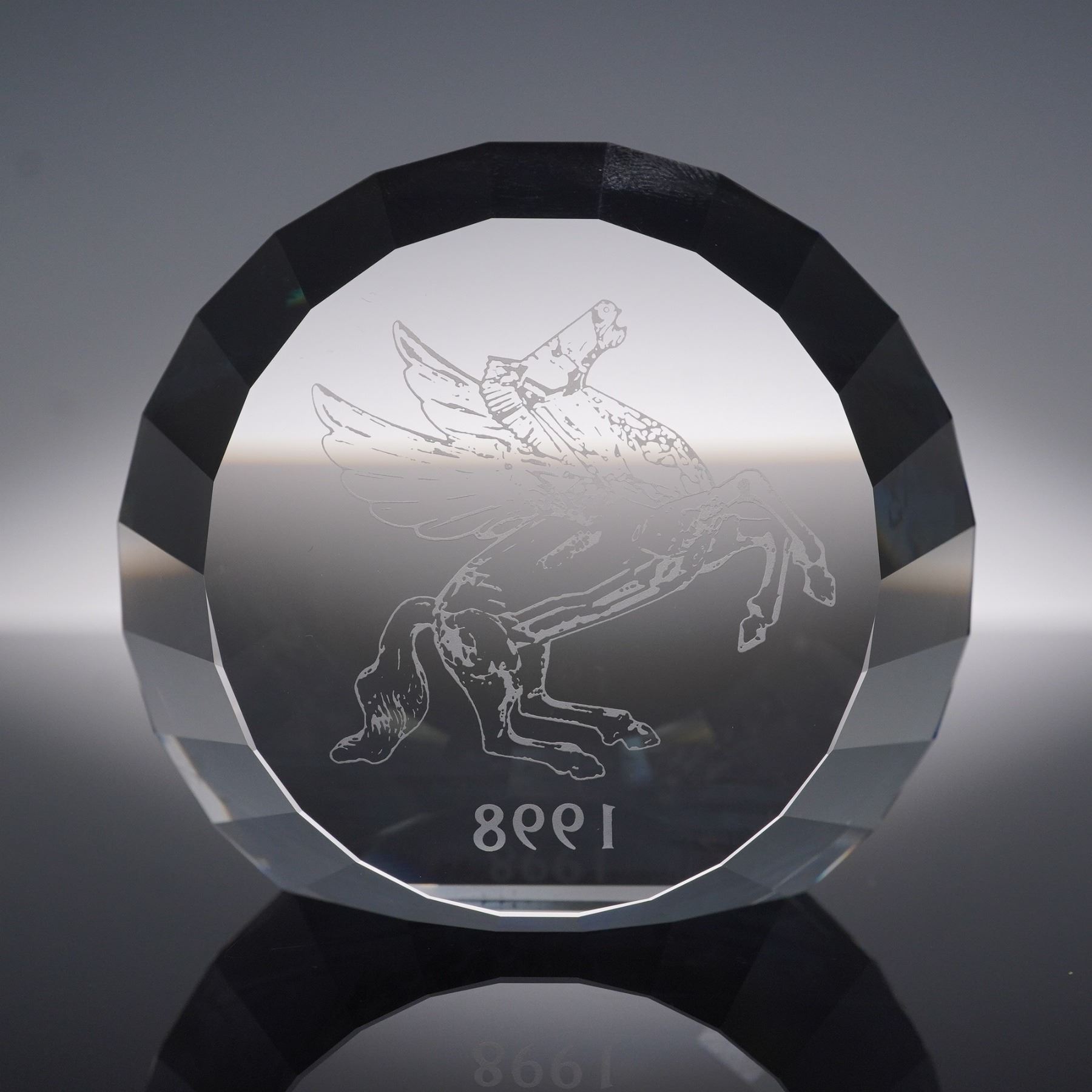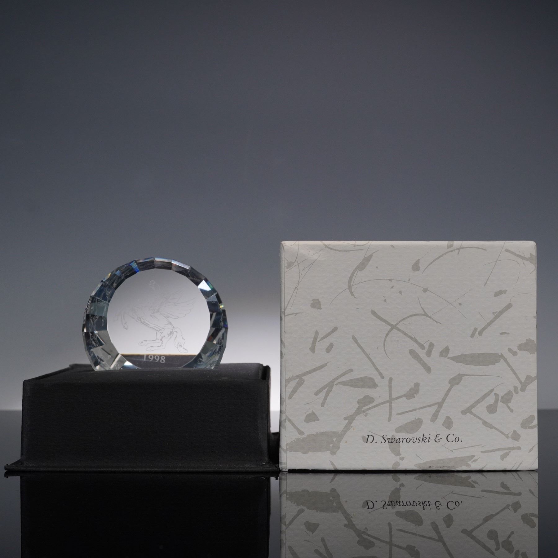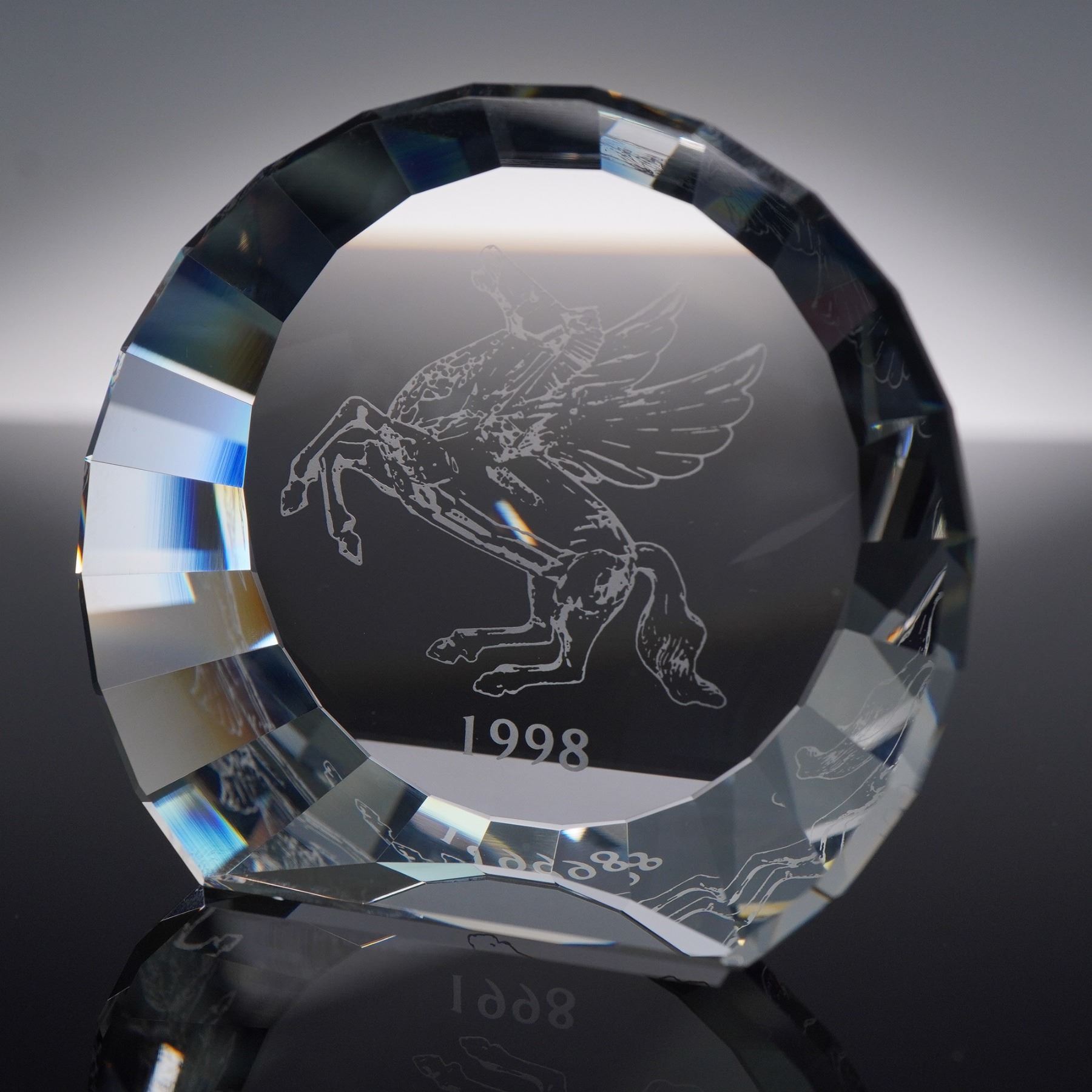 1998 etched crystal disc with Pegasus prominently displayed in center with year below. This item has its original box.