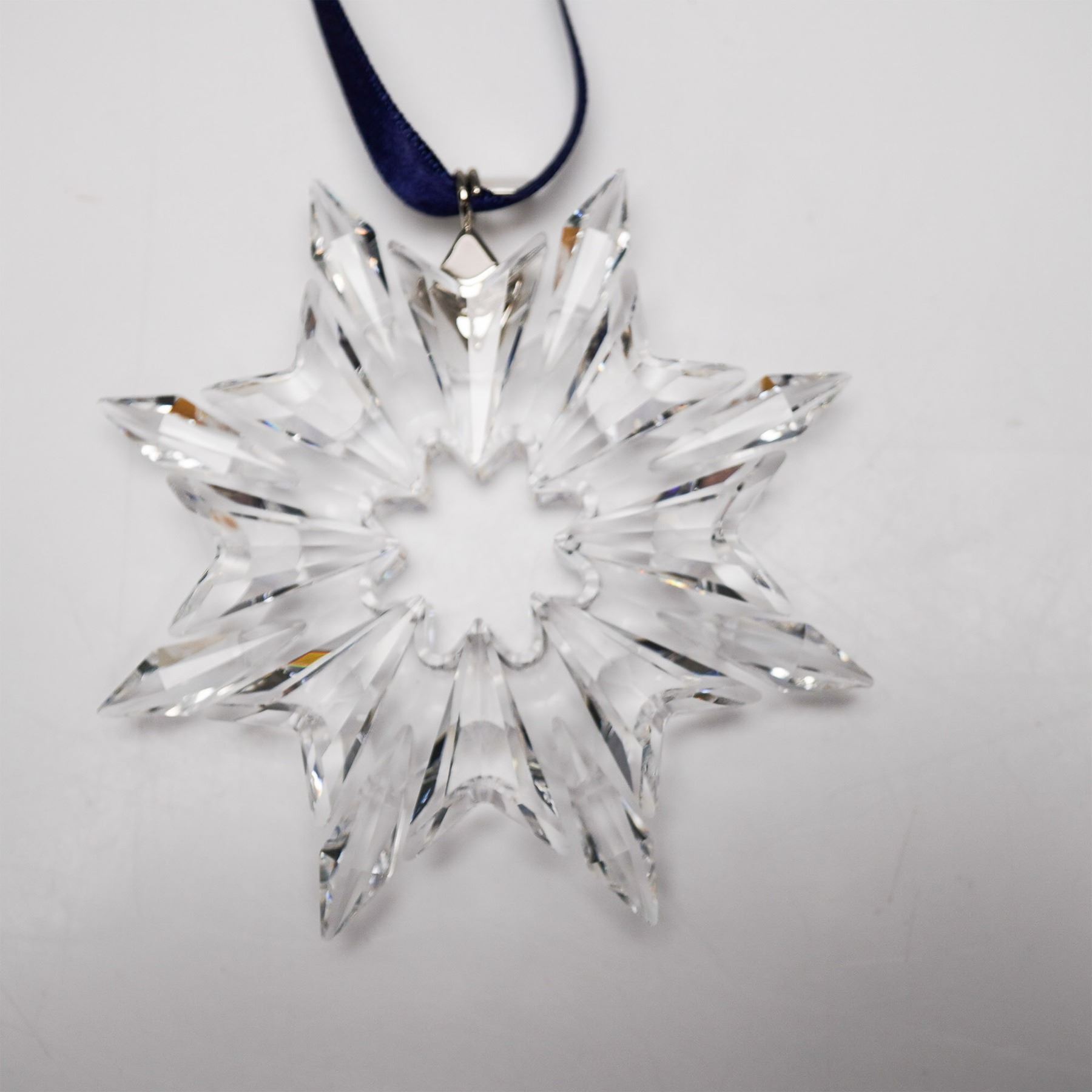 Swarovski Crystal 2003 Annual Christmas Ornament, designed by Martin Zendron. This stunning limited-edition ornament features an intricate faceted crystal snowflake with a metal tag engraved with the year "2003." Part of the beloved Swarovski Annual Edition ornament series, this elegant piece is a treasured holiday collectible, reflecting the brand's expert craftsmanship and timeless design. Includes the original triangular box.