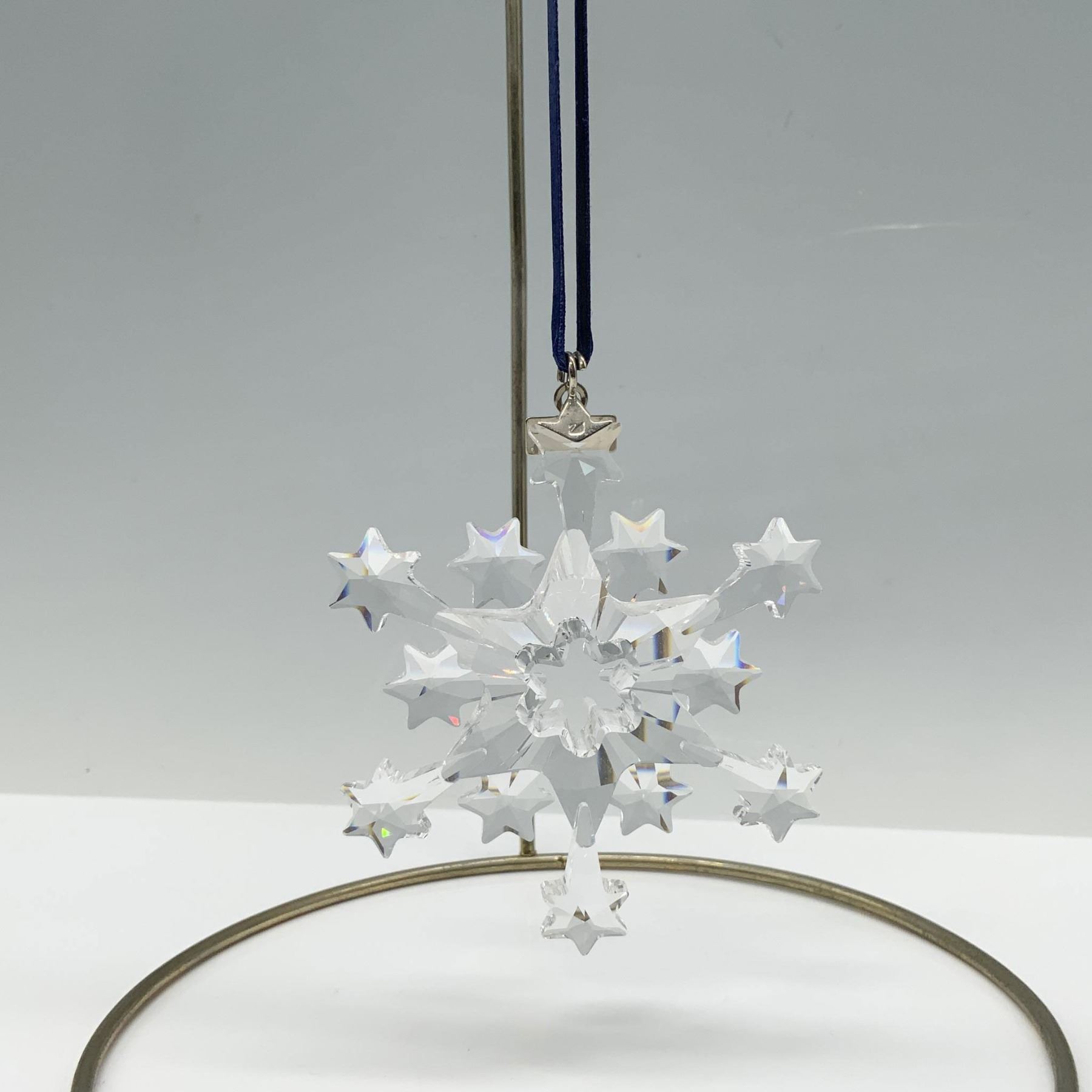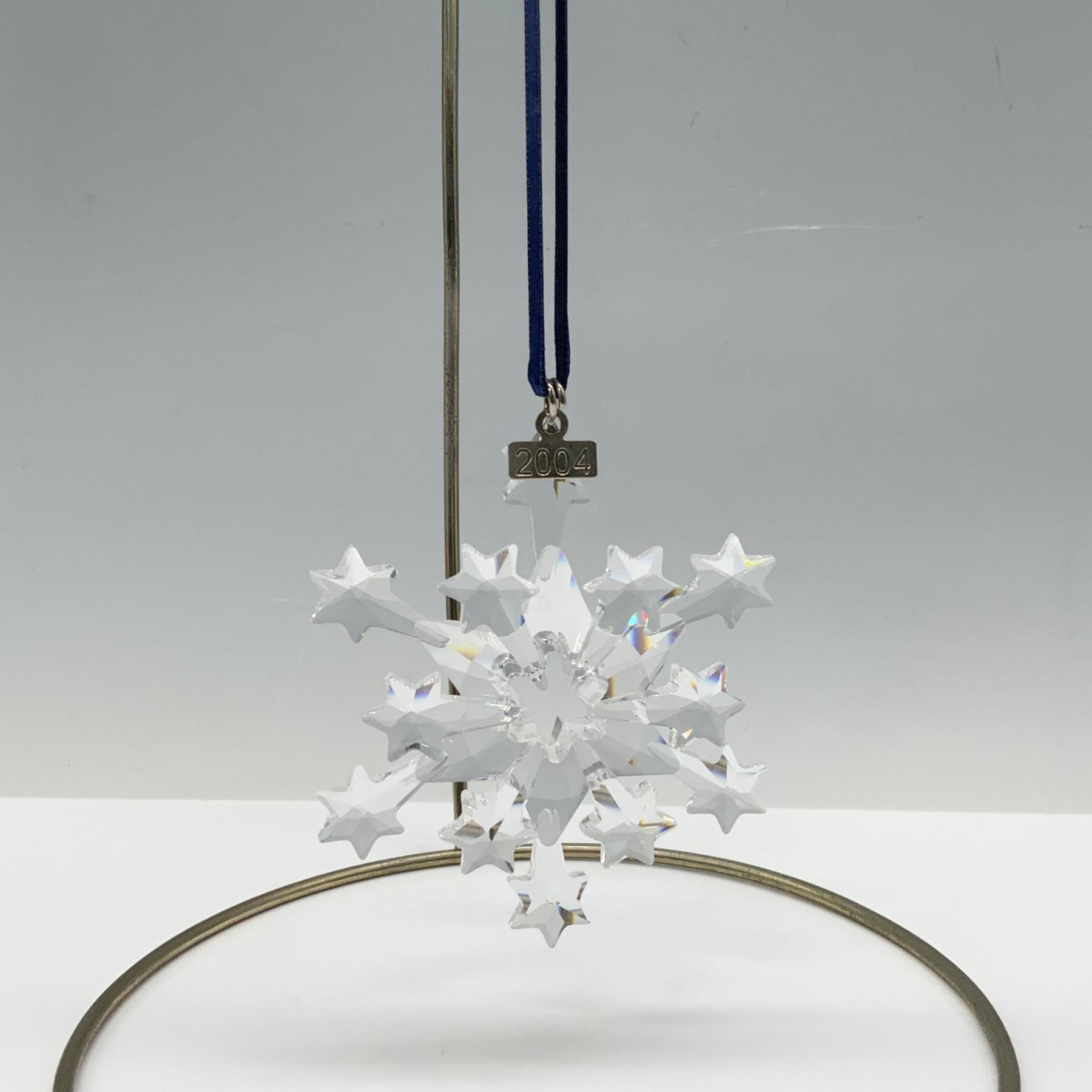Limited edition Swarovski Christmas ornament with 12 points consisting of 6 stars and 6 shooting stars as well as a metal tag with 2004 etched on it. Hung by a blue ribbon. Swarovski backstamp 631562. Artist: Edith Mair