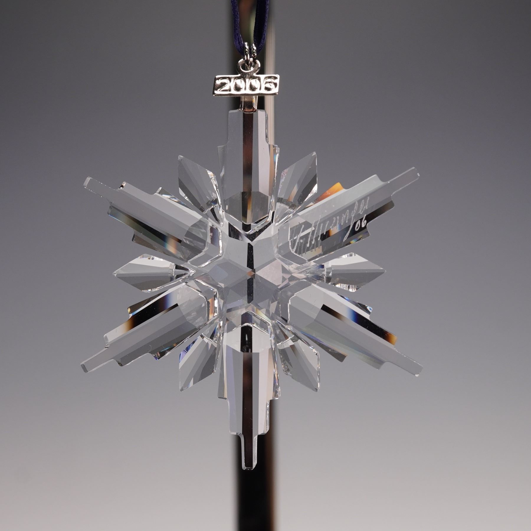 This Swarovski crystal ornament features a striking snowflake design with elongated facets that reflect light in a radiant display. It hangs from a deep blue ribbon and includes a polished silver tone tag engraved with the year 2006. The piece is signed by the designer, adding a special touch to this elegant holiday collectible. Swarovski backstamp. This item has its original box. Box measures: 6.5"L x 5.75"W x 1.25"H.