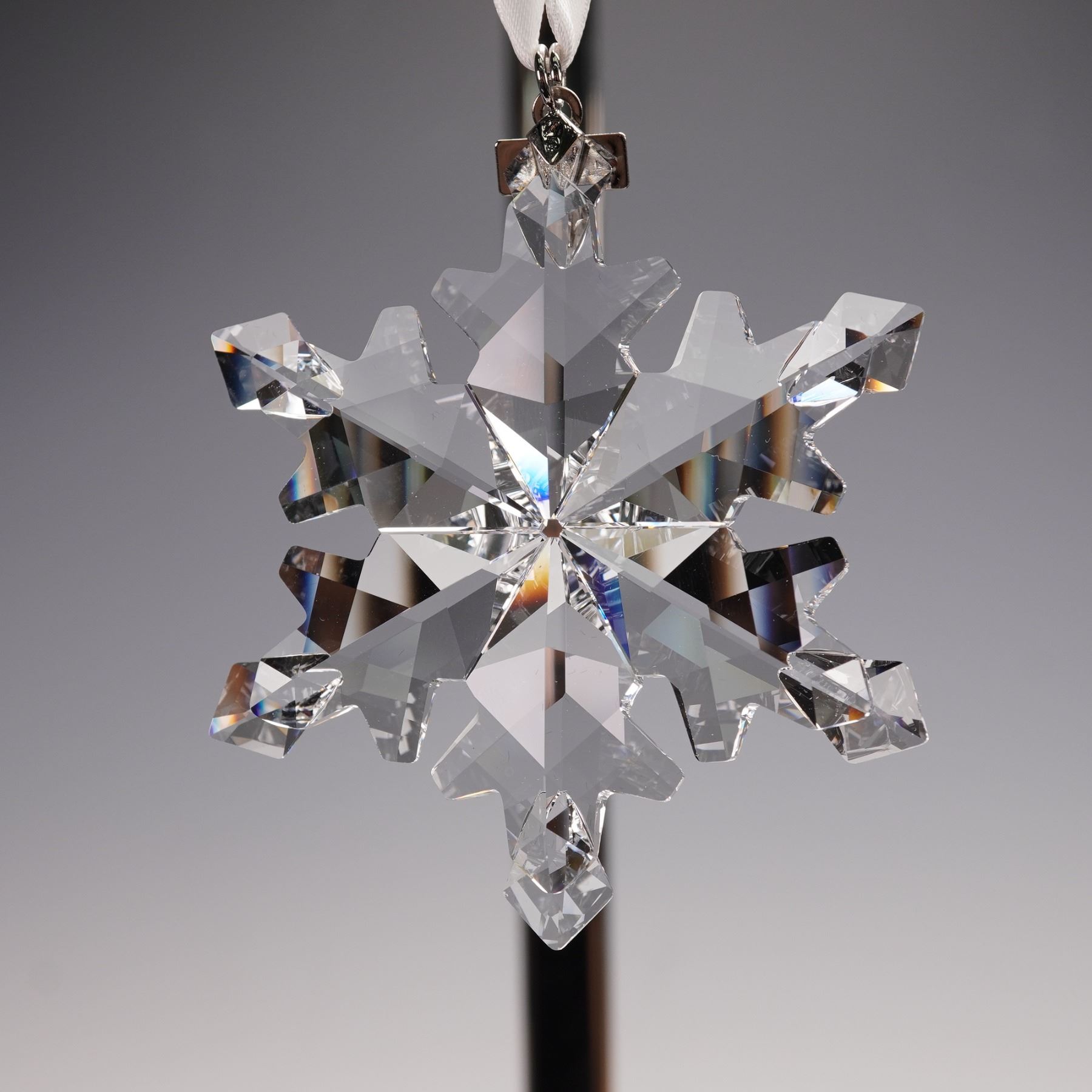 This Swarovski crystal ornament features an intricate snowflake design with precision cut facets that shimmer beautifully in the light. It hangs from a white ribbon and includes a polished silver tone tag engraved with the year 2012. A bright and elegant addition to any festive collection. Swarovski backstamp. This item has its original box. Box measures: 6.5"L x 5.75"W x 1.25"H.