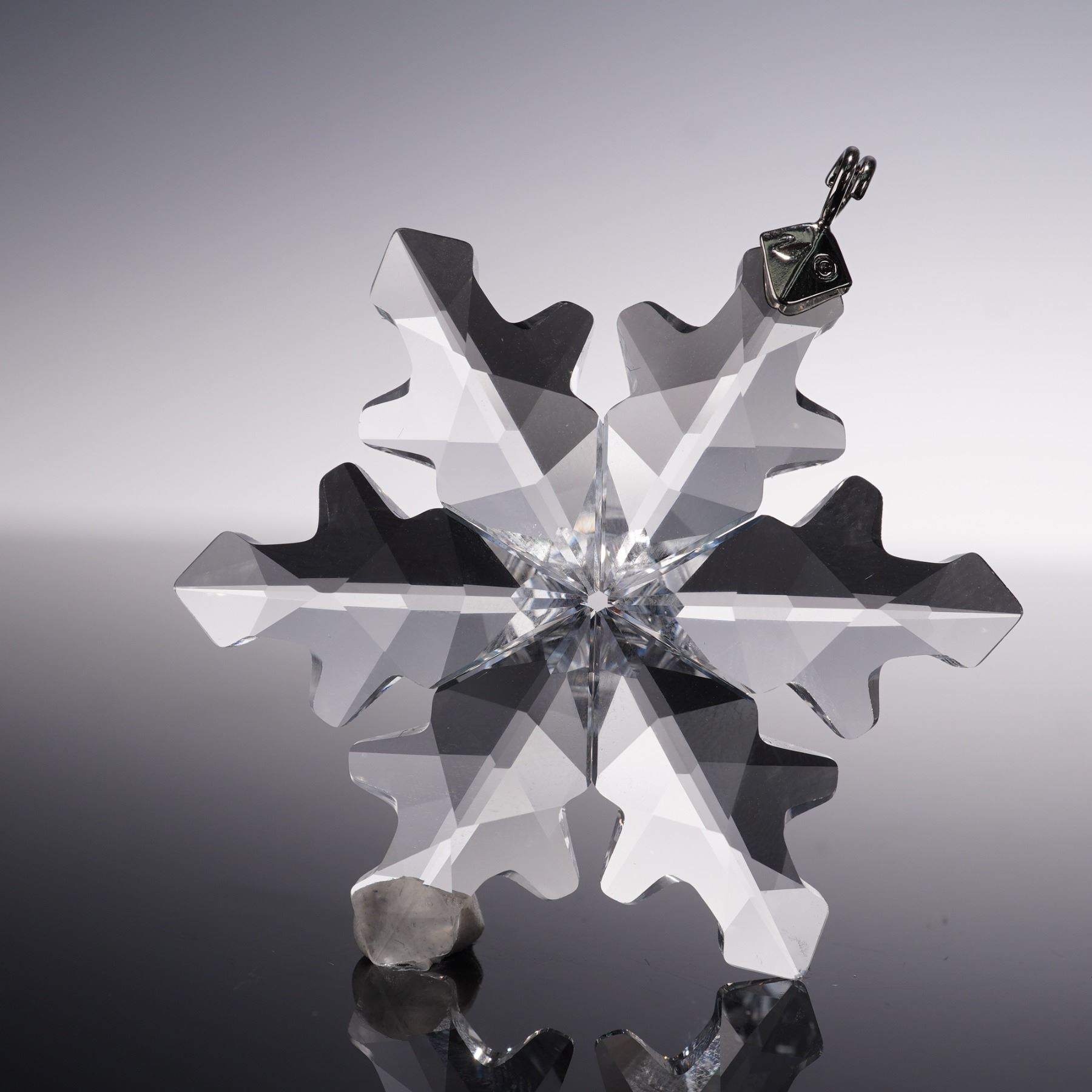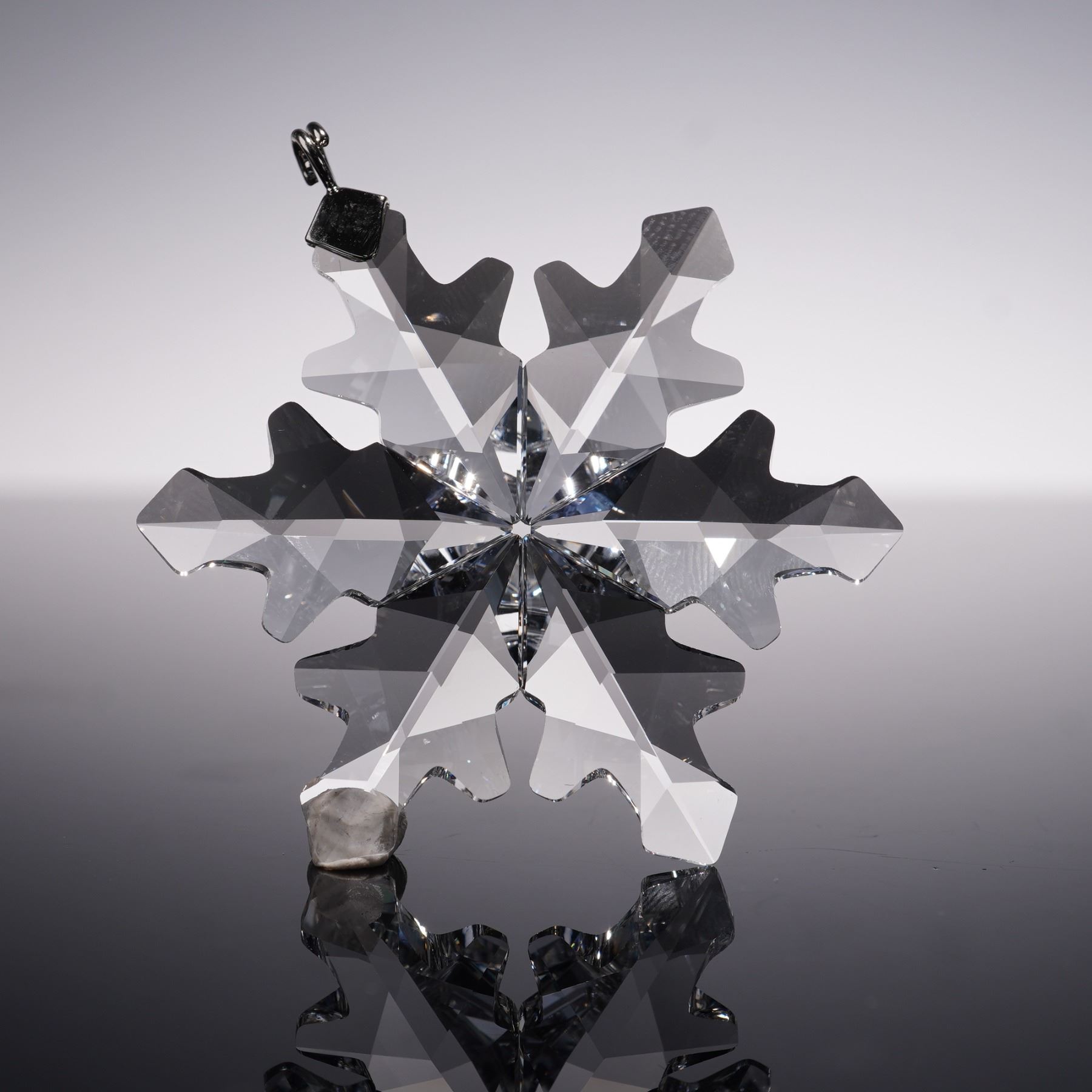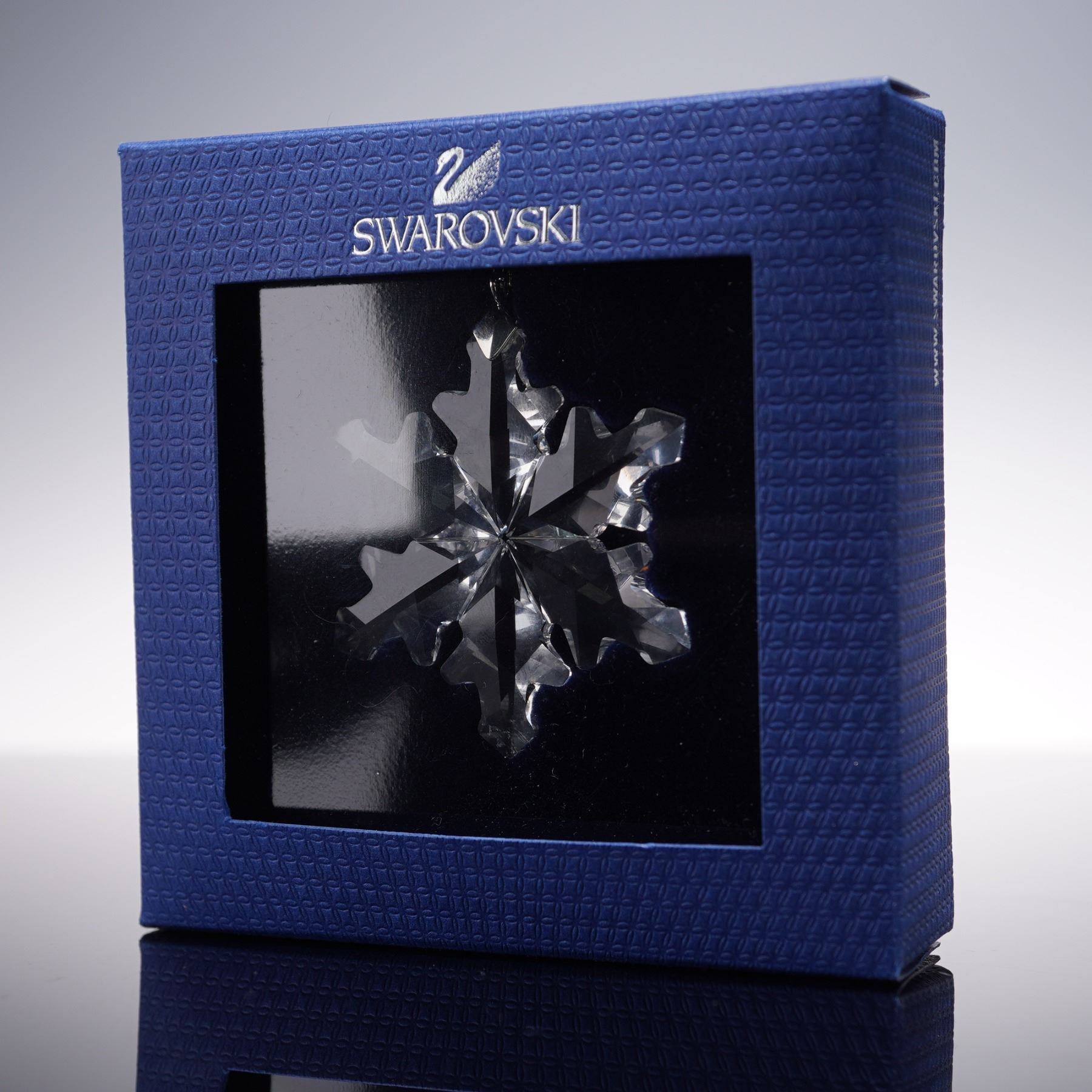 This exquisite Swarovski Crystal 2012 Christmas Ornament, Little Snowflake, model number 1139969, is a delicate and sparkling addition to your holiday decor. Crafted from clear crystal, this ornament captures the elegance of a snowflake with its intricate facets, reflecting light beautifully. For added impact, several of these snowflakes can be hung together to create a shimmering display. Comes with the original box. Includes Swarovski backstamp.