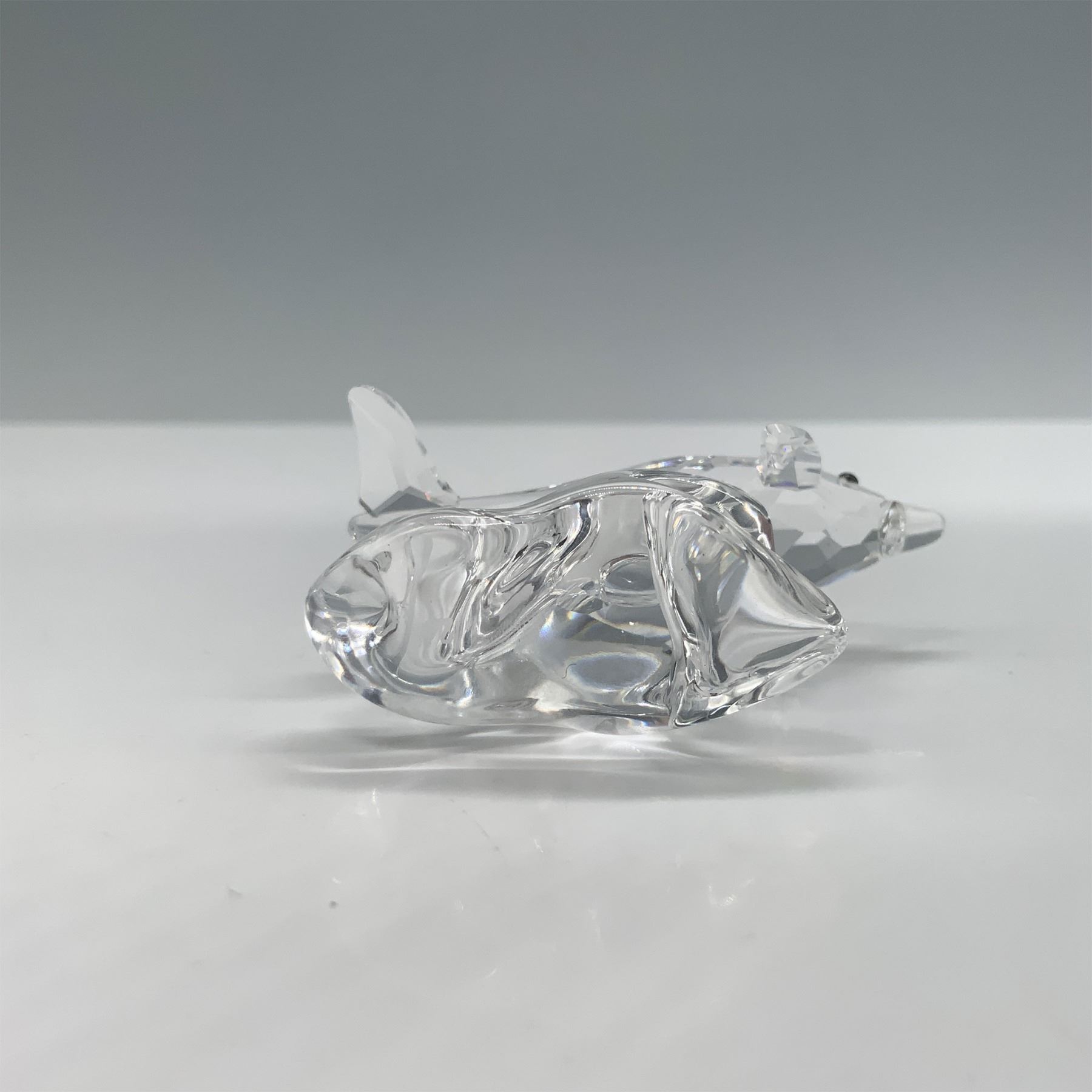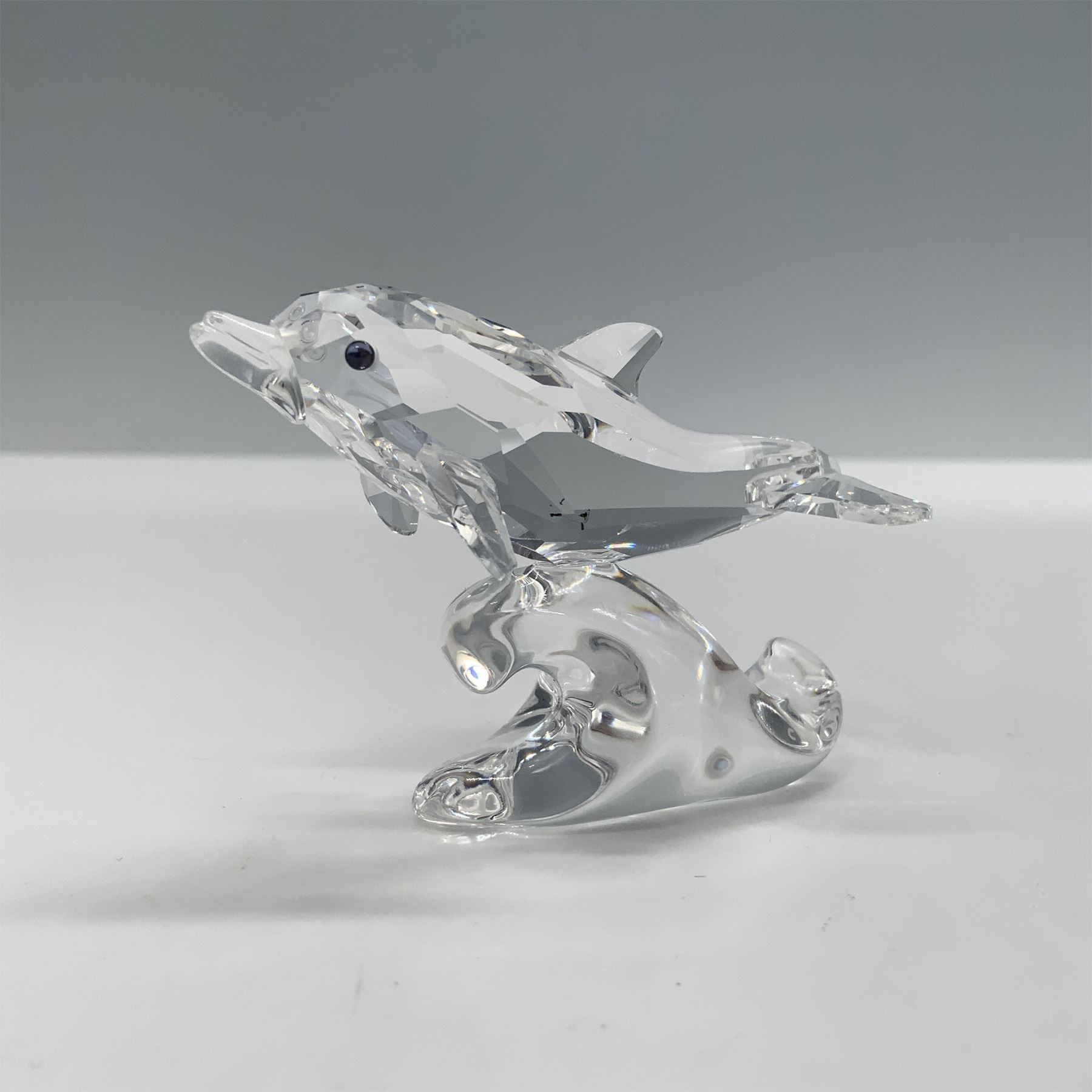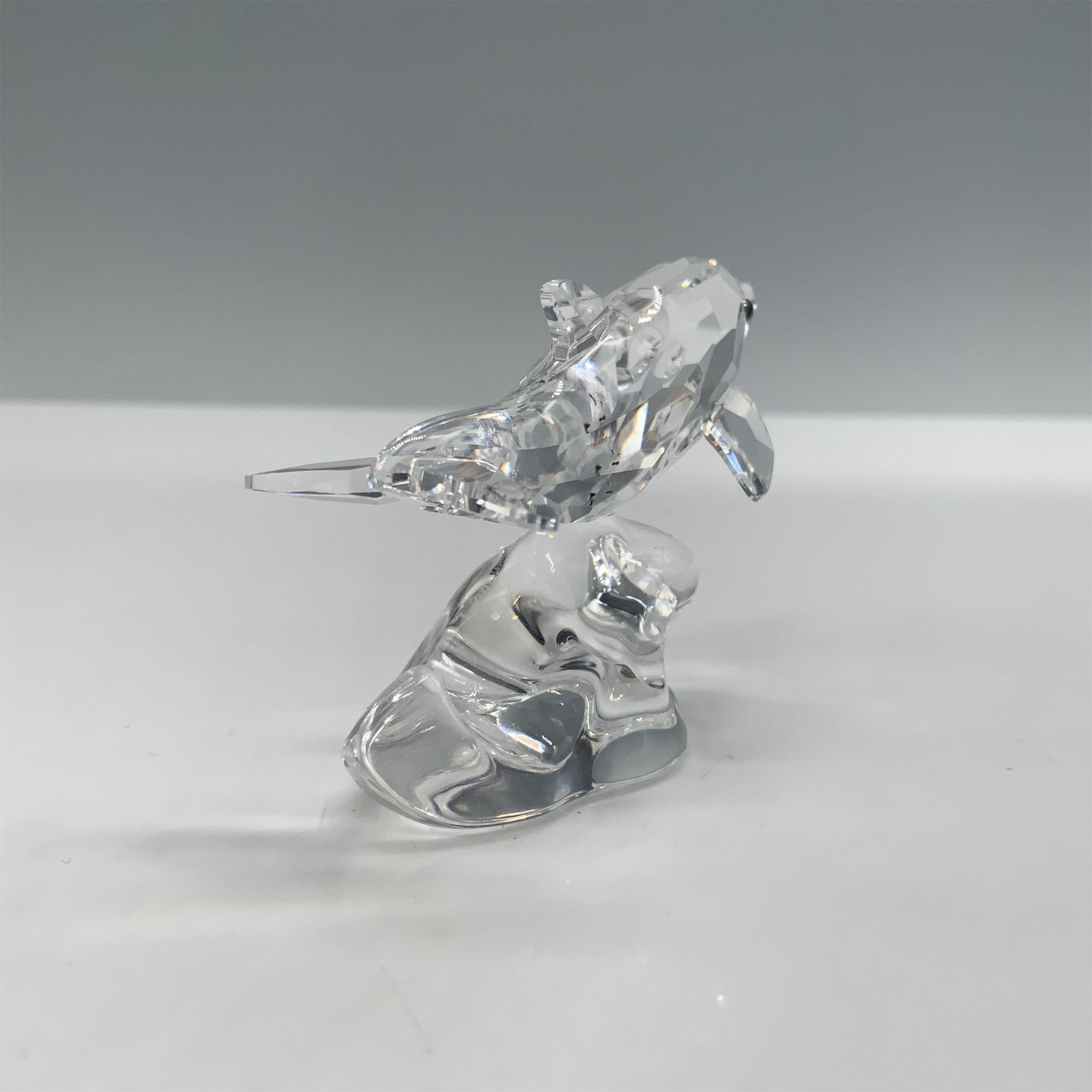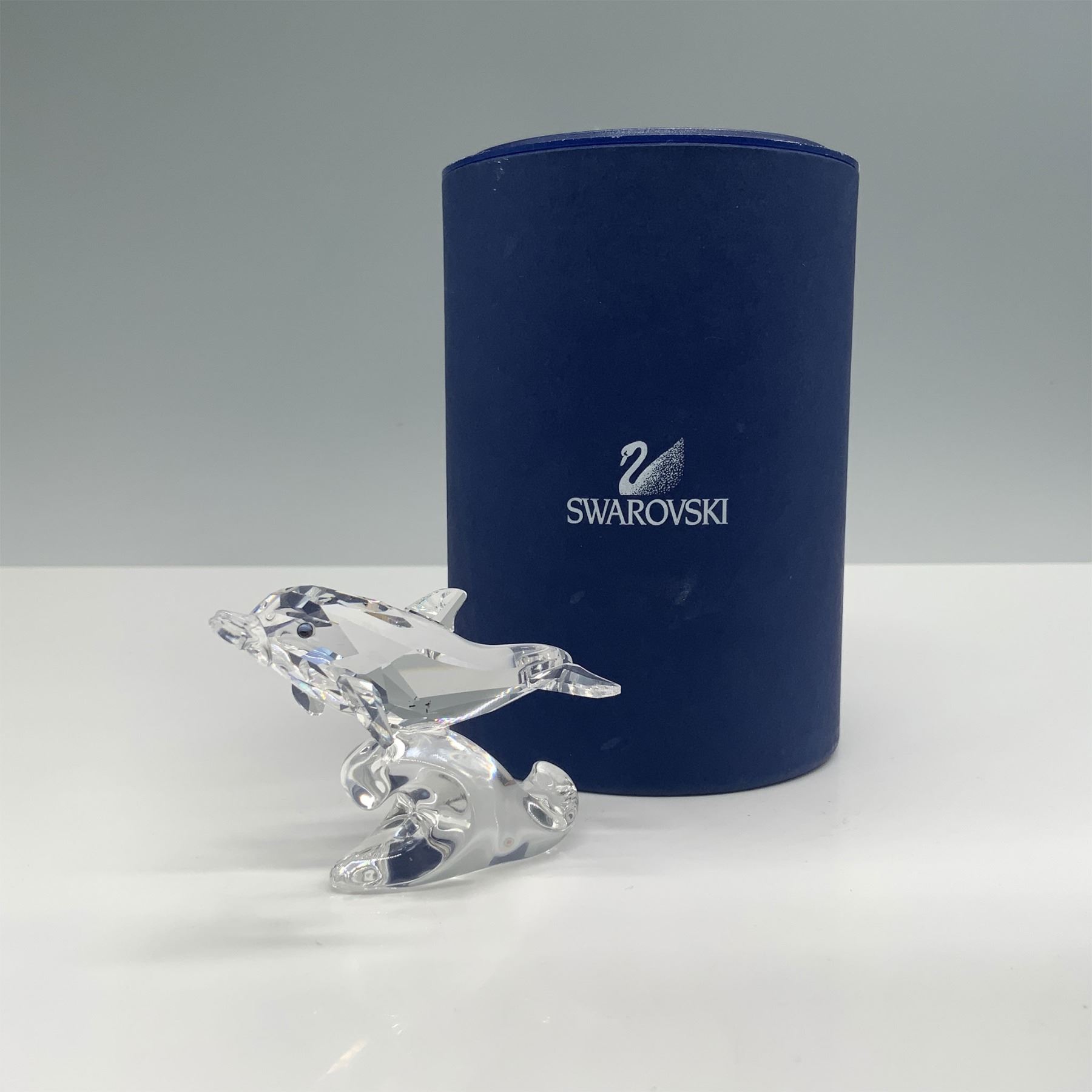 This exquisite Swarovski Crystal Baby Dolphin is a charming addition to any collection. Part of the Aquatic Worlds theme group, this piece features a faceted clear crystal dolphin with eyes in Wal crystal, gracefully riding a wave-shaped base crafted from unfaceted clear crystal. Designed by Anton Hirzinger, it was introduced in 2005 and retired in 2013. It comes complete with its original box. The Swarovski logo is discreetly etched on the piece, confirming its authenticity.