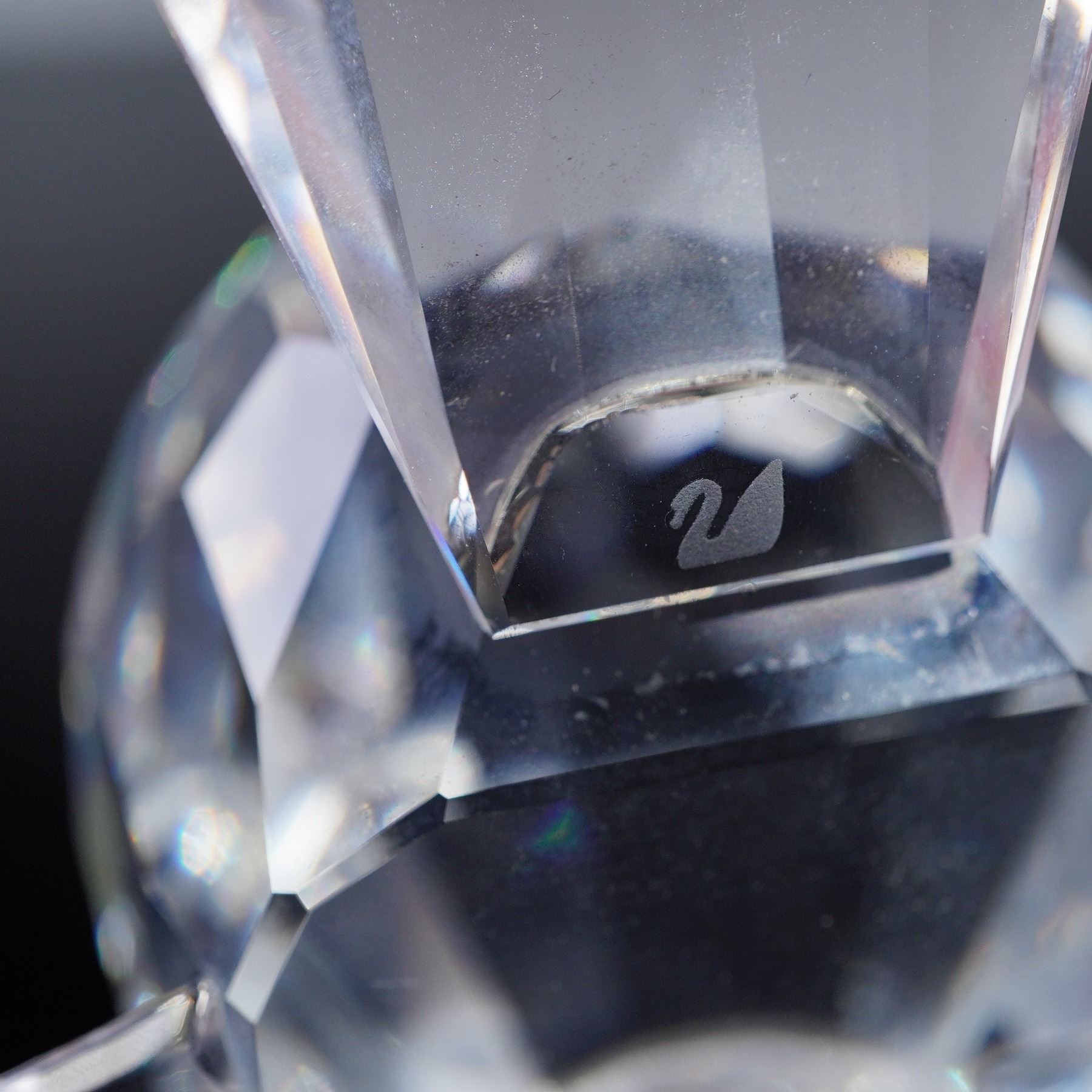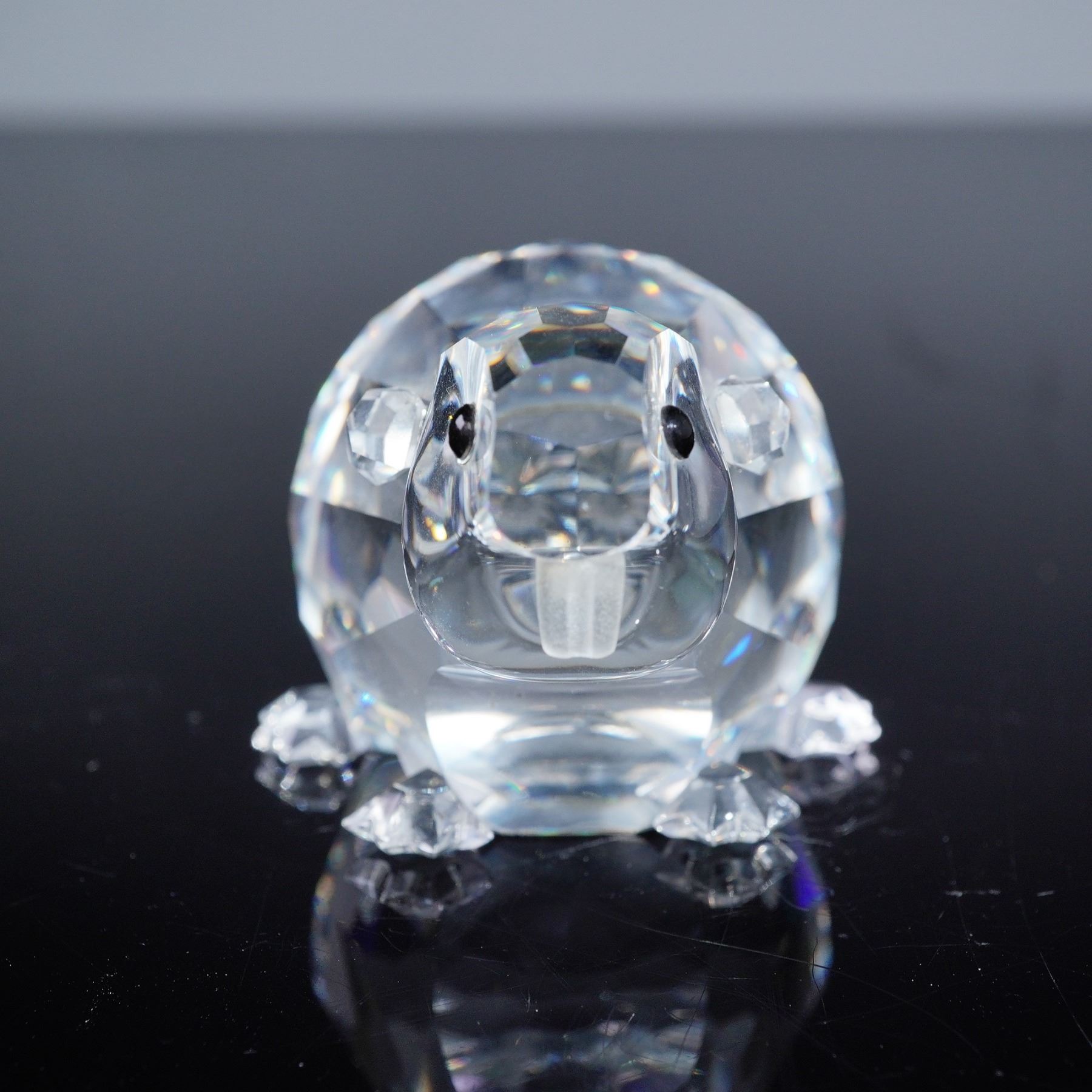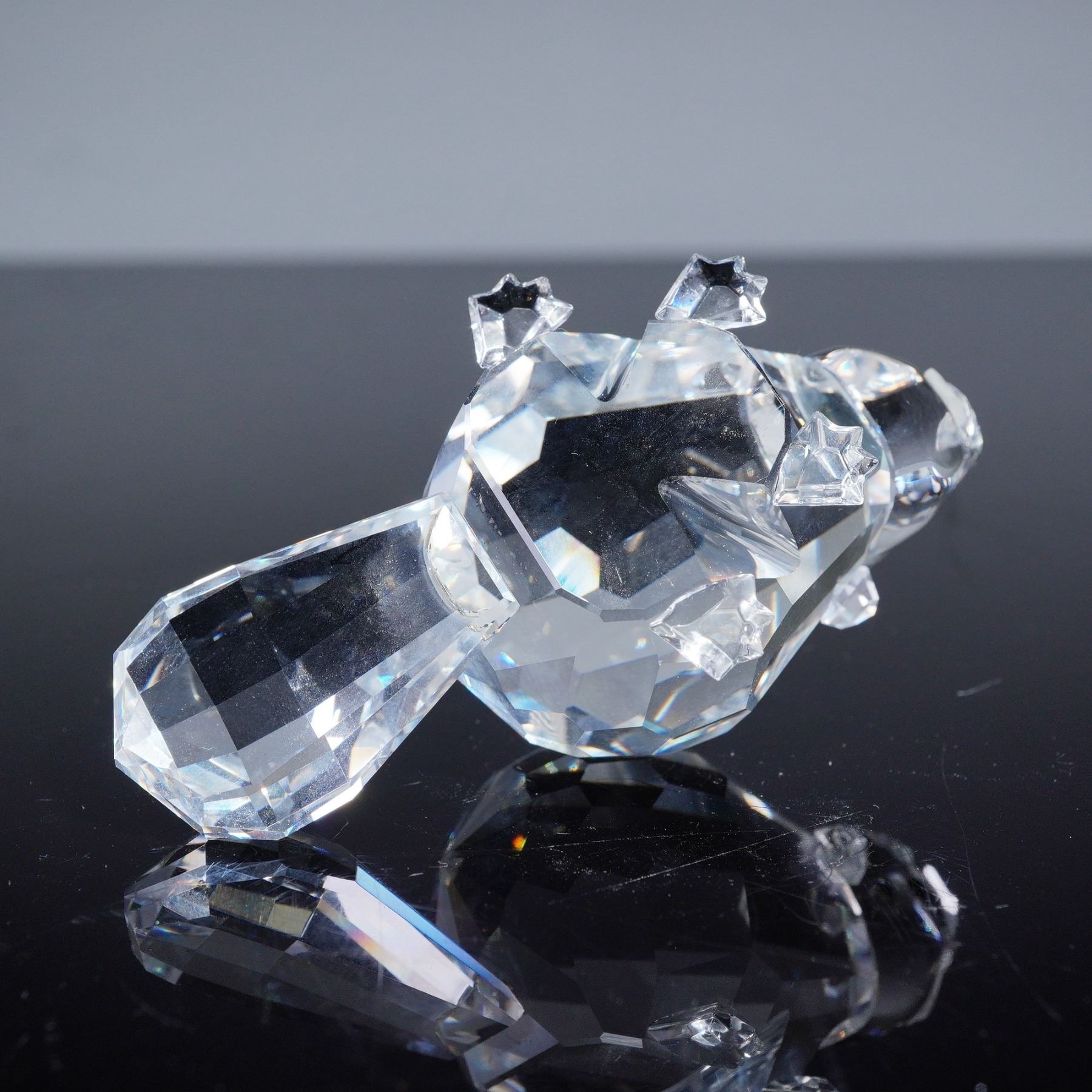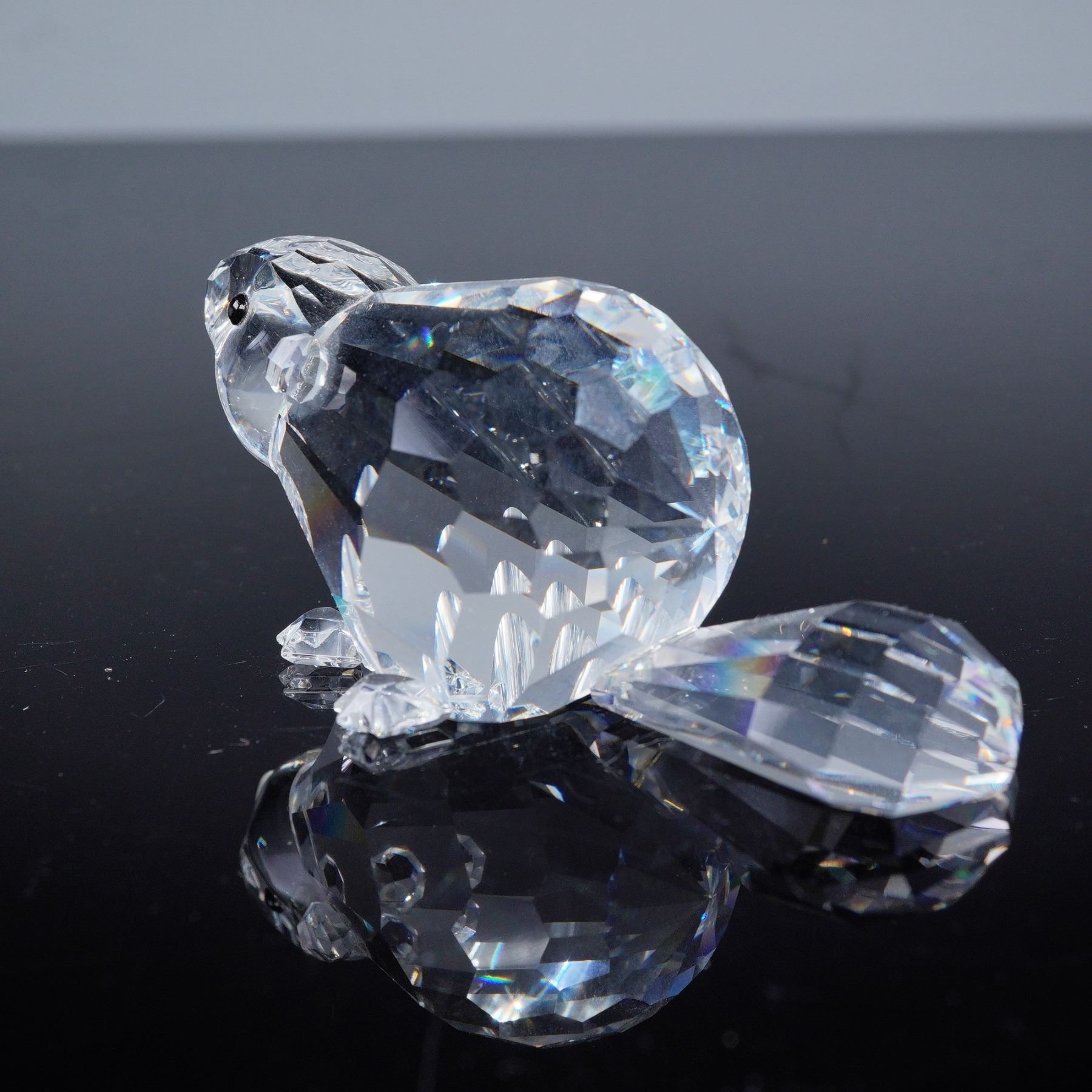 A Swarovski crystal 'Beaver Mother' figurine, model number 164637. This clear faceted crystal decorative figurine depicts a beaver in a modern, stylized form. The animal is characterized by its broad, flat tail and prominent front teeth, and is constructed from numerous polished facets that brilliantly refract light. It features small, round, inset black eyes. Swarovski etched backstamp.