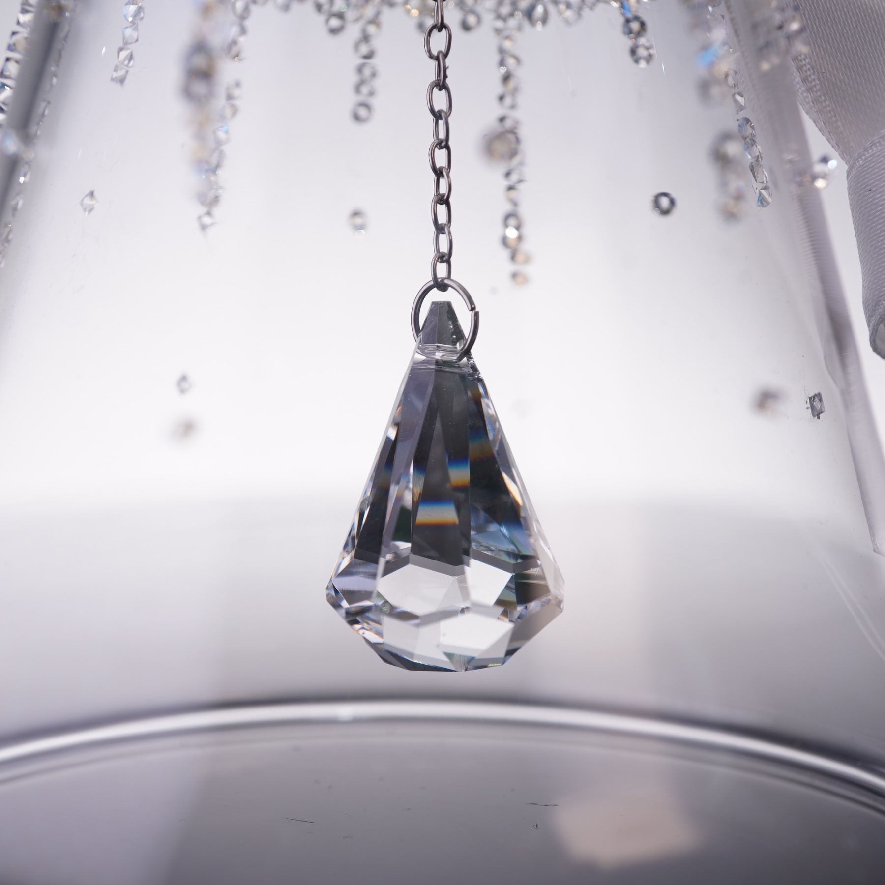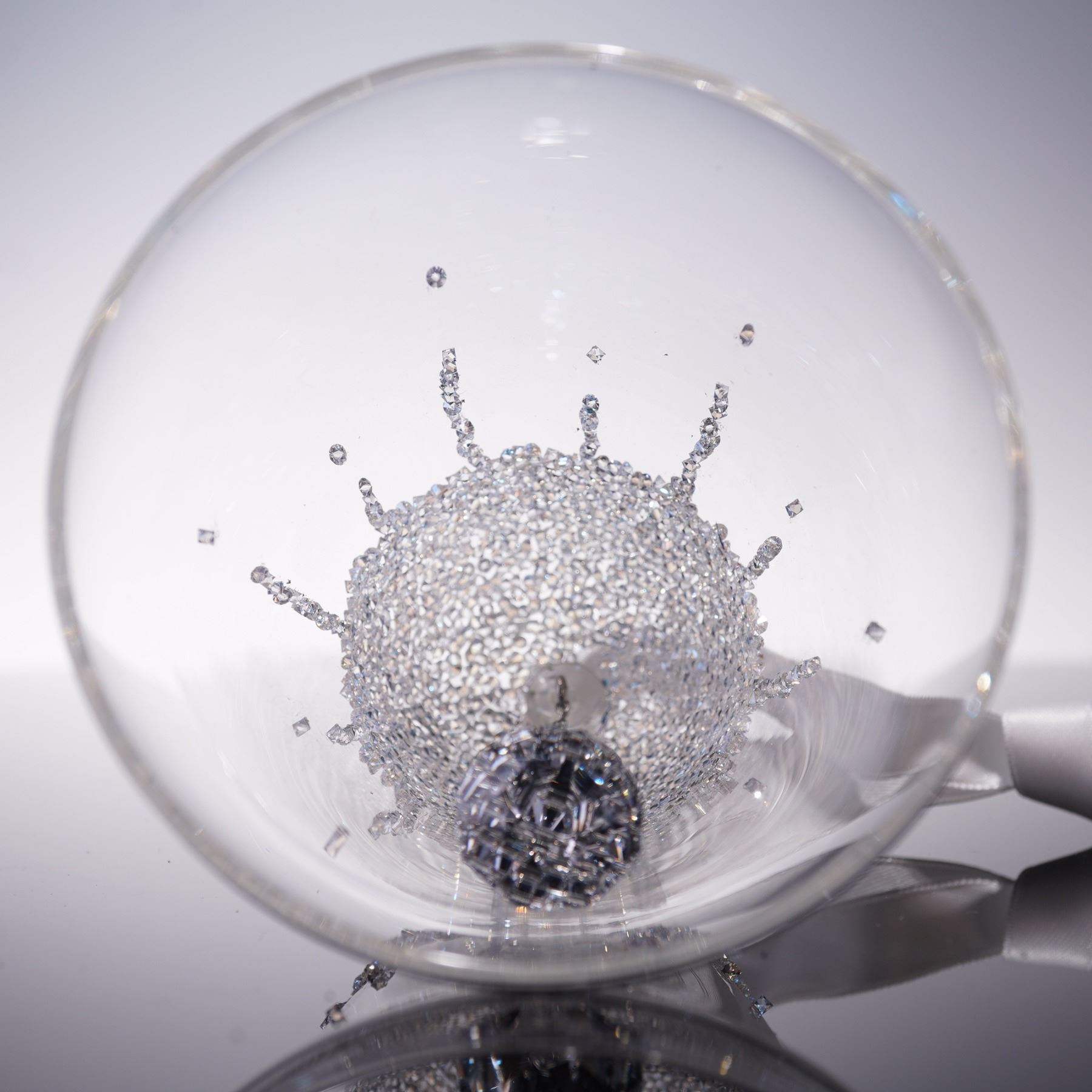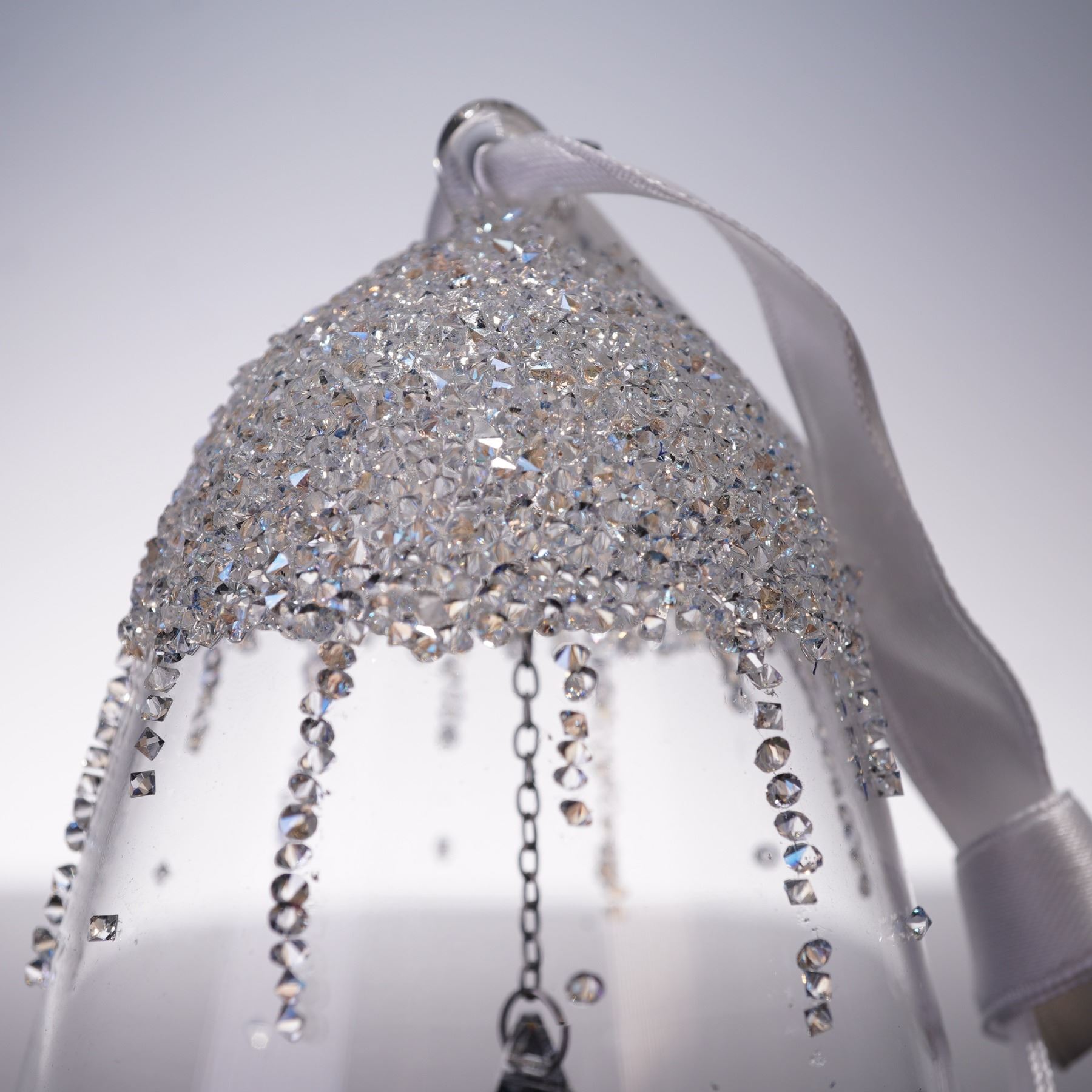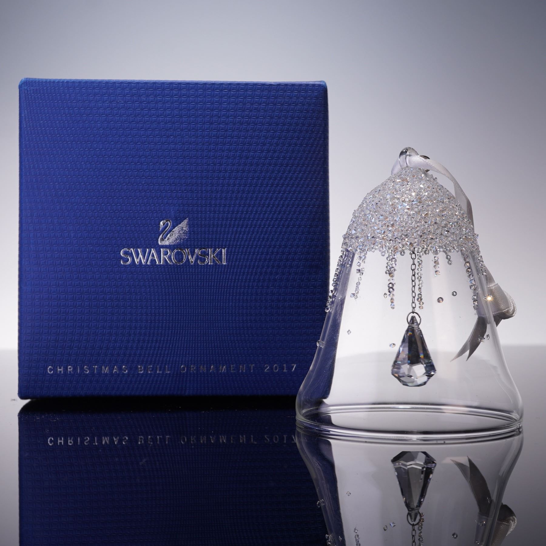 Swarovski crystal Christmas bell ornament dated 2017, crafted in clear glass with a shimmering pave crystal top and ribbon bow. A faceted crystal drop hangs suspended at the center, adding extra sparkle and light reflection. Includes the original Swarovski box.