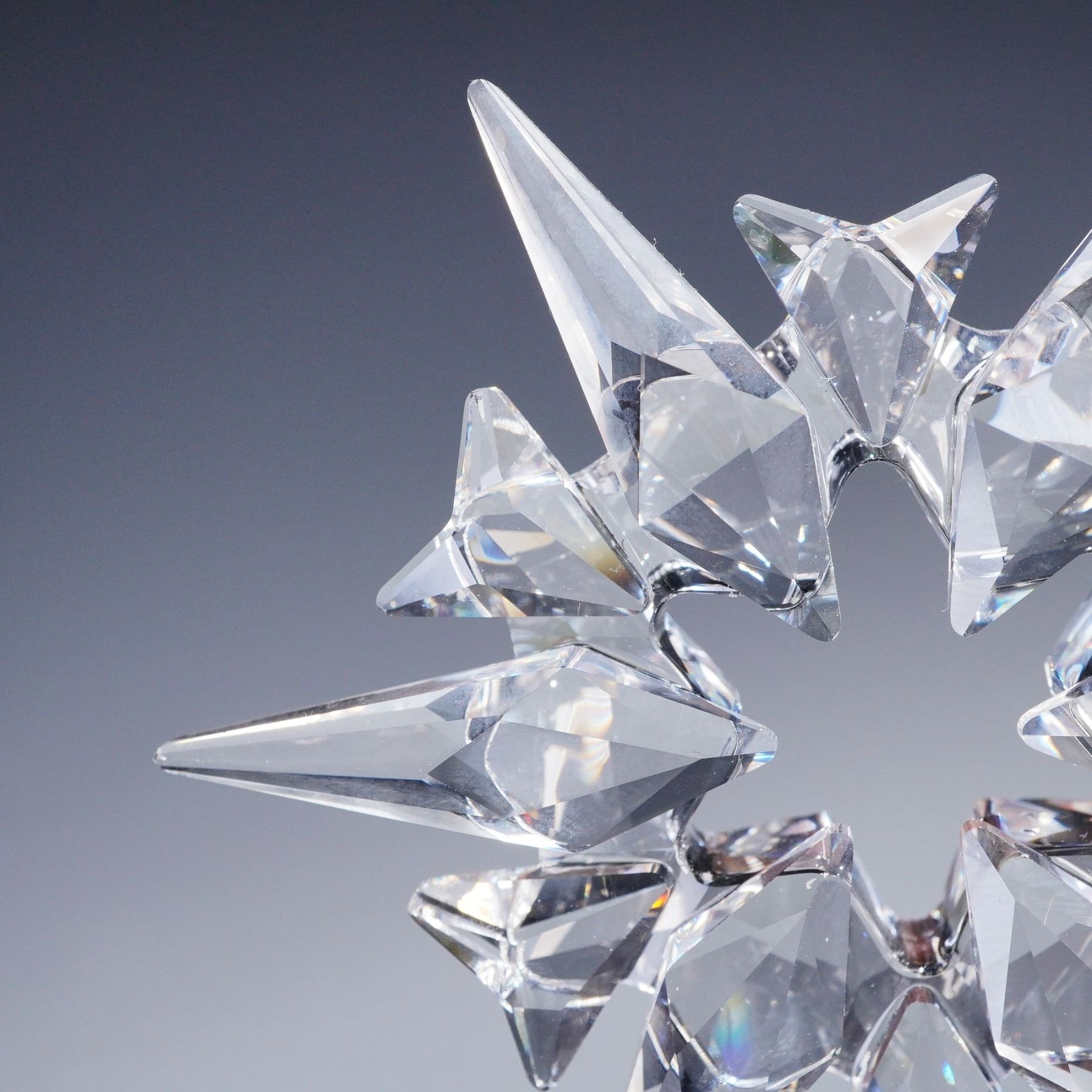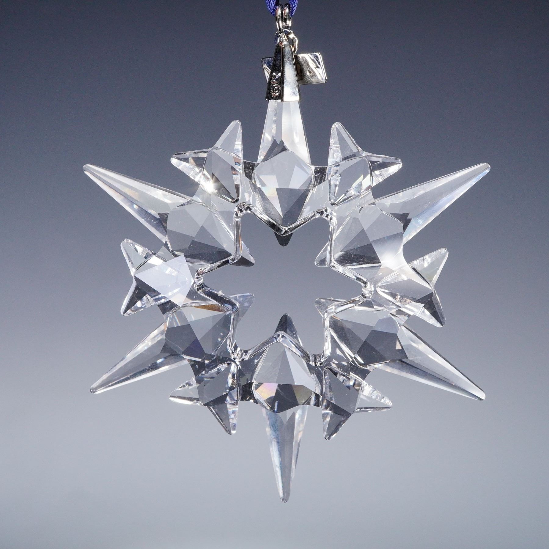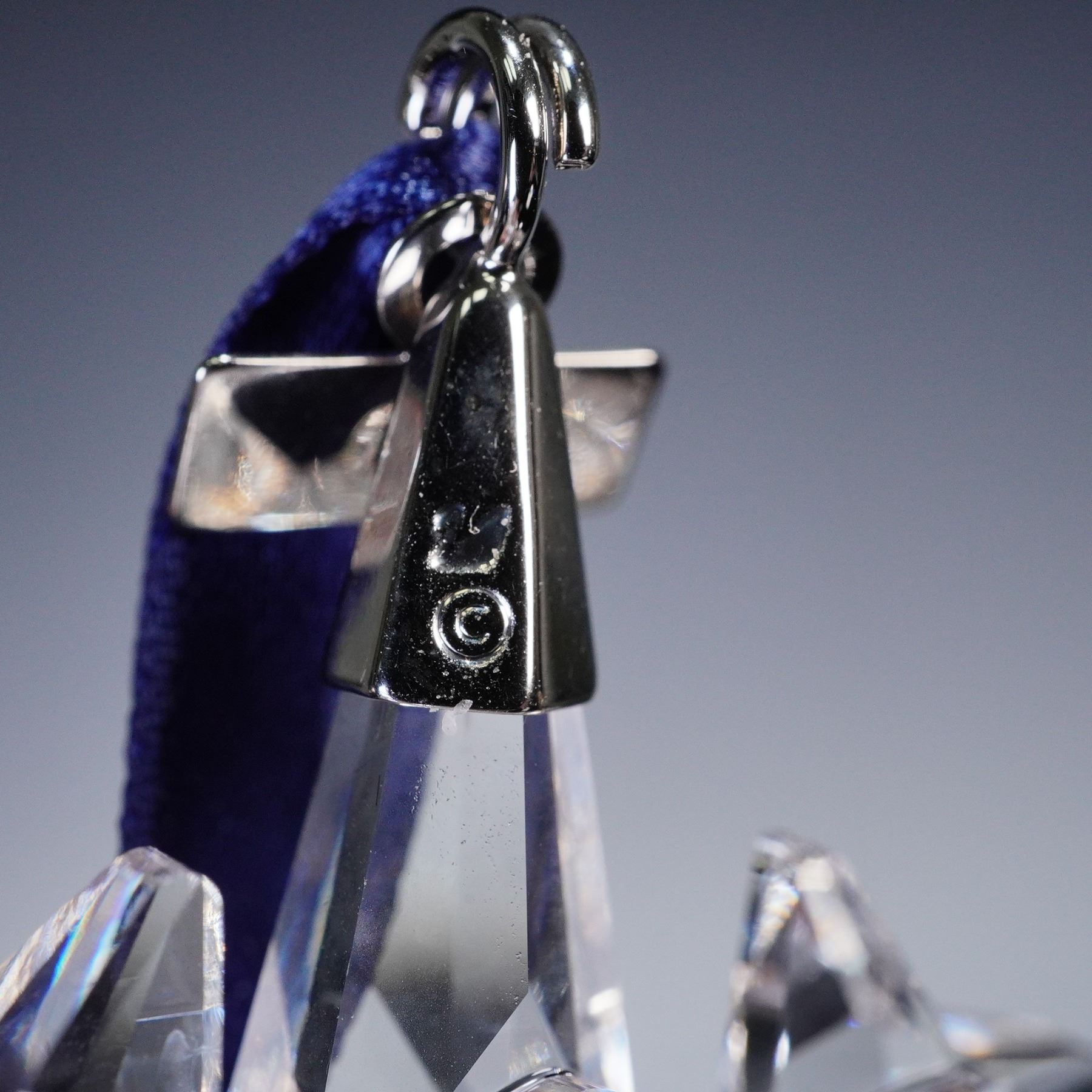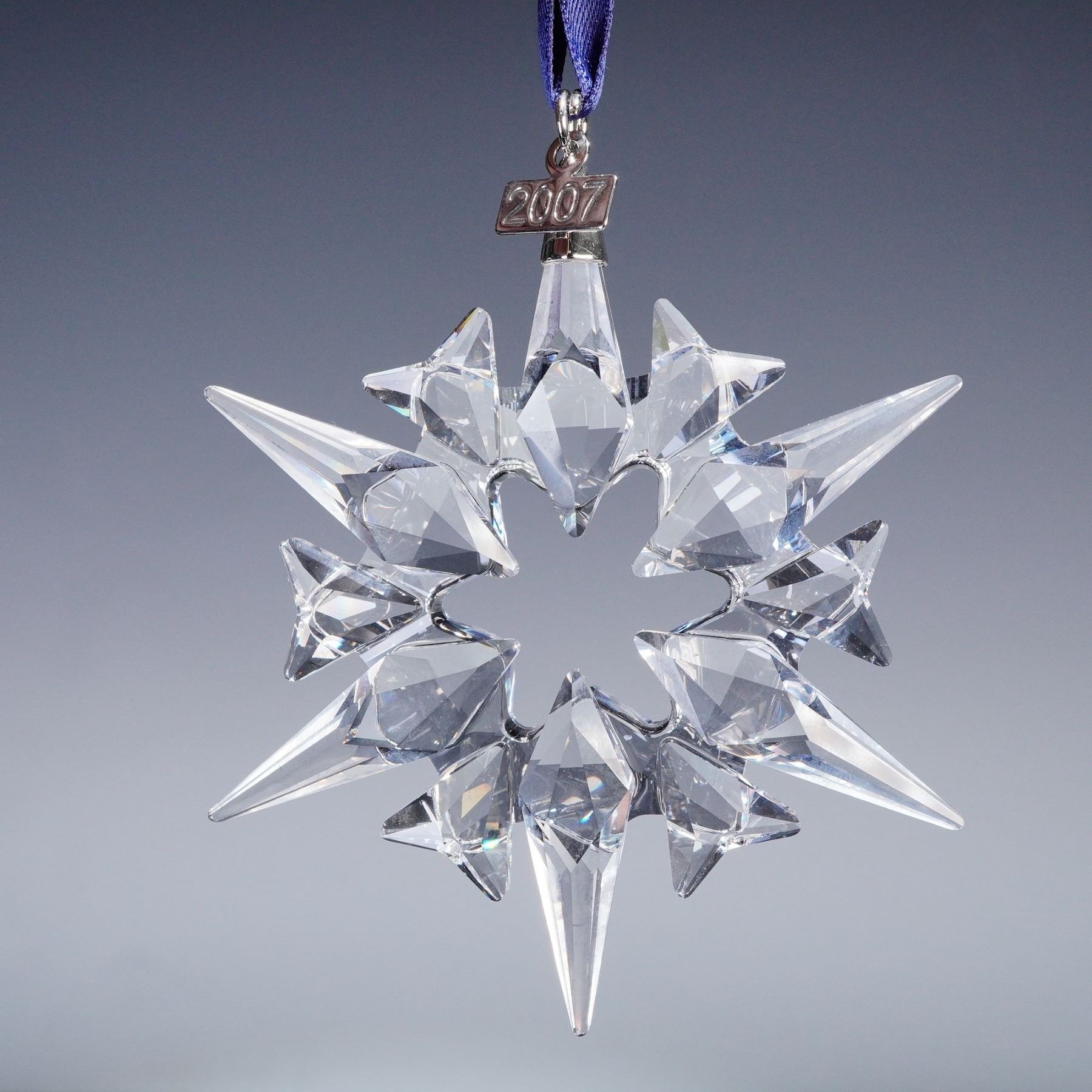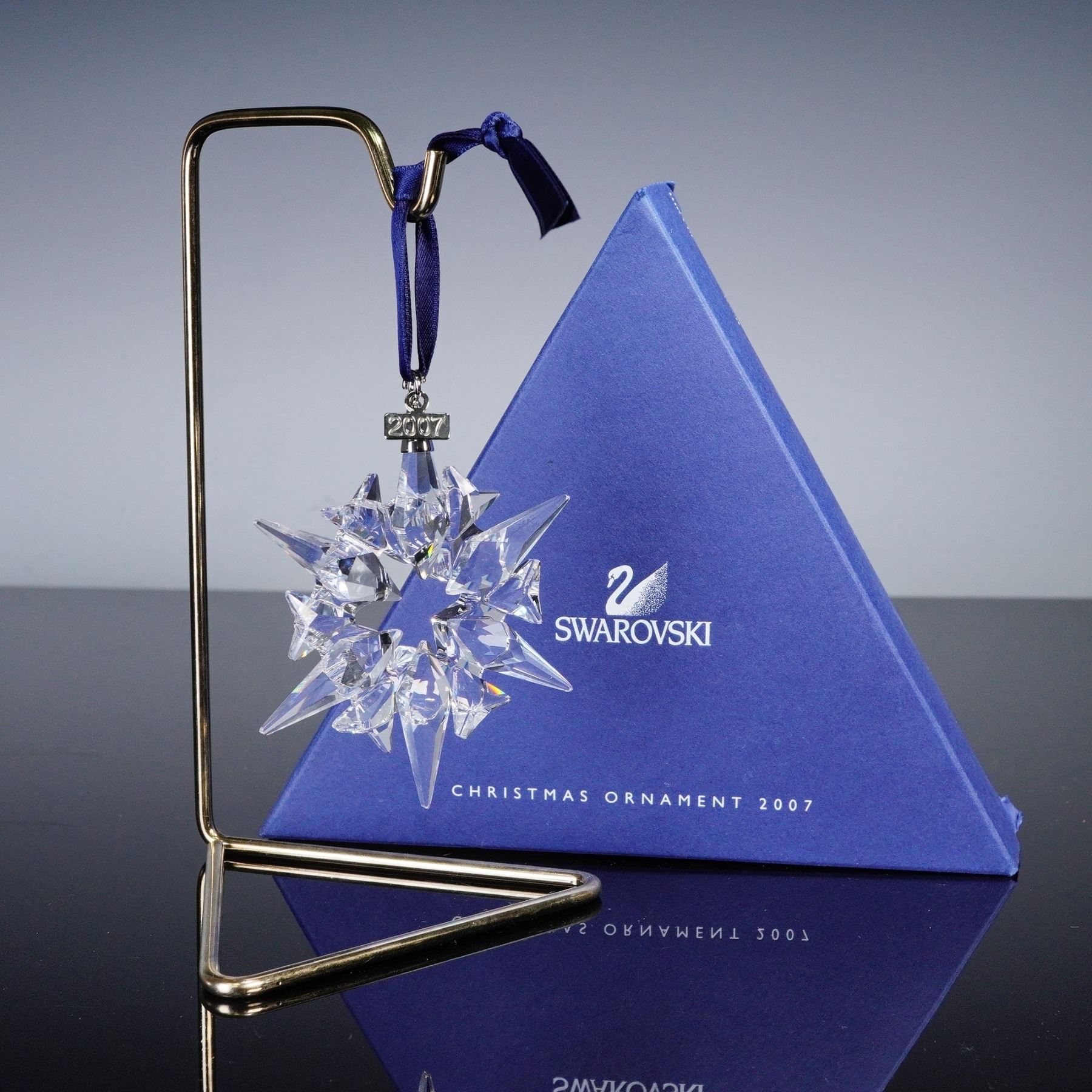 Swarovski crystal Christmas ornament 872200 Annual Edition 2007. This piece is designed as a radiant multi-pointed star with precision cut crystal facets and hangs from a blue satin ribbon with a silver tone metal tag engraved 2007. The ornament bears the Swarovski swan hallmark and comes with its original triangular box. The display stand is included. This highly collectible holiday release is ideal for seasonal display or as an addition to a Swarovski collection.