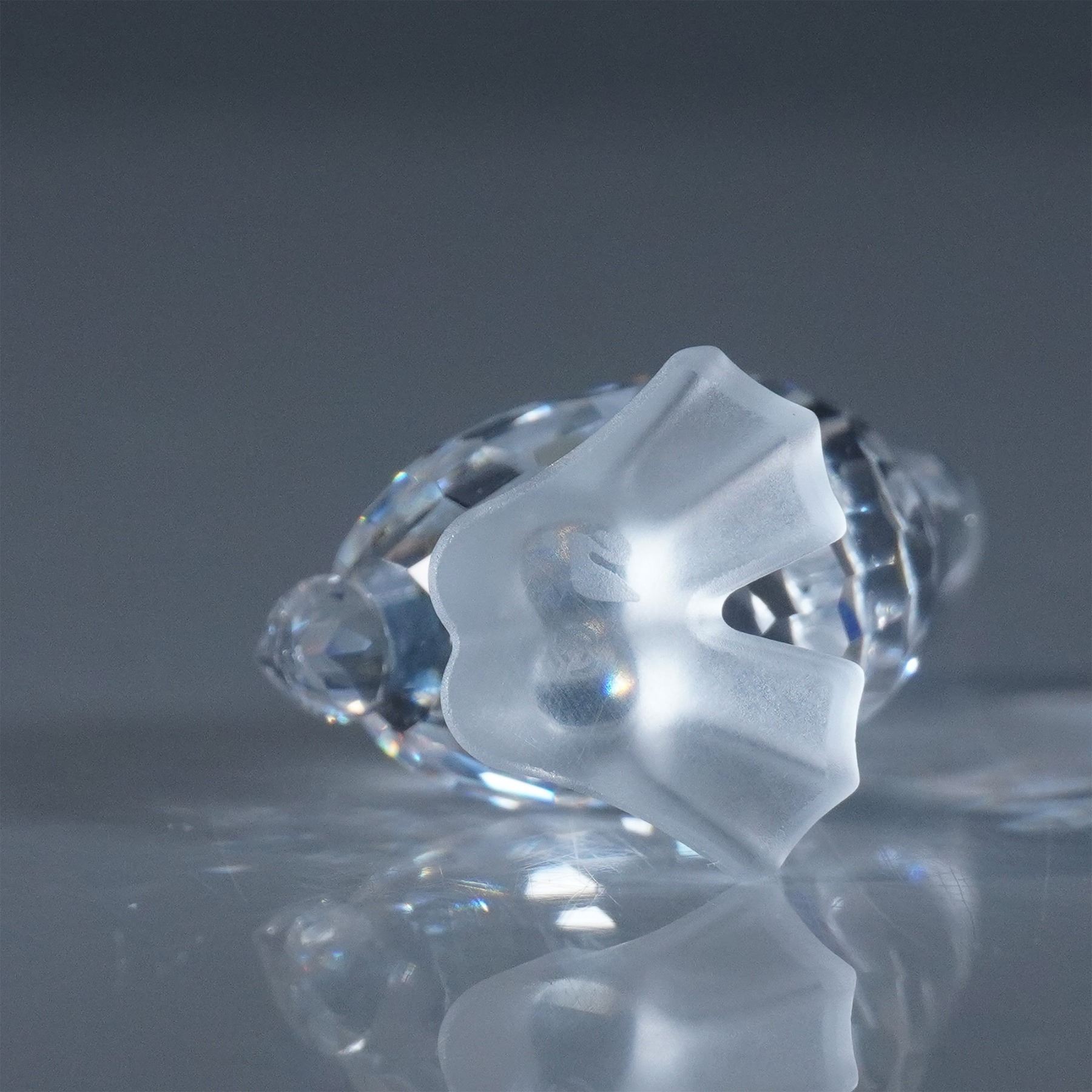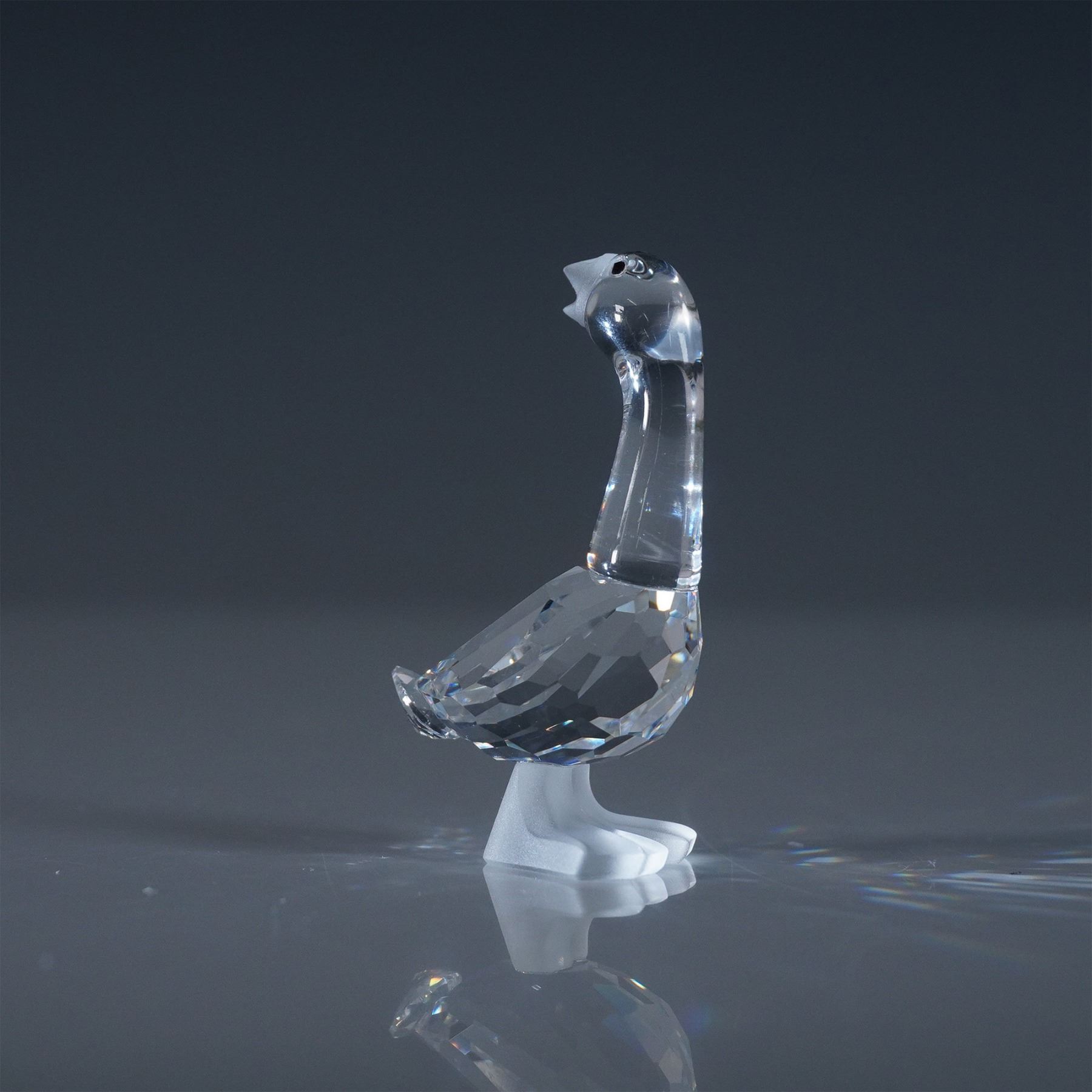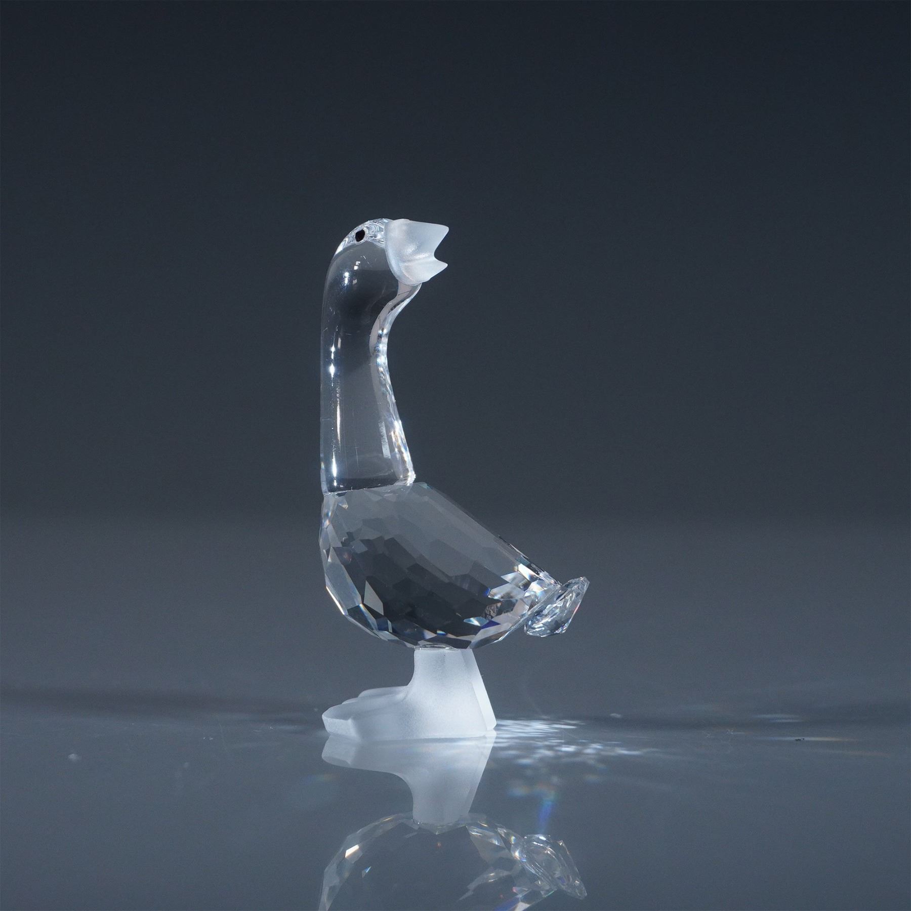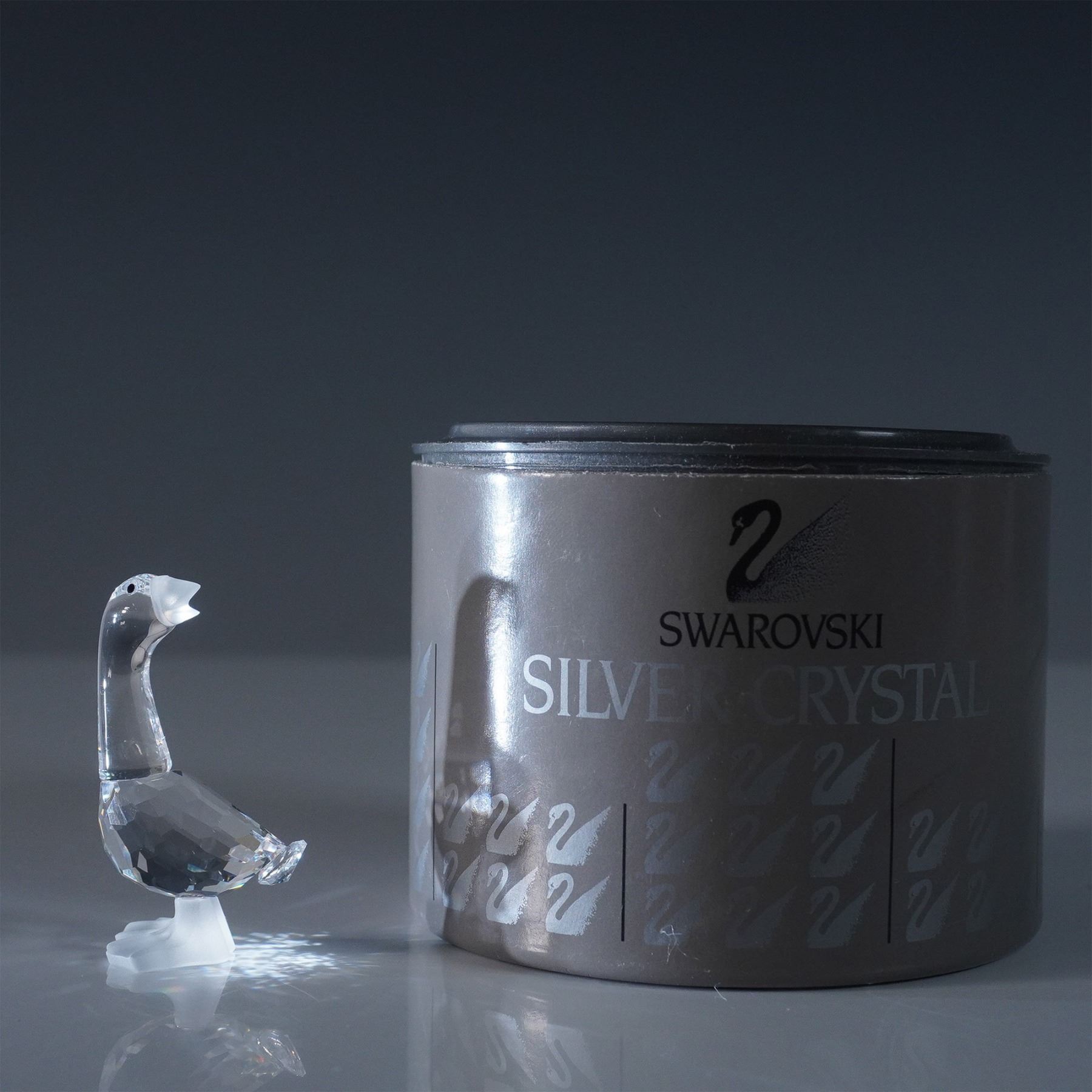 Swarovski Silver Crystal Dick Gosling figurine, a beautifully faceted crystal piece featuring a frosted beak and feet. This elegant design captures the charm and grace of a gosling, making it a desirable collectible. The Swarovski logo is etched on the base, confirming authenticity. Includes the original box.