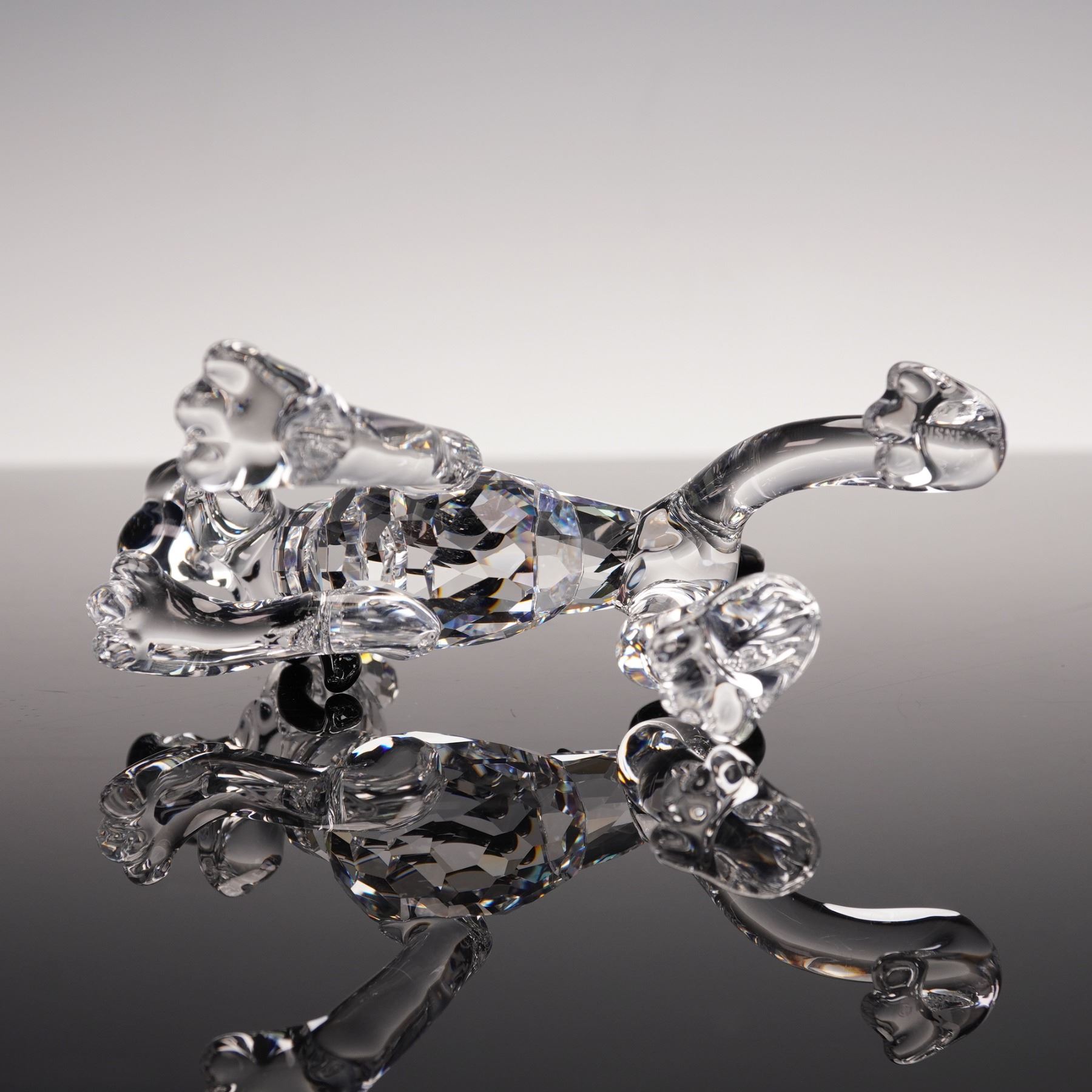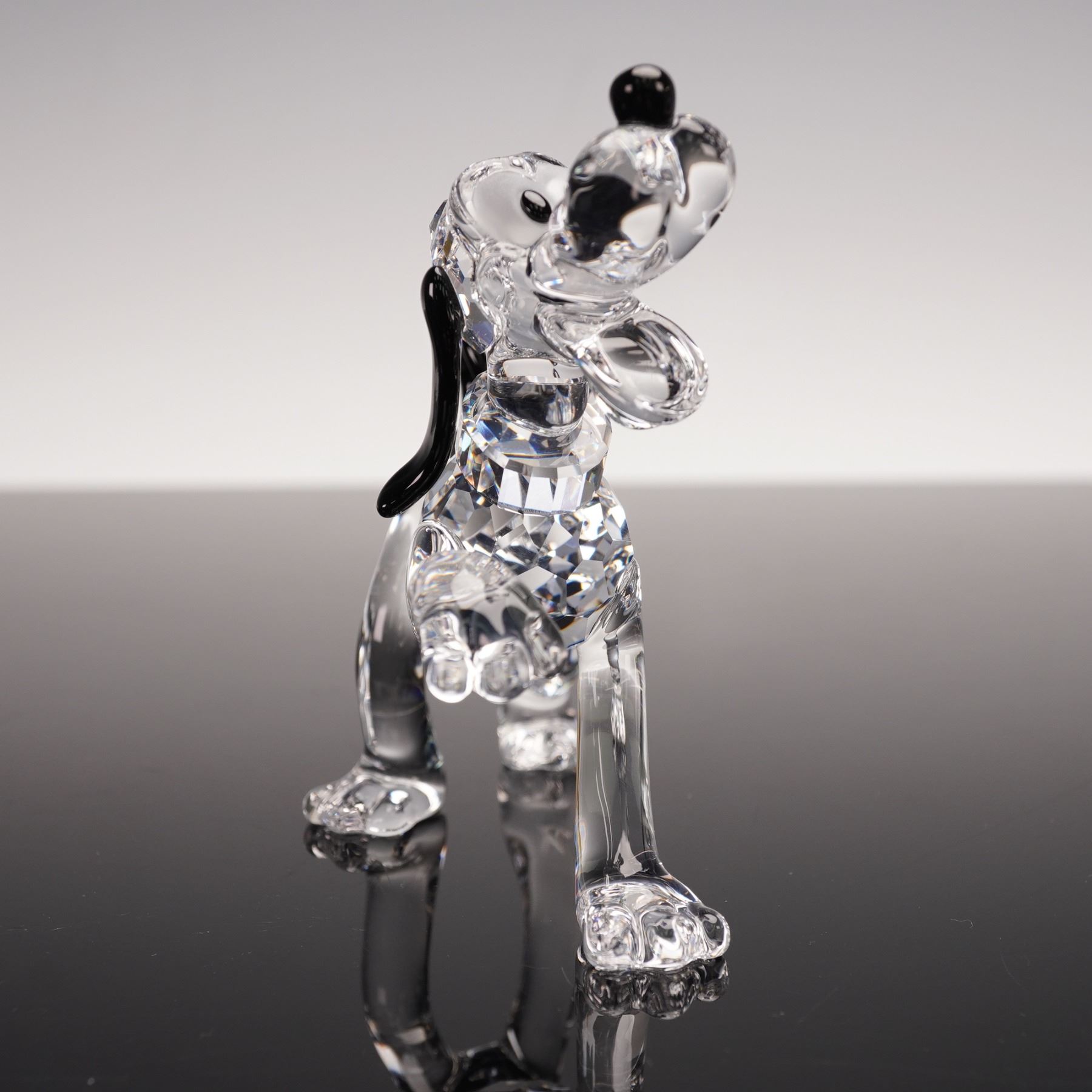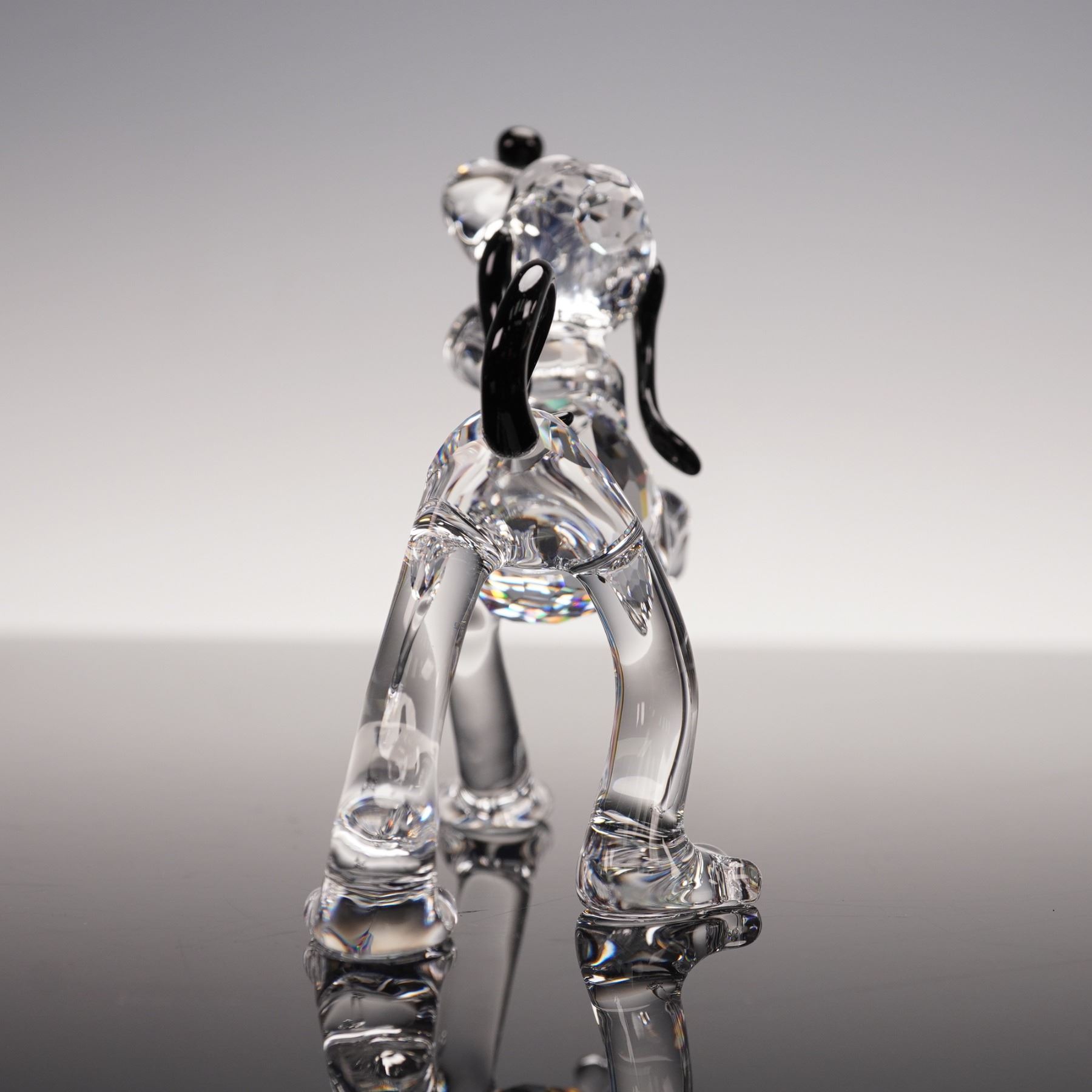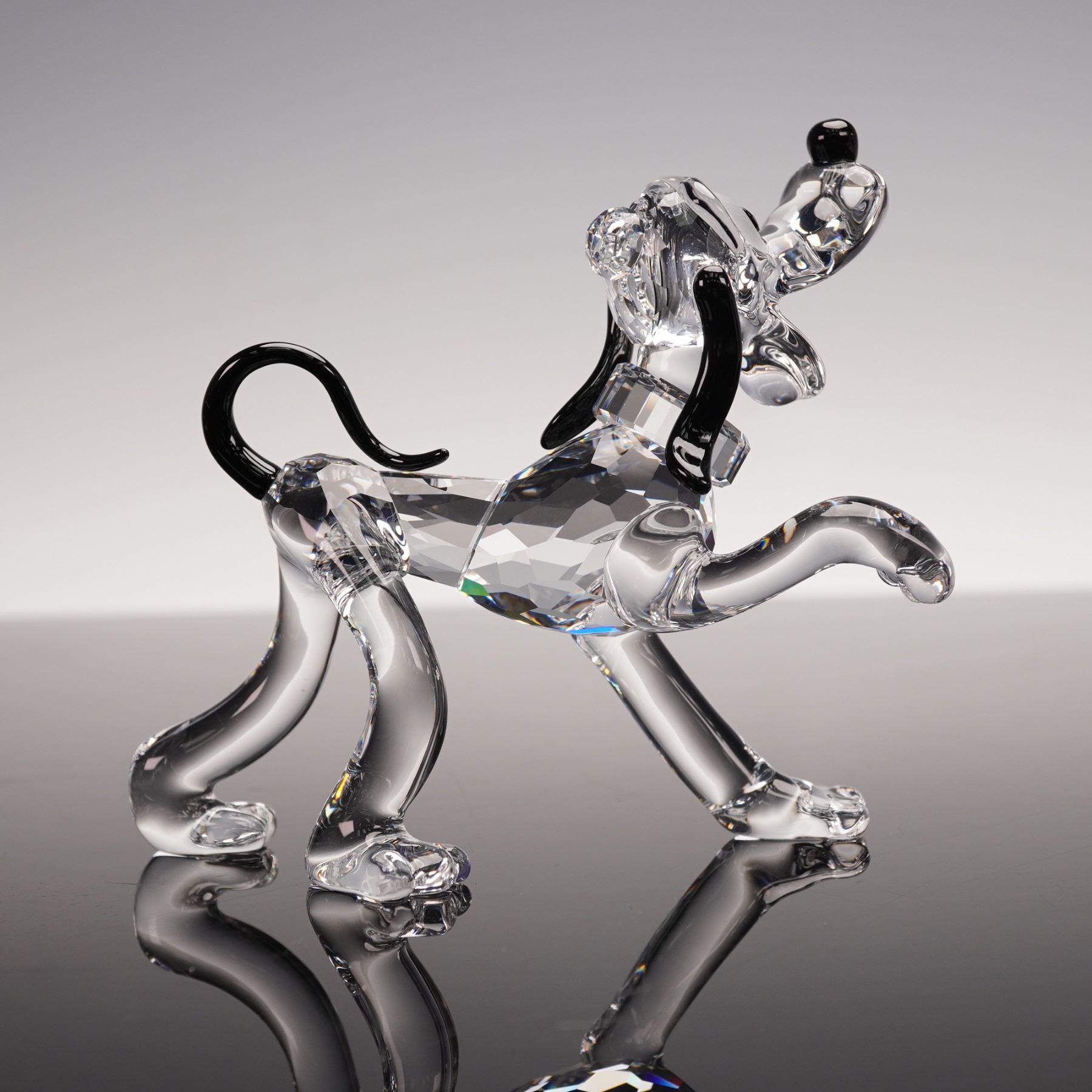 This dazzling Swarovski Pluto figurine from the Disney Showcase collection captures the playful charm of Mickeys loyal companion. Crafted from clear faceted crystal that gleams with every movement, Pluto's joyful pose radiates energy and warmth. His tail, nose, and long floppy ears are formed in glossy jet crystal, creating a bold contrast that brings the character to life. Swarovski backstamp. This item has its original box. Box measures: 5.75"L x 5.75"W x 3.75"H.