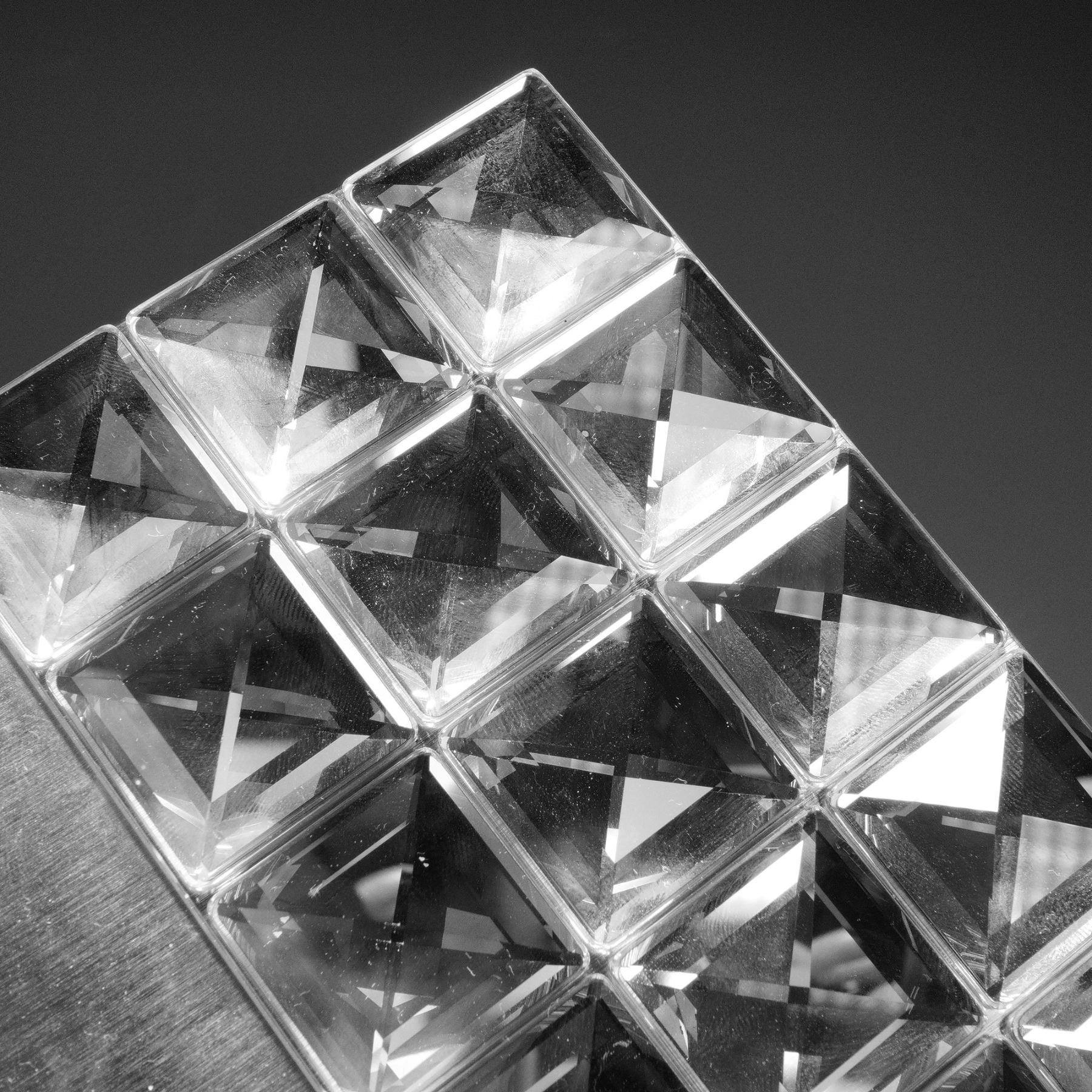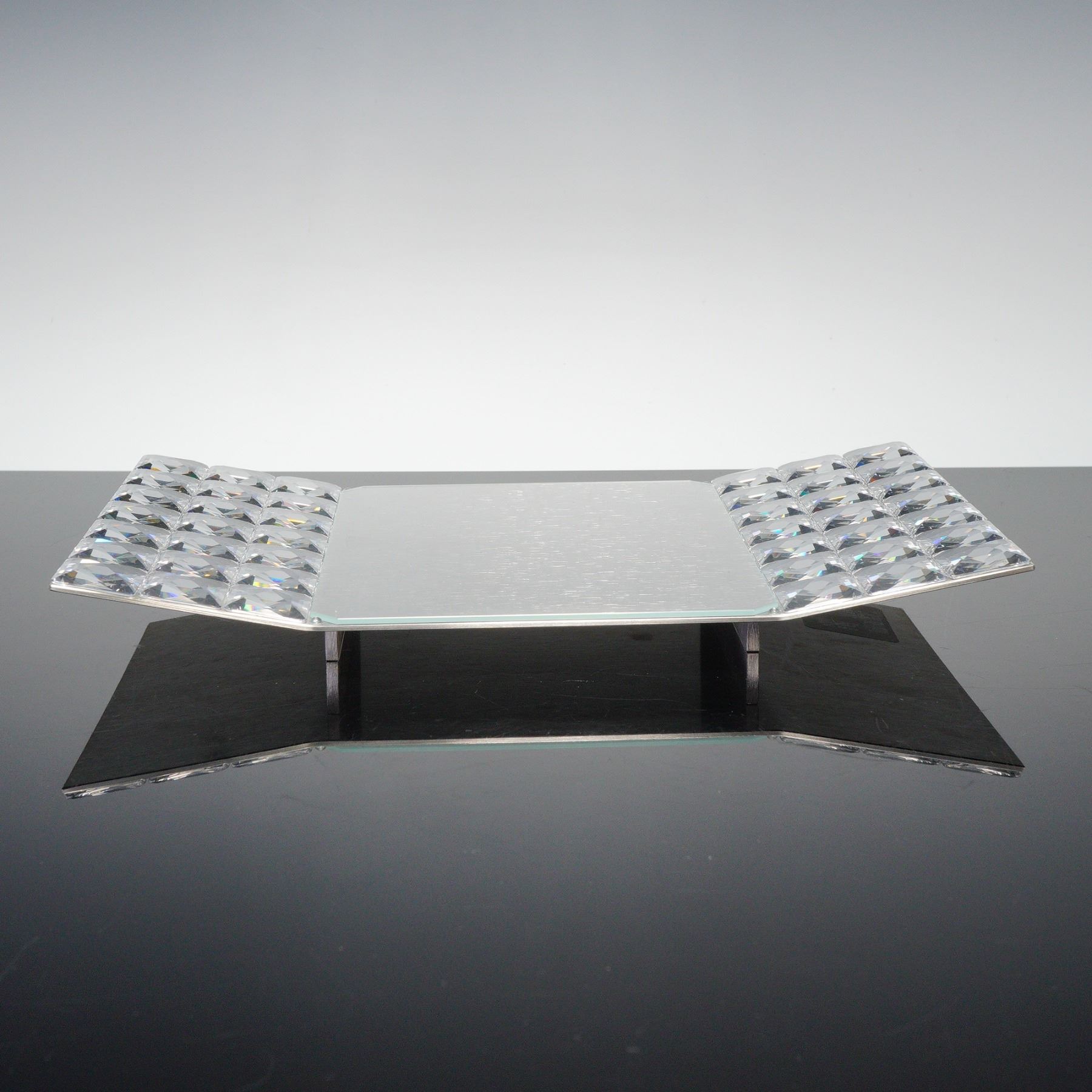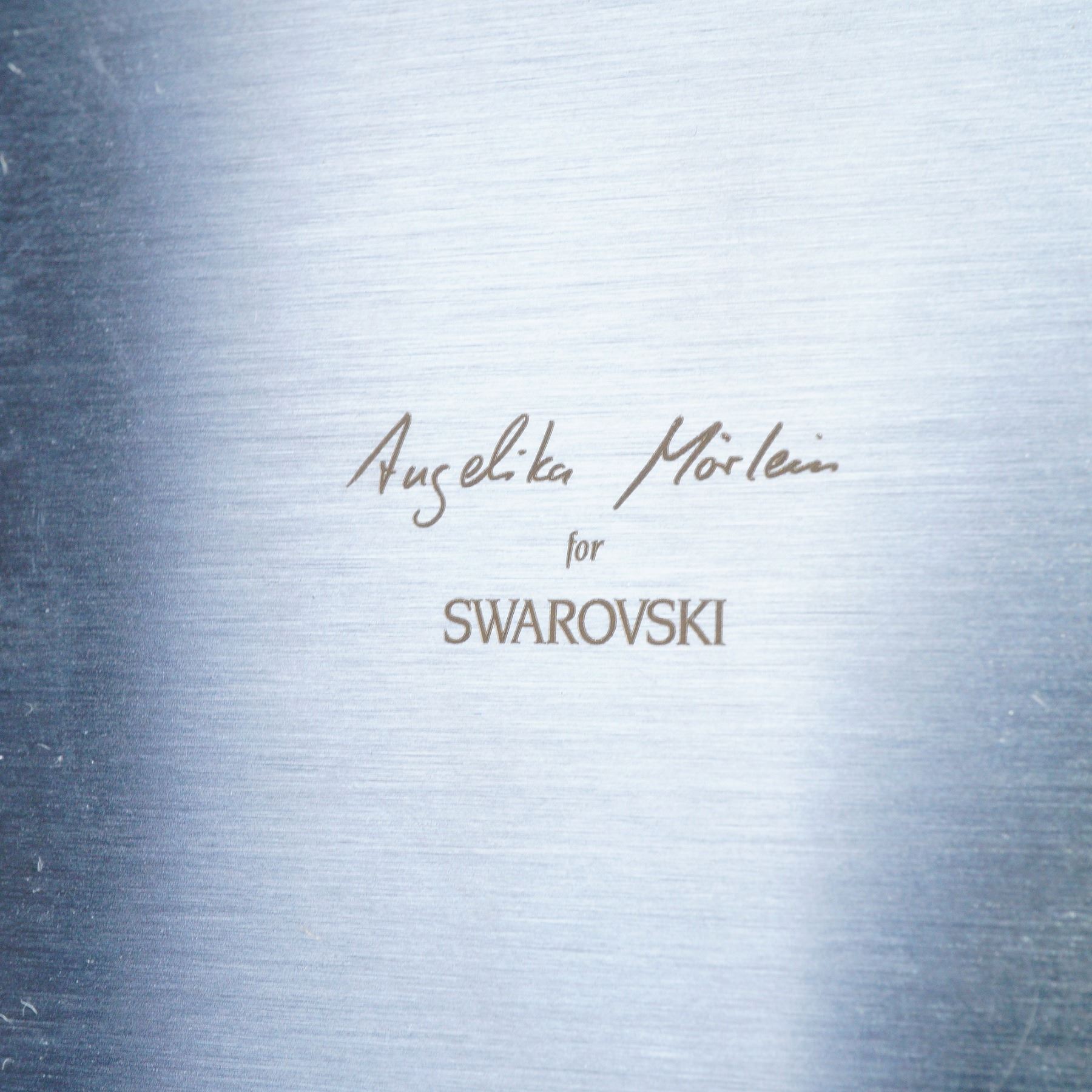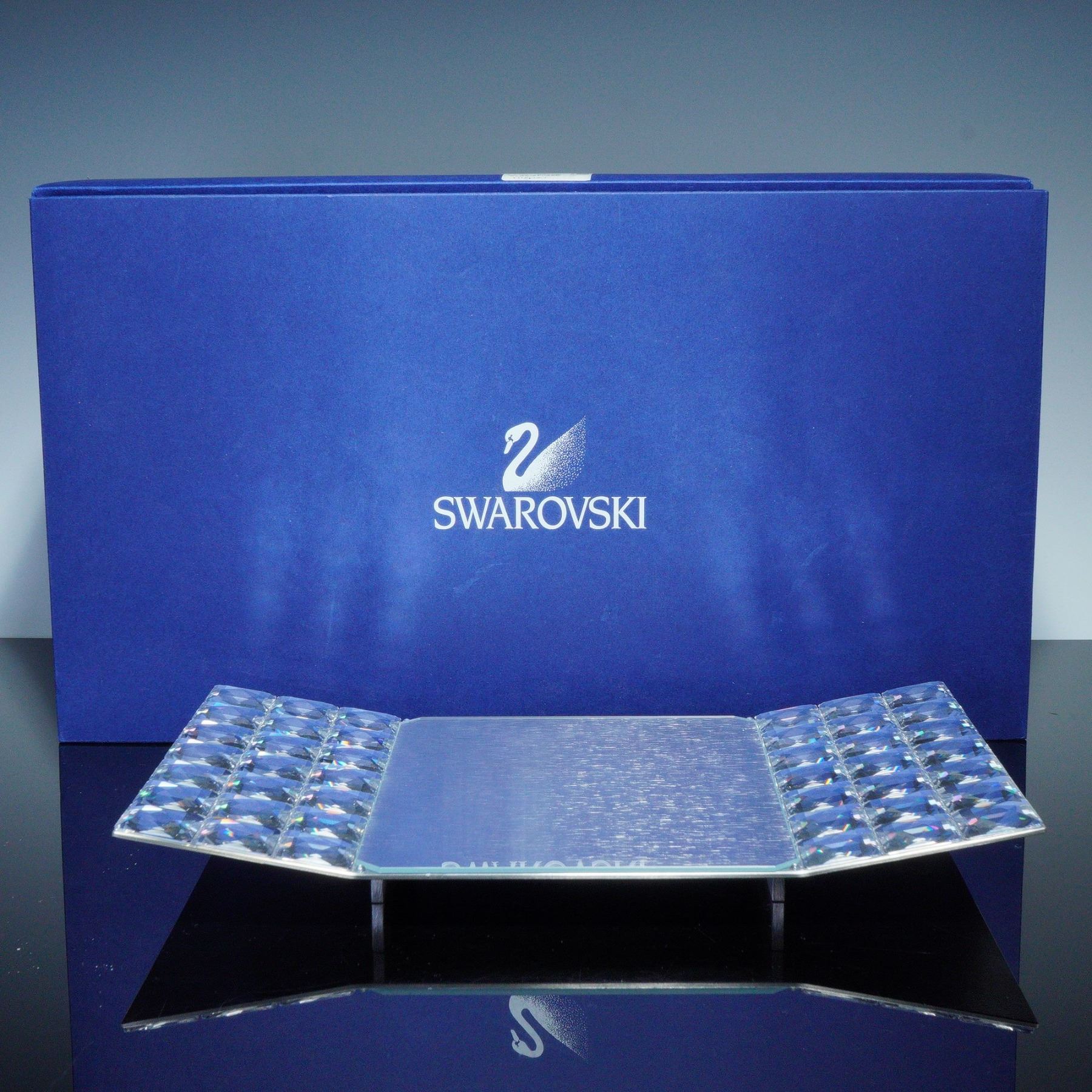 This Swarovski crystal sushi plate, designed by Angelika Mohrlein, features multi-faceted crystal elements on each end of the rectangular plate, showcasing the brand's renowned craftsmanship. Part of the Dressed Up collection, it is a unique decorative piece or functional serving tray. Marked with the designer's signature and includes the original box.