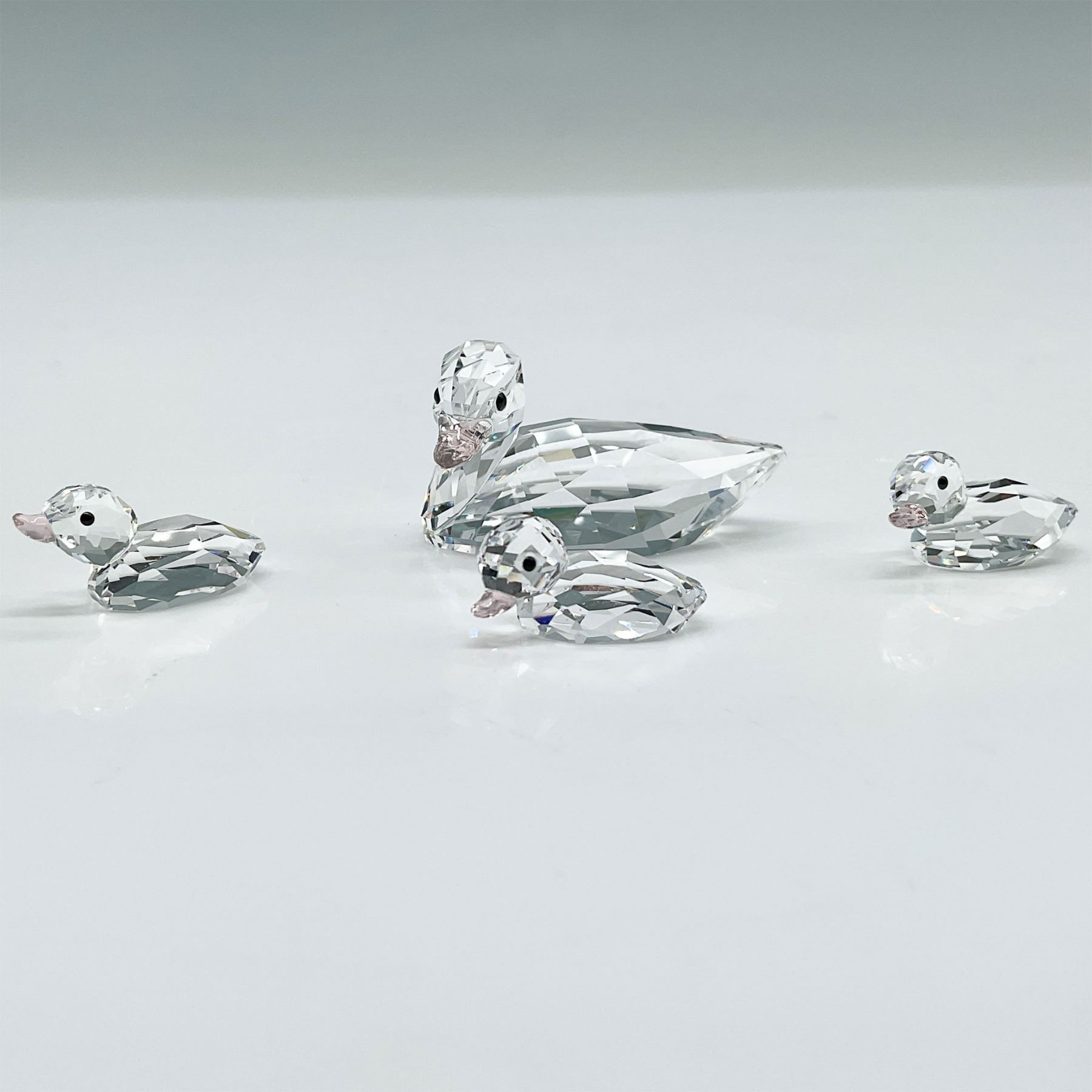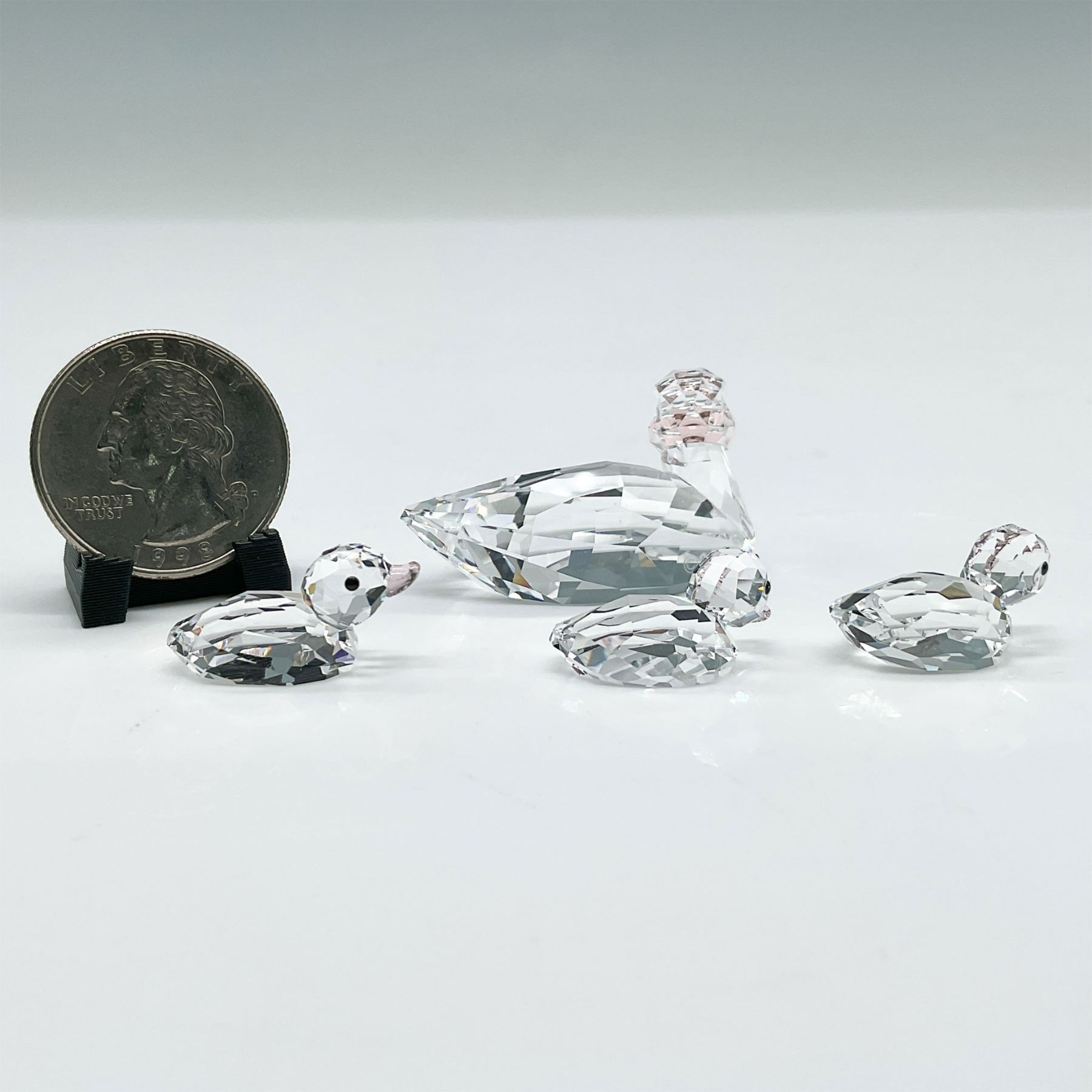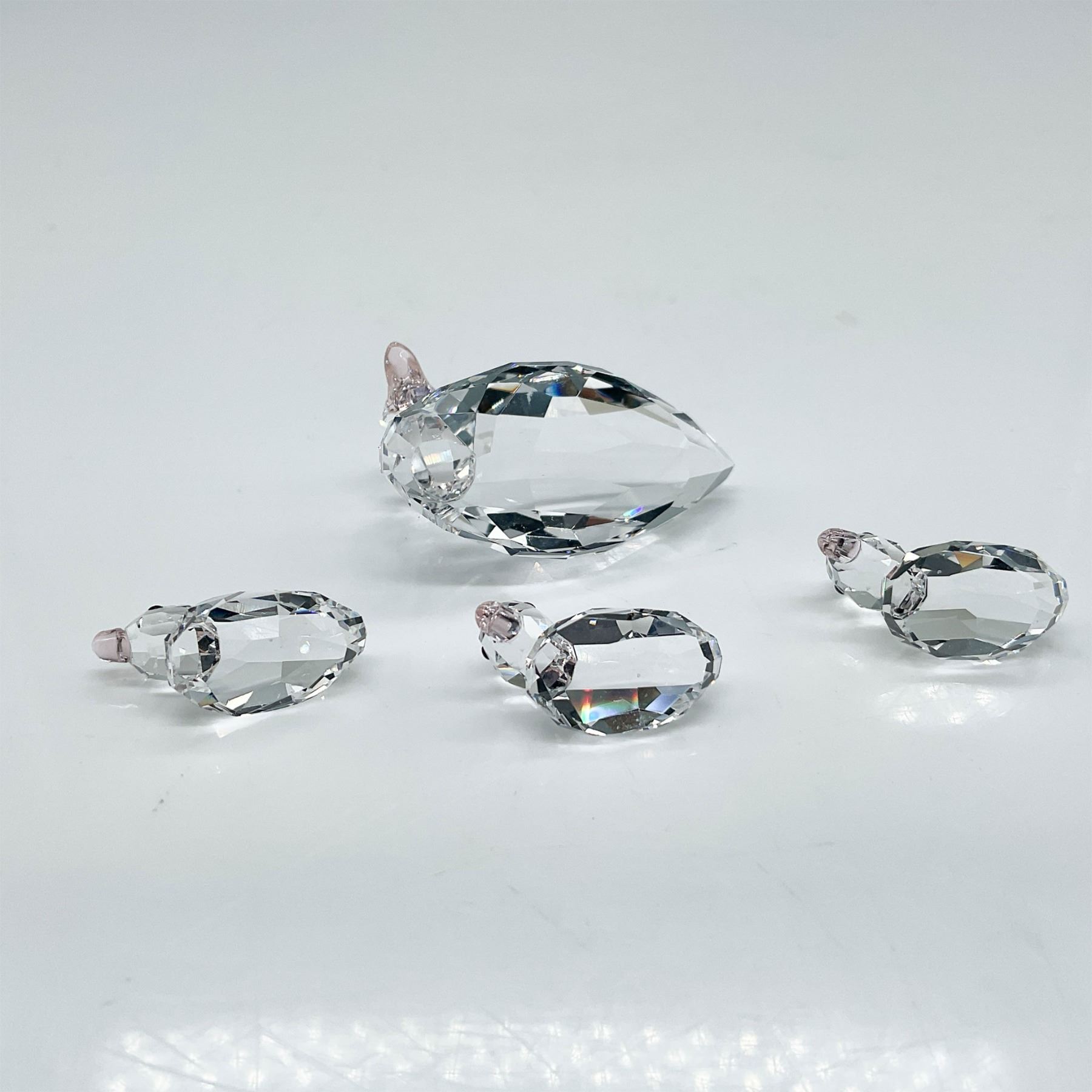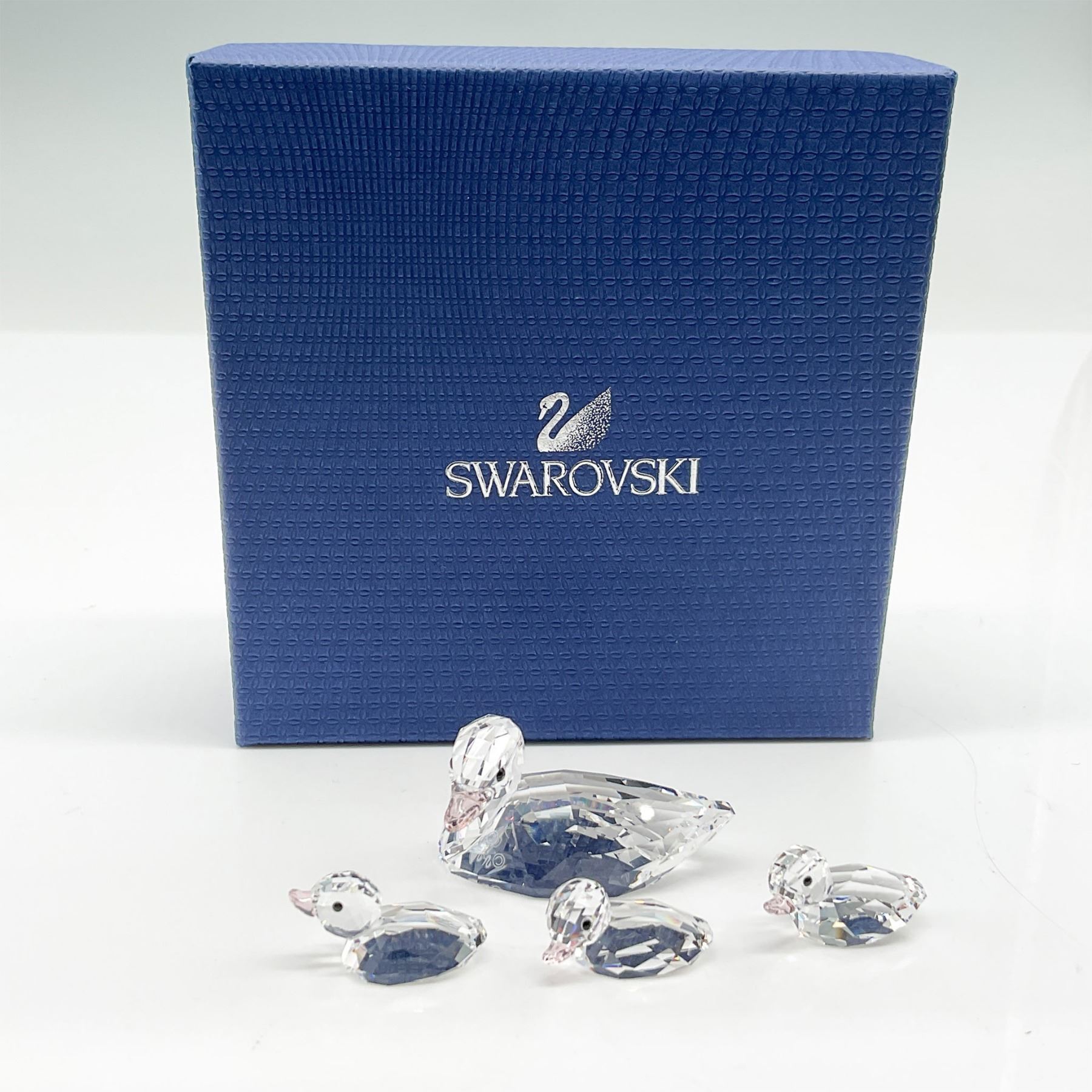 A delightful Swarovski crystal set featuring a mother duck and three ducklings. Each piece is masterfully crafted with precision-cut clear crystal, complemented by vintage rose beaks. The set includes the original Swarovski blue box, showcasing the iconic swan logo. A charming addition to any Swarovski collection or a perfect display piece. 5004695-1.