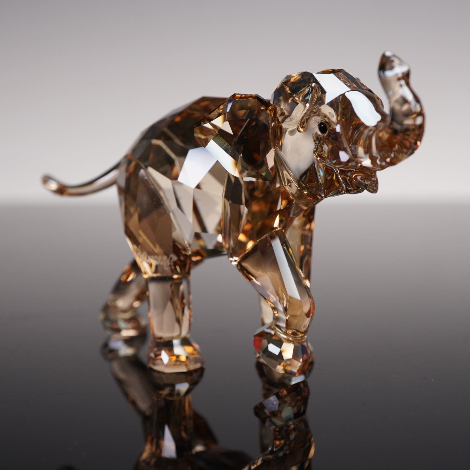 Charming Swarovski Crystal Society (SCS) 2013 Annual Edition Companion figurine titled "Young Elephant." Designed by Elisabeth Adamer, this beautifully crafted piece depicts a young elephant walking forward with its trunk raised, symbolizing joy and good fortune. Rendered in warm smoky topaz crystal, the figurine features jet crystal eyes and intricate faceting that captures light in a stunning amber-gold hue. This piece was created as the companion to the SCS 2013 Annual Edition "Elephant Cinta", completing the mother and calf pairing from Swarovski's The Elegance of Africa series. Etched with the Swarovski swan logo, designer's signature, and year, and accompanied by its original SCS presentation box. 1142862.