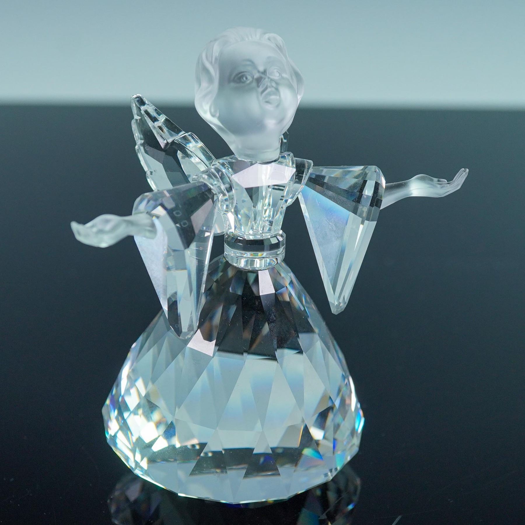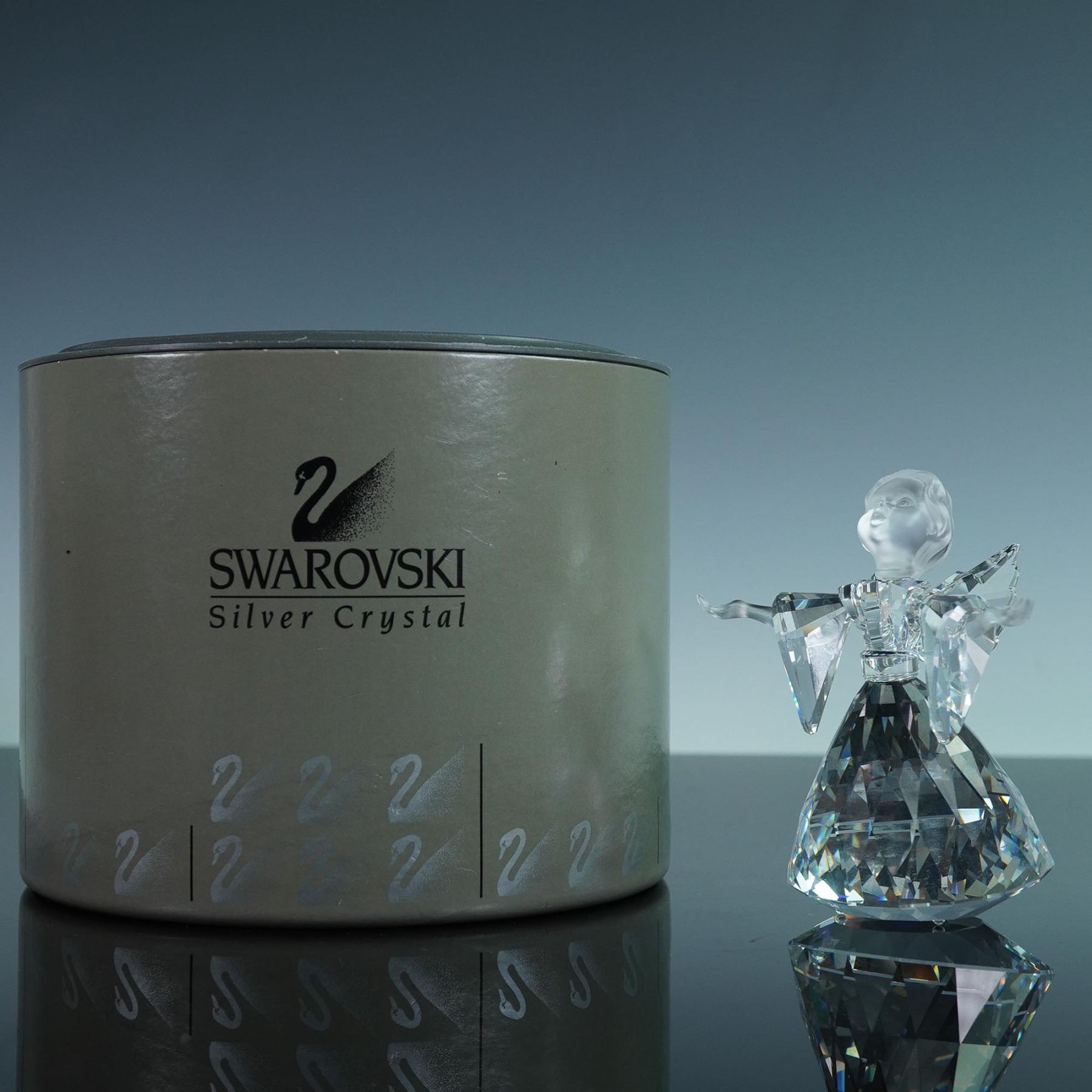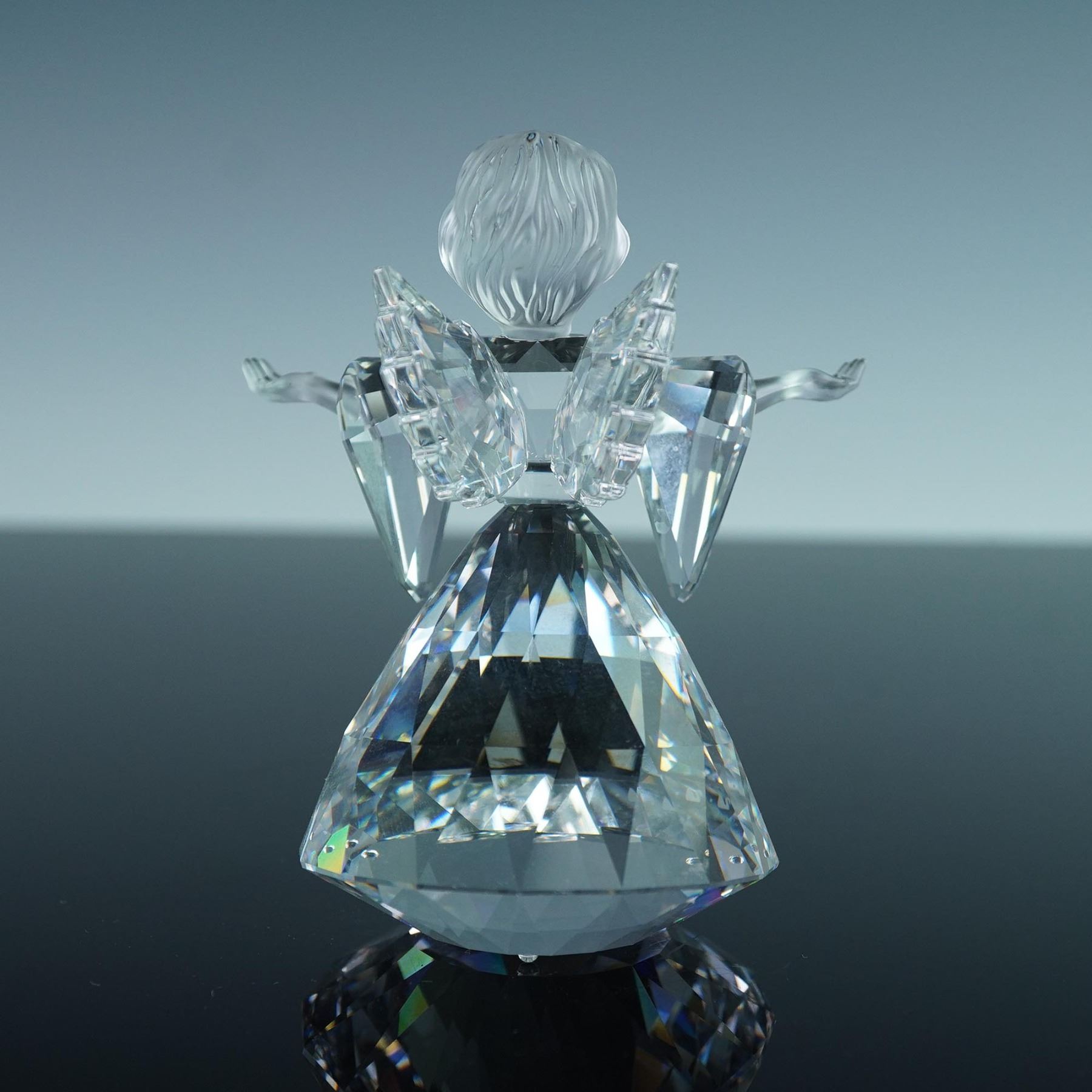 Swarovski Silver Crystal large angel figurine designed by Adi Stocker, featuring a fully faceted clear crystal gown with outstretched arms and frosted crystal hands and face. The expressive design and contrast in finishes highlight Swarovski’s precision artistry. The piece is acid-etched with the swan logo and comes with its original round grey Swarovski box. A timeless and serene collectible, ideal for seasonal displays or as a standalone decorative accent.