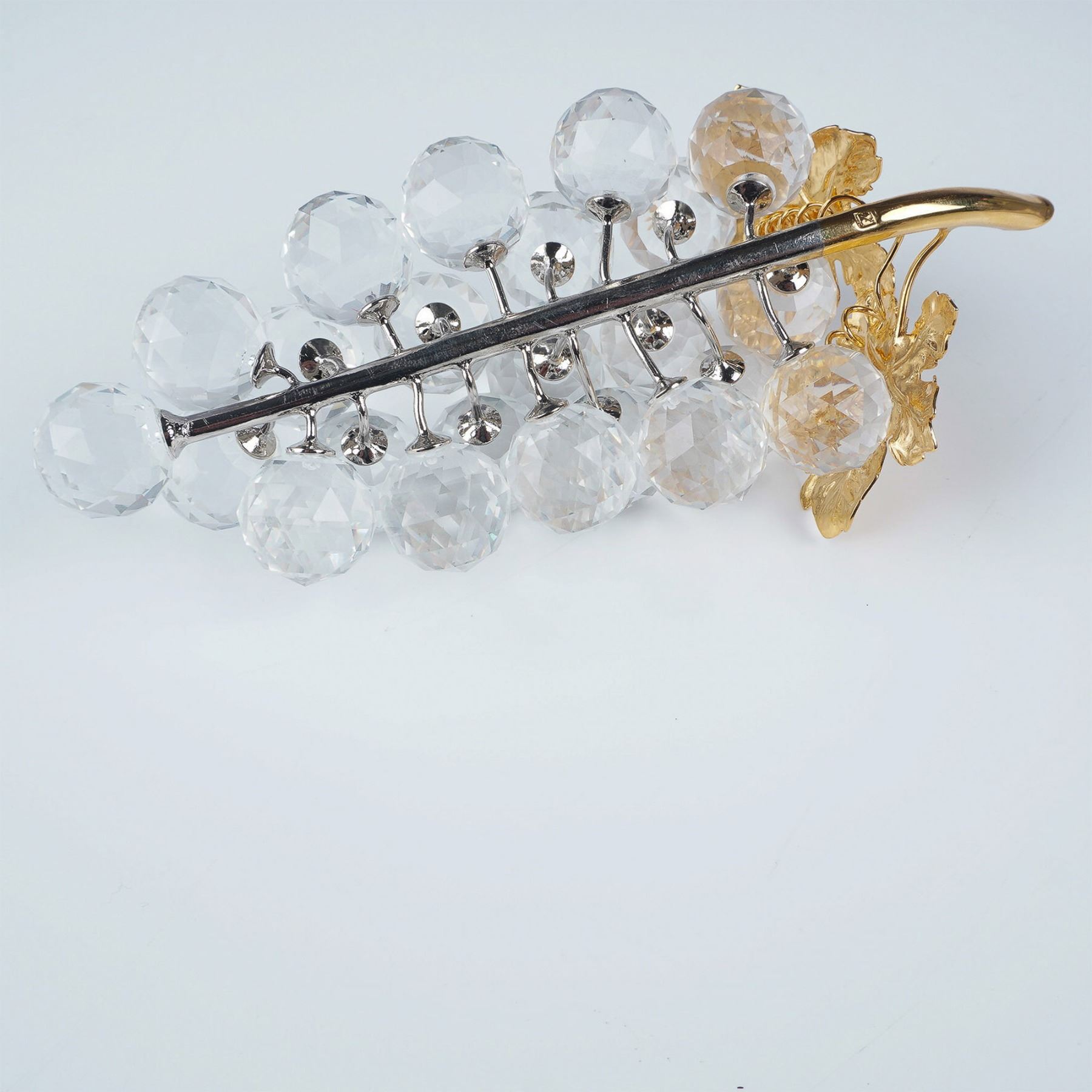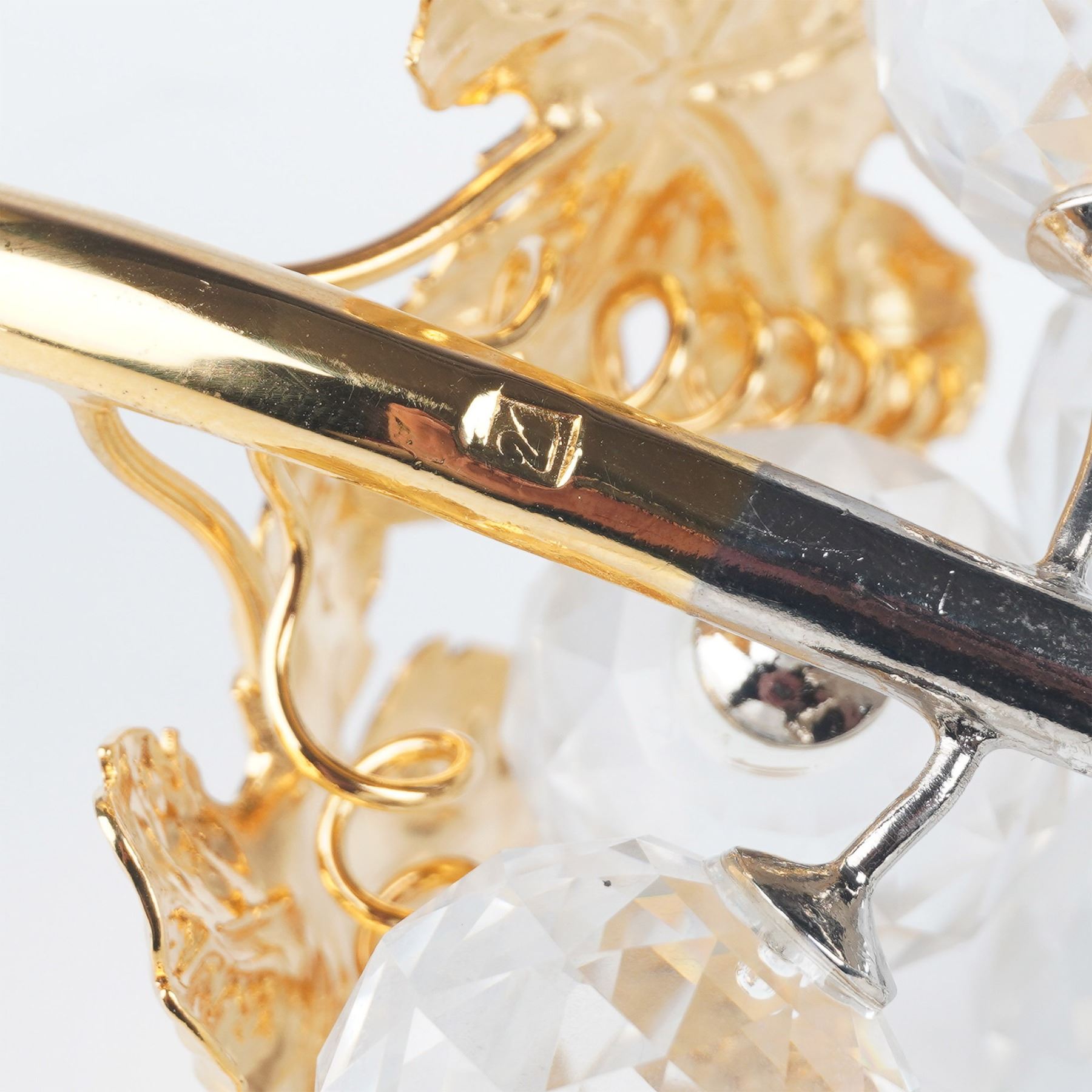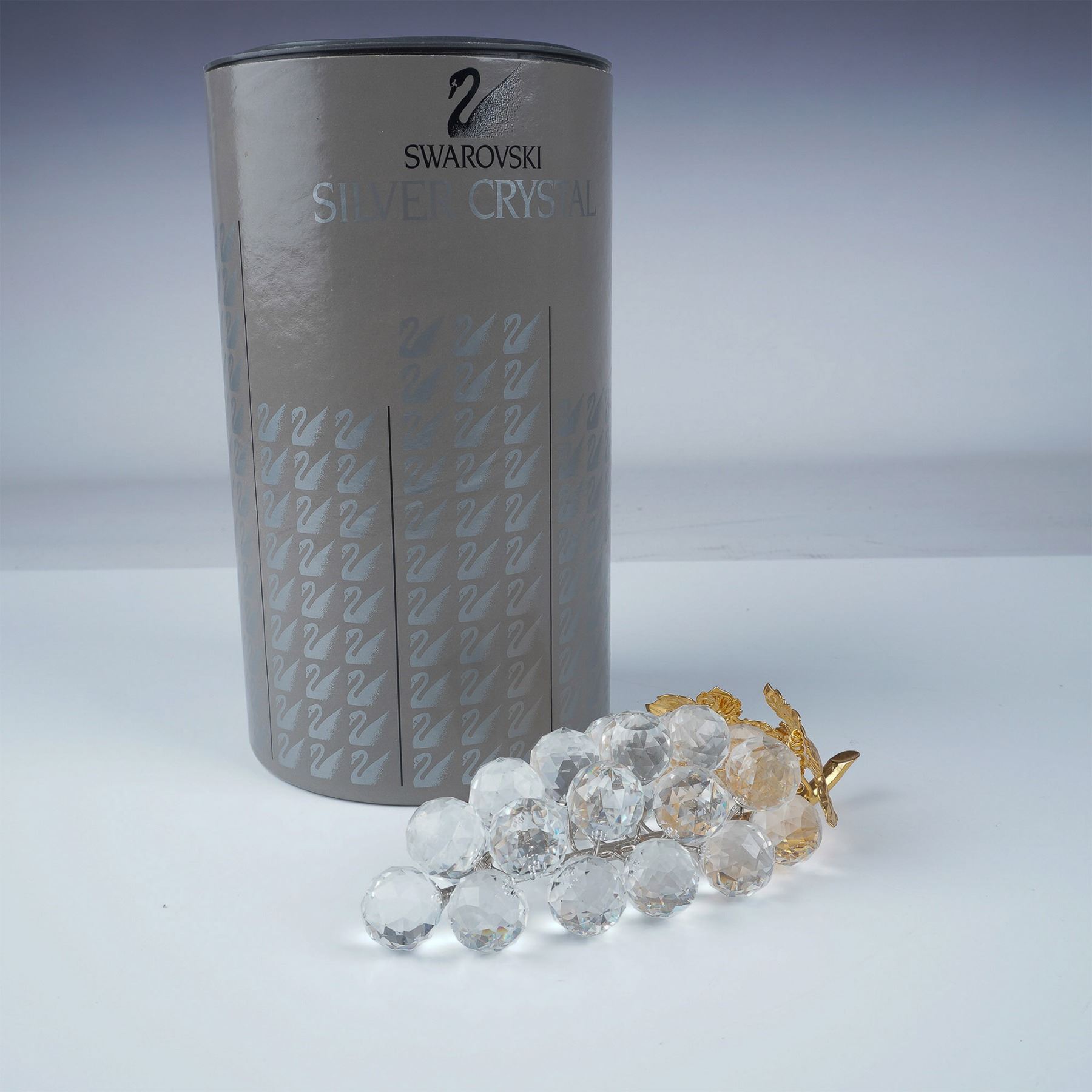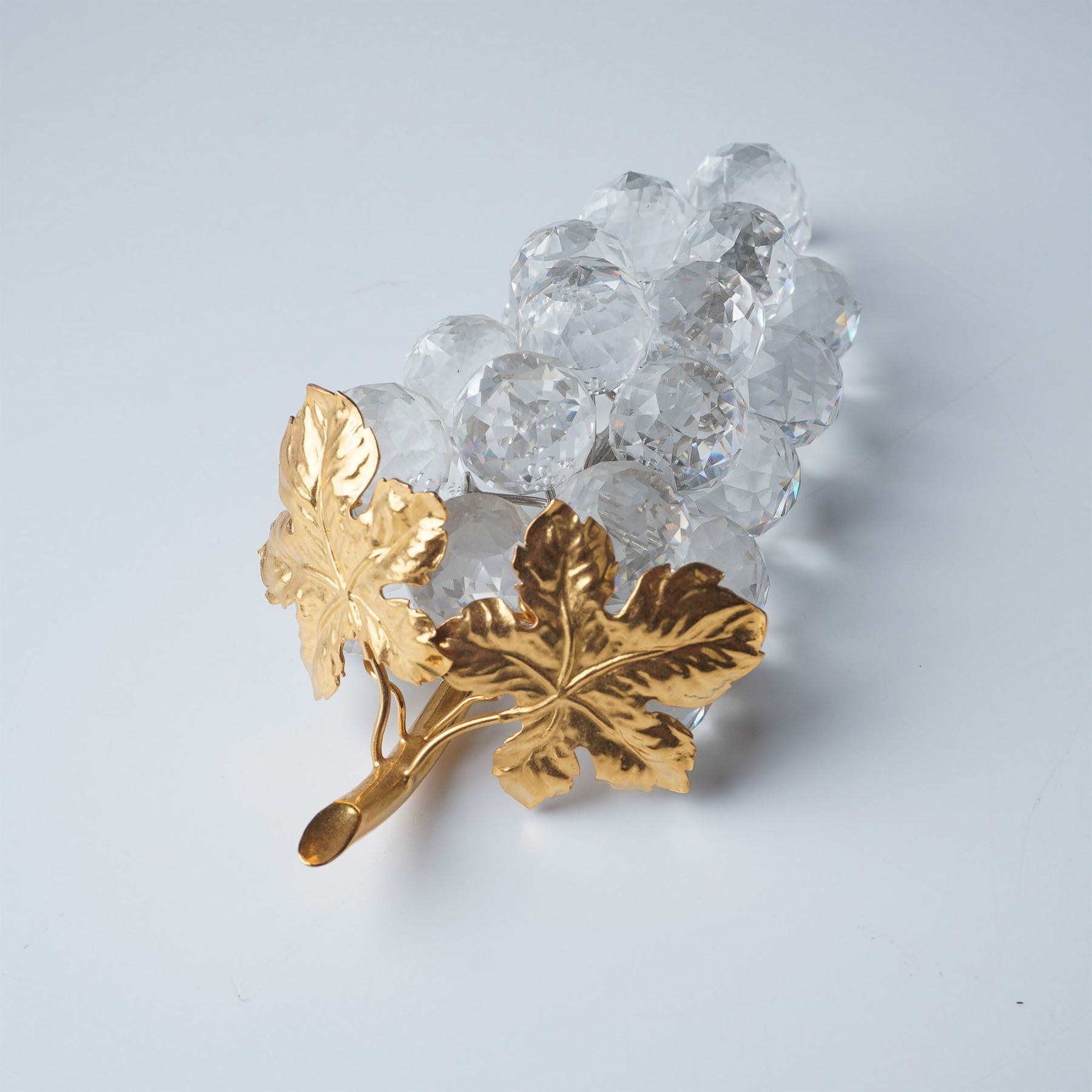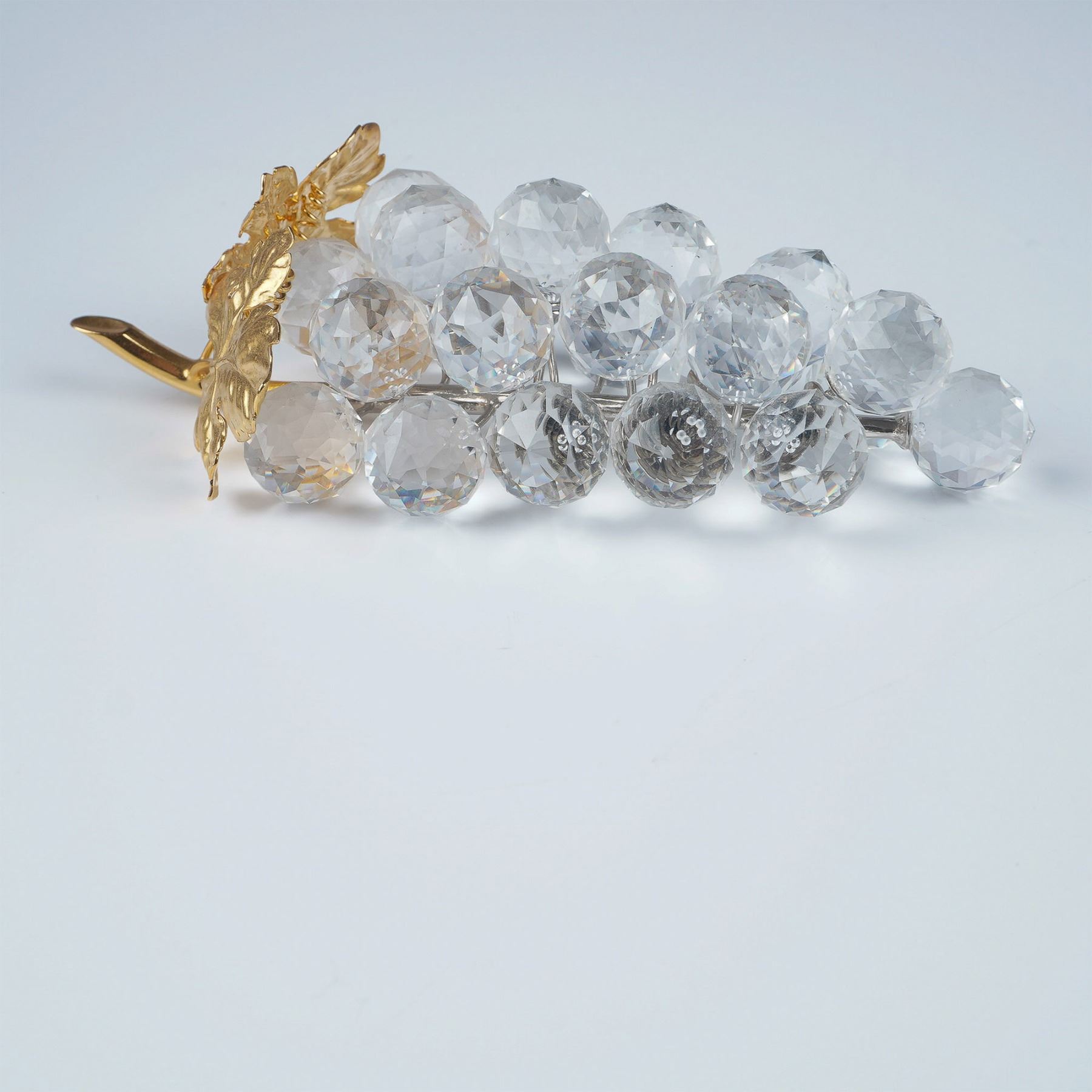 Exquisite Swarovski crystal figurine from the Sparkling Fruit collection. This elegant design showcases 23 clear faceted crystal grapes arranged on a rhodium-plated stem with gold-tone metal leaves. Some variations exist with 24 grapes. The piece bears the Swarovski marking, attesting to its authenticity and craftsmanship. This item has its original box.