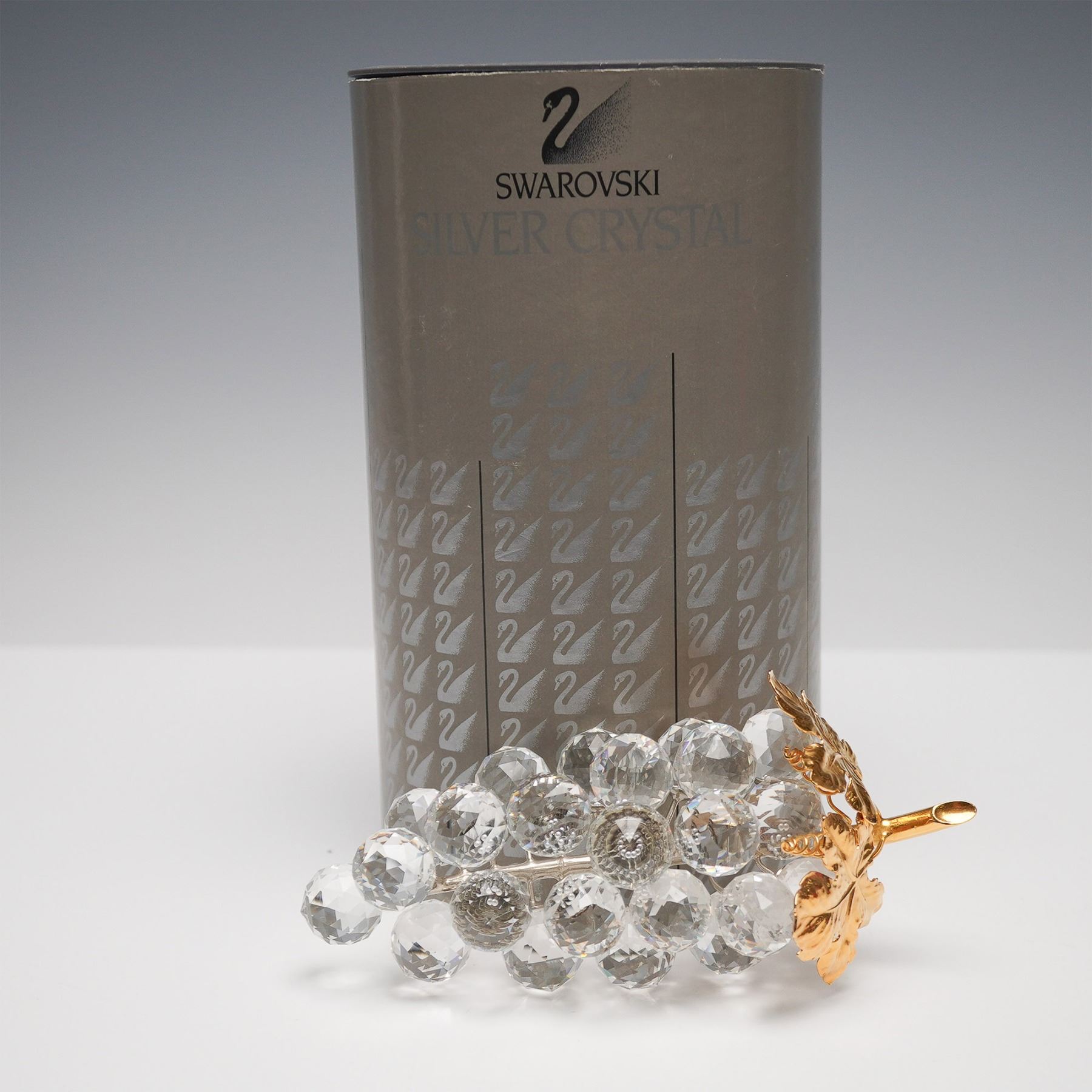 Exquisite Swarovski crystal figurine from the Sparkling Fruit collection. This elegant design showcases 23 clear faceted crystal grapes arranged on a rhodium-plated stem with gold-tone metal leaves. Some variations exist with 24 grapes. The piece bears the Swarovski marking, attesting to its authenticity and craftsmanship. This item has its original box.