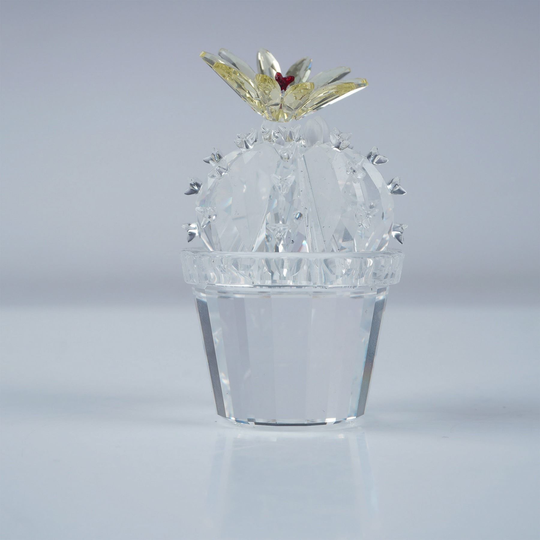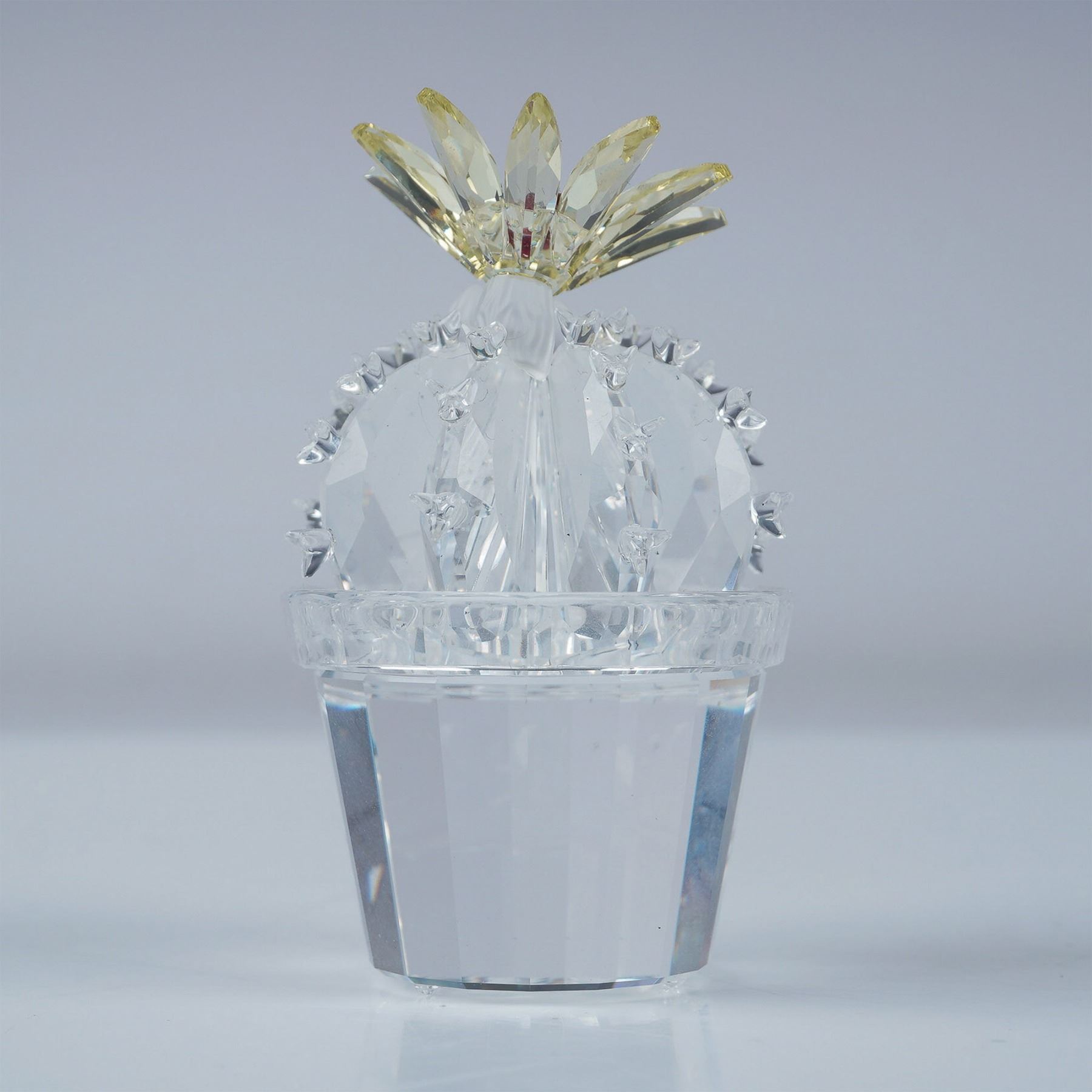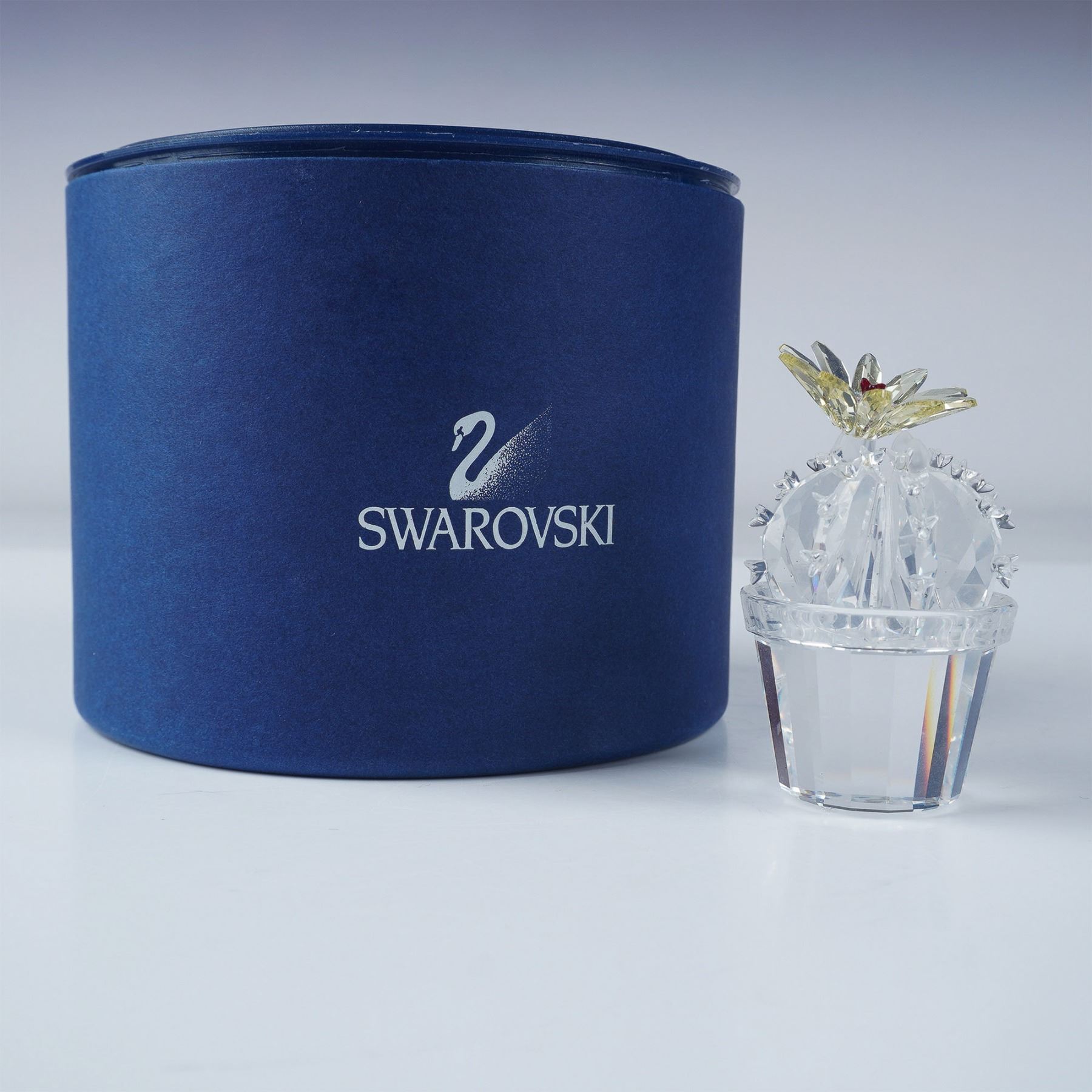 Swarovski Crystal Cactus Flowering figurine, finely crafted with faceted clear crystal to depict the body of the cactus adorned with delicate spikes. The top features a brilliant yellow-tinted flower with a red crystal center, adding a striking contrast to the clear crystal base. Marked with the Swarovski logo, ensuring authenticity. Comes in its original Swarovski box.