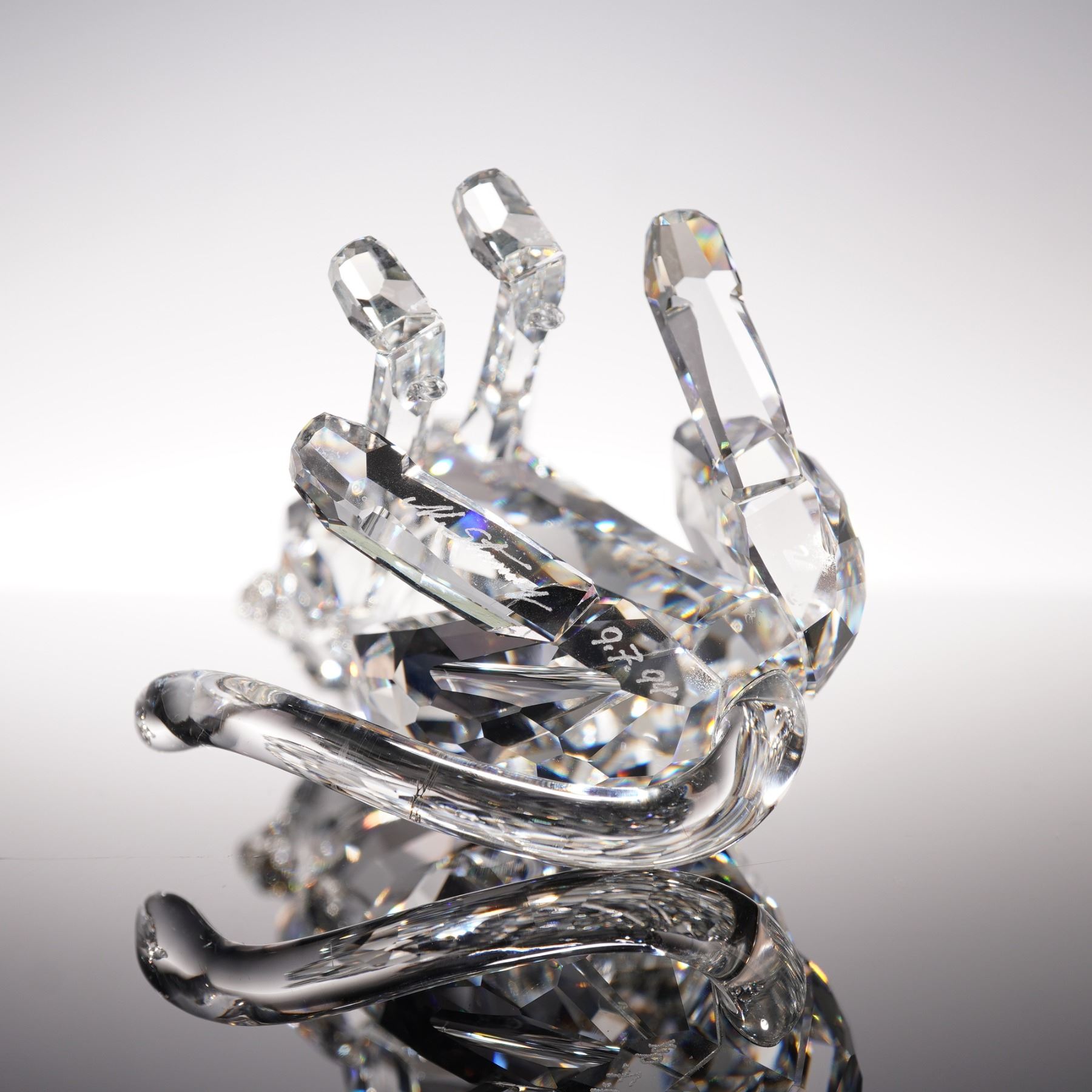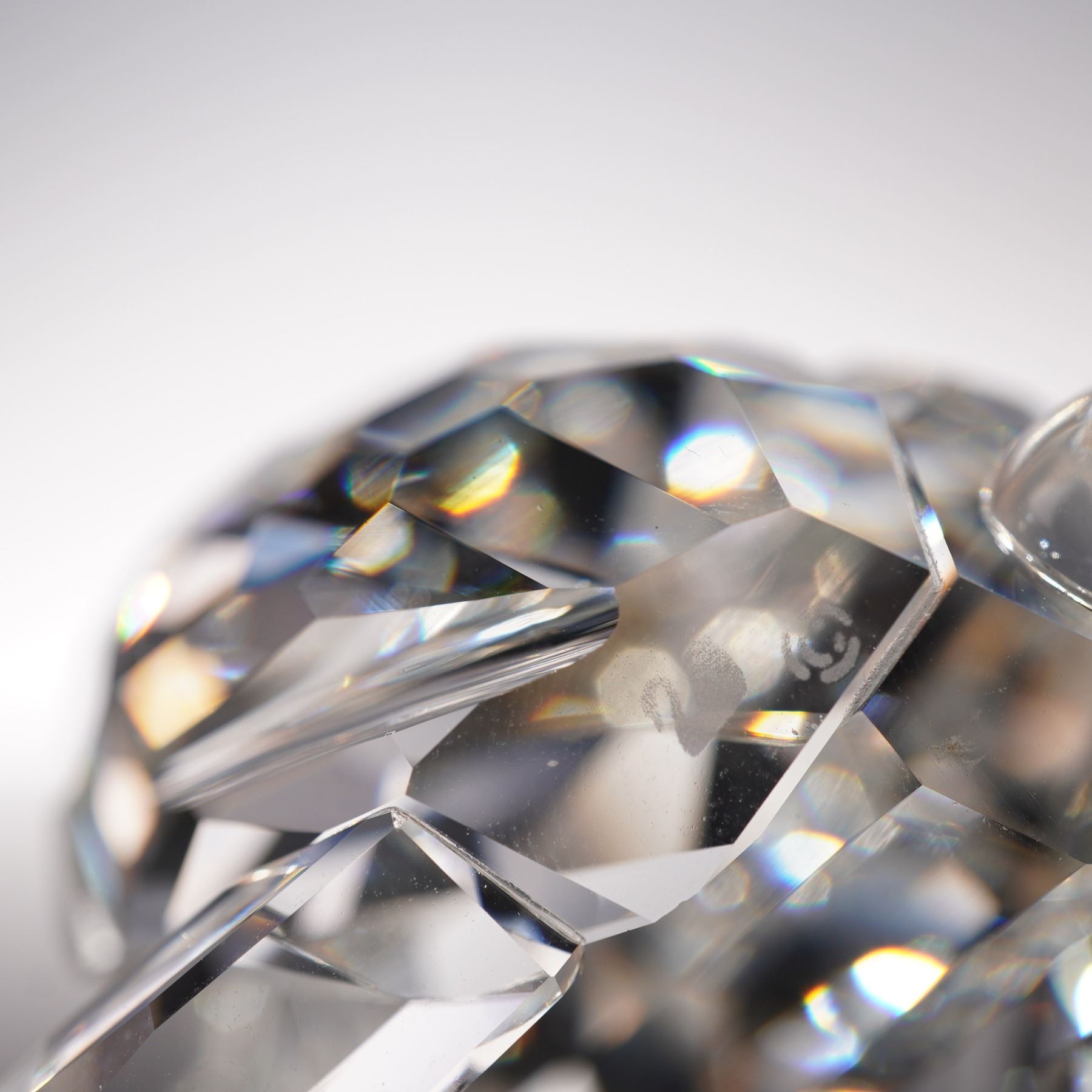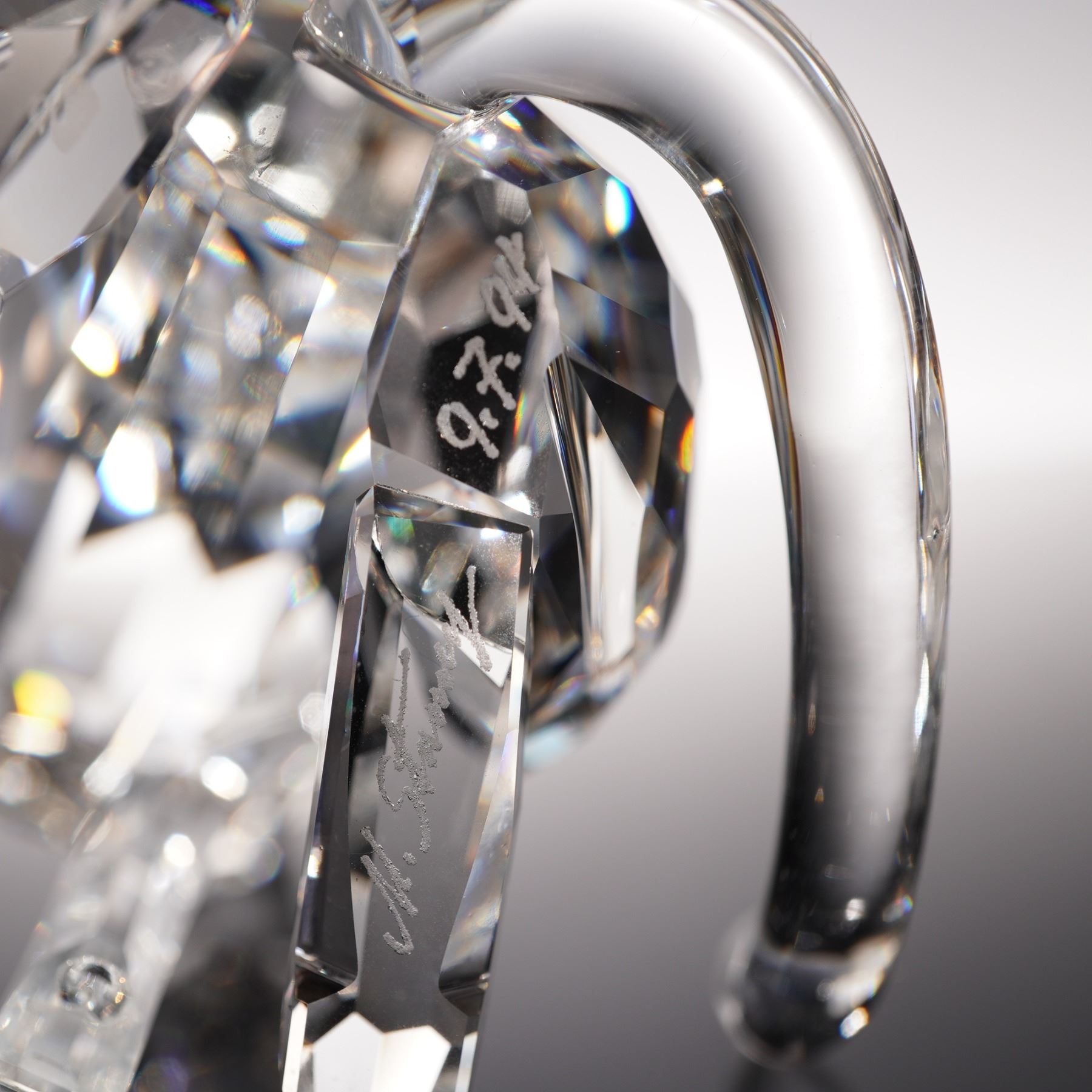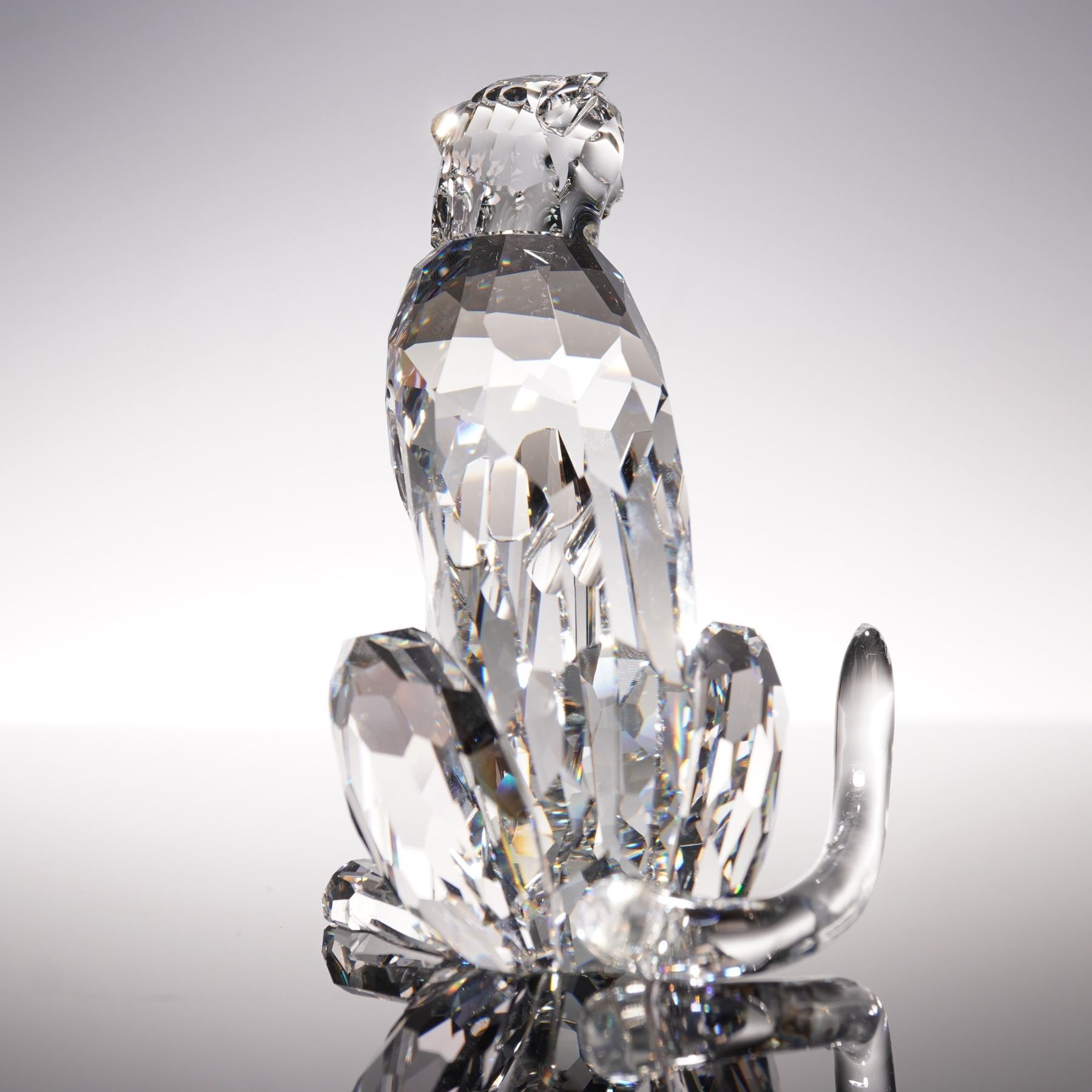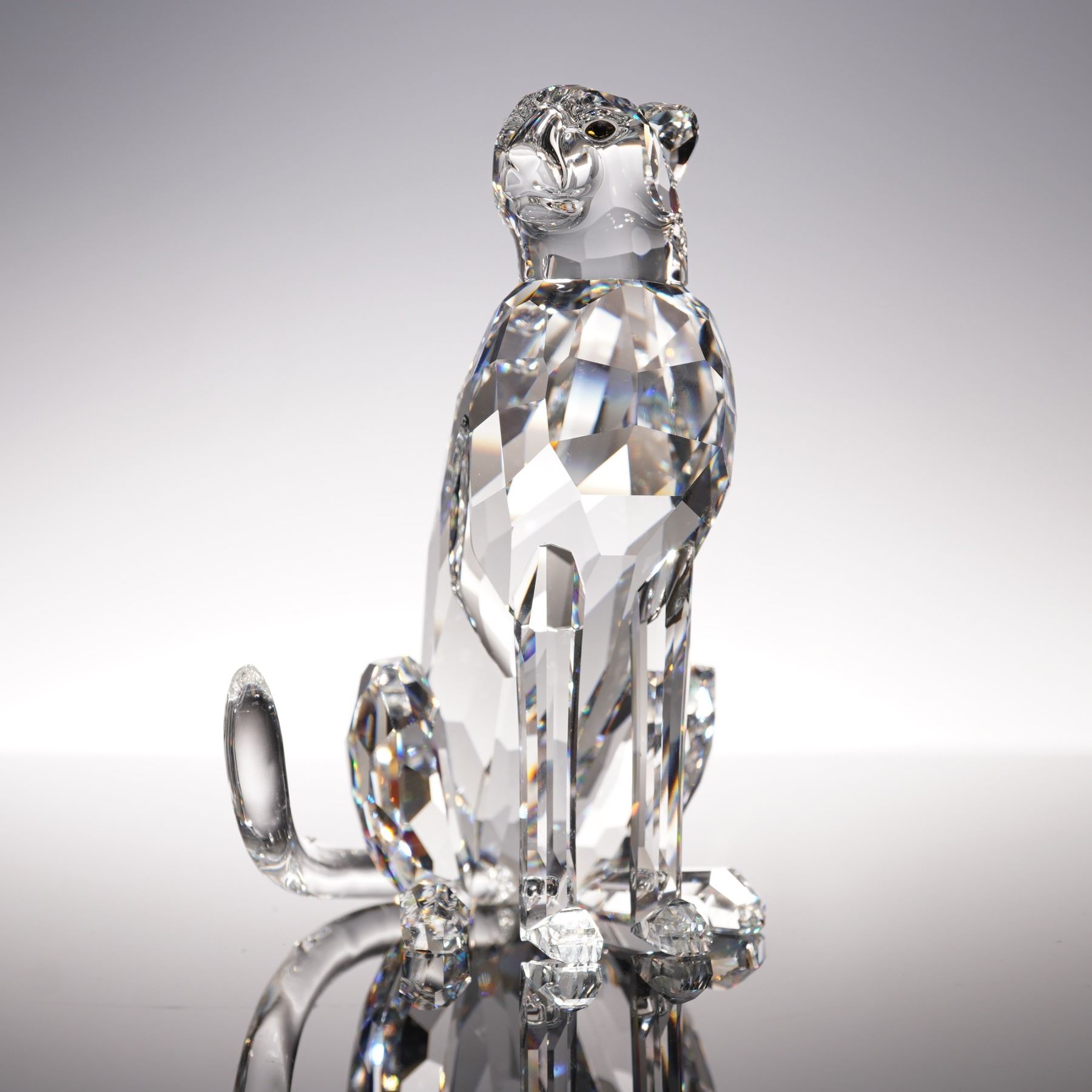 Magnificent Swarovski Crystal Cheetah High Tail figurine, Variation 2, designed by Michael Stamey for the Silver Crystal "African Wildlife" collection. This impressive work of art captures the poised power of the cheetah seated alertly with tail arched in a graceful curve. Crafted entirely from clear faceted crystal with jet black crystal eyes, the sculpture embodies balance, strength, and elegance. This particular example is hand-signed and dated by the artist Michael Stamey ˜06, enhancing its desirability among collectors. Includes original Swarovski Silver Crystal presentation box. 183225.