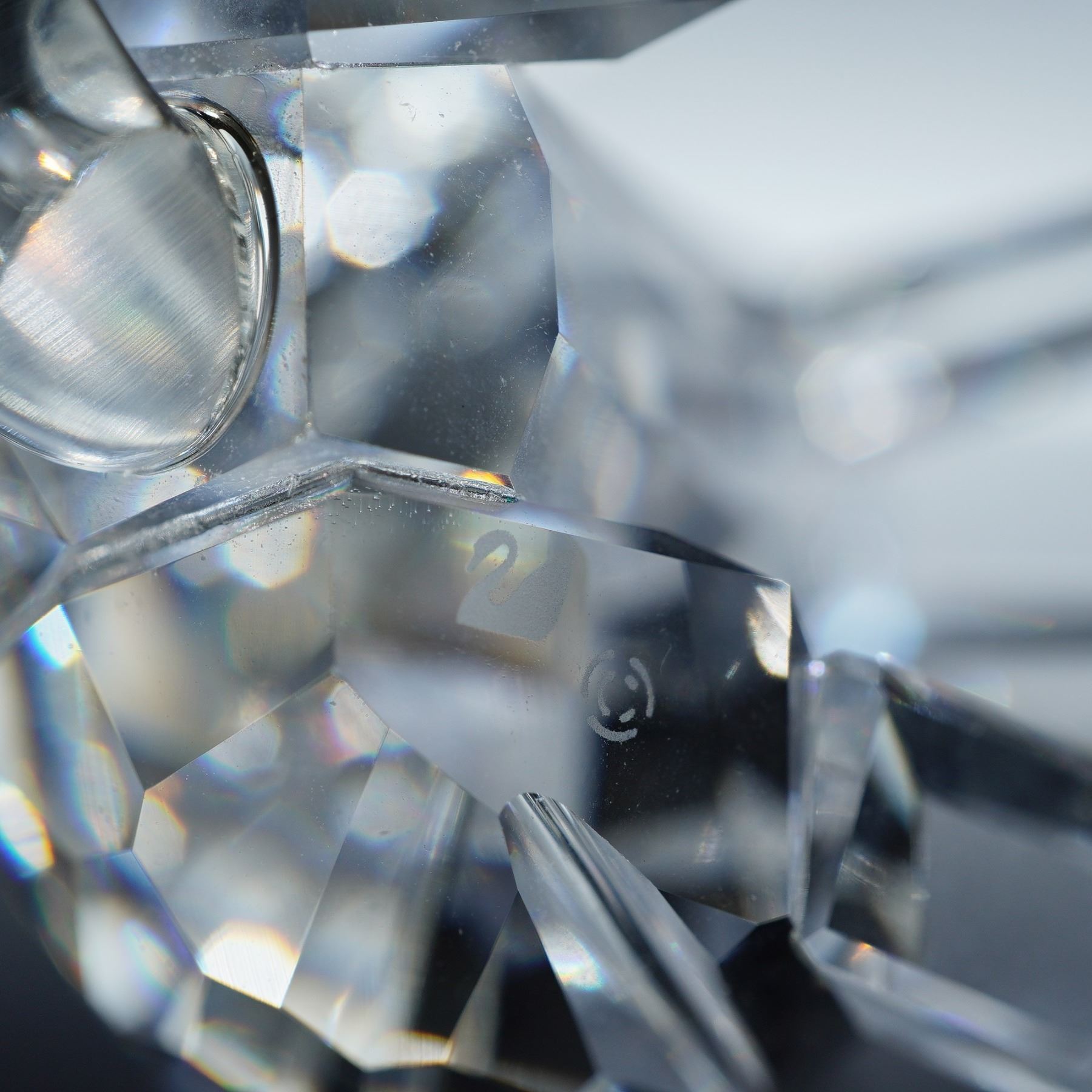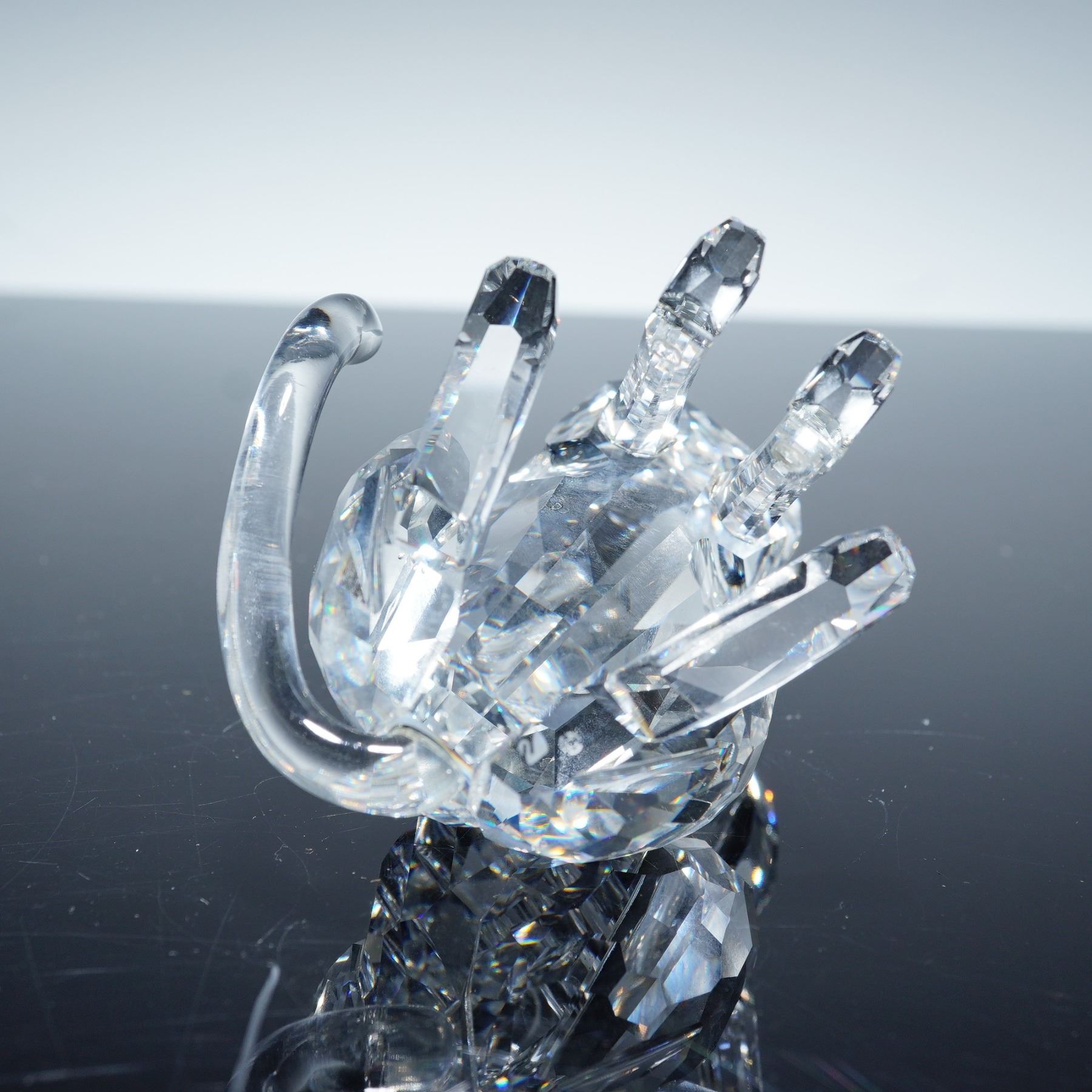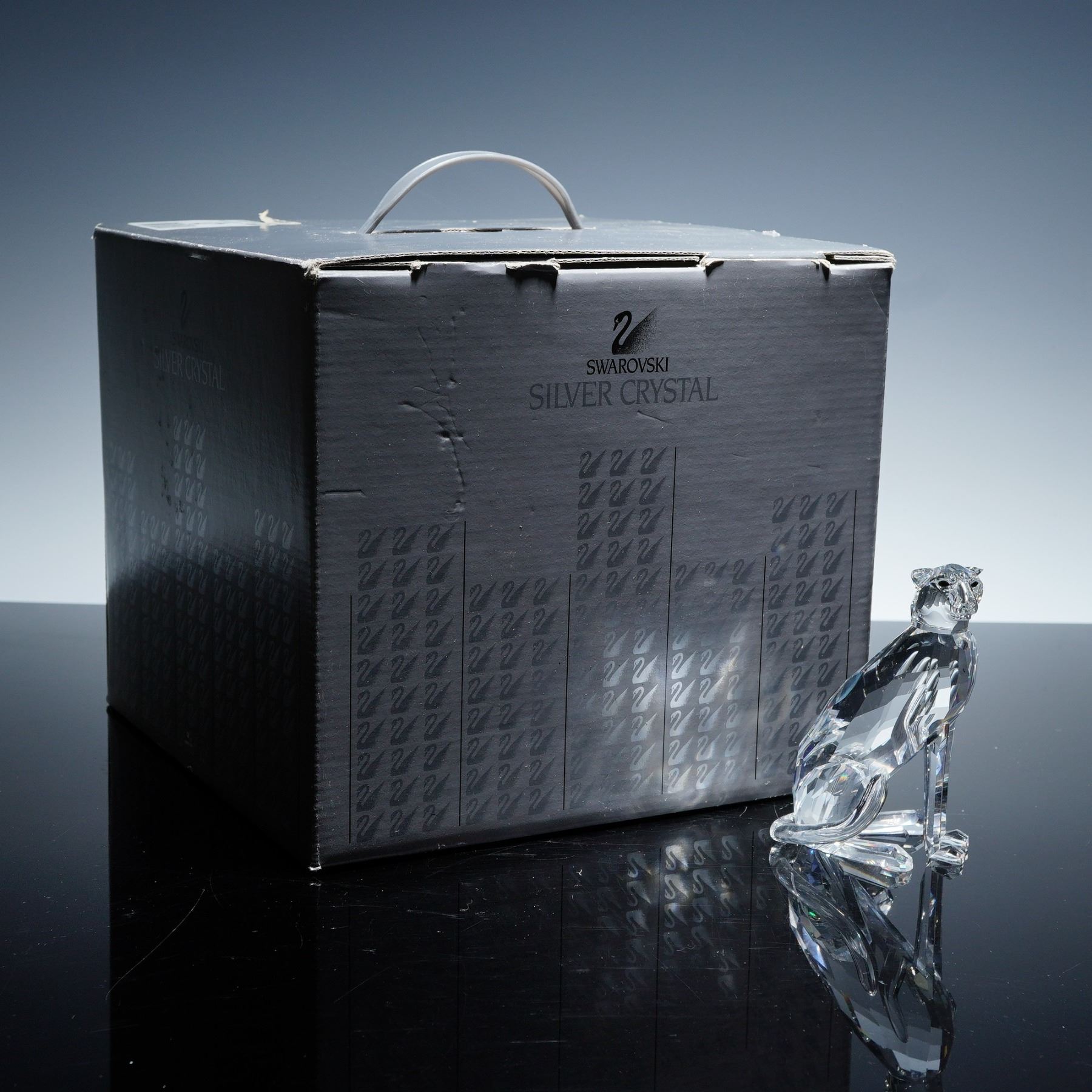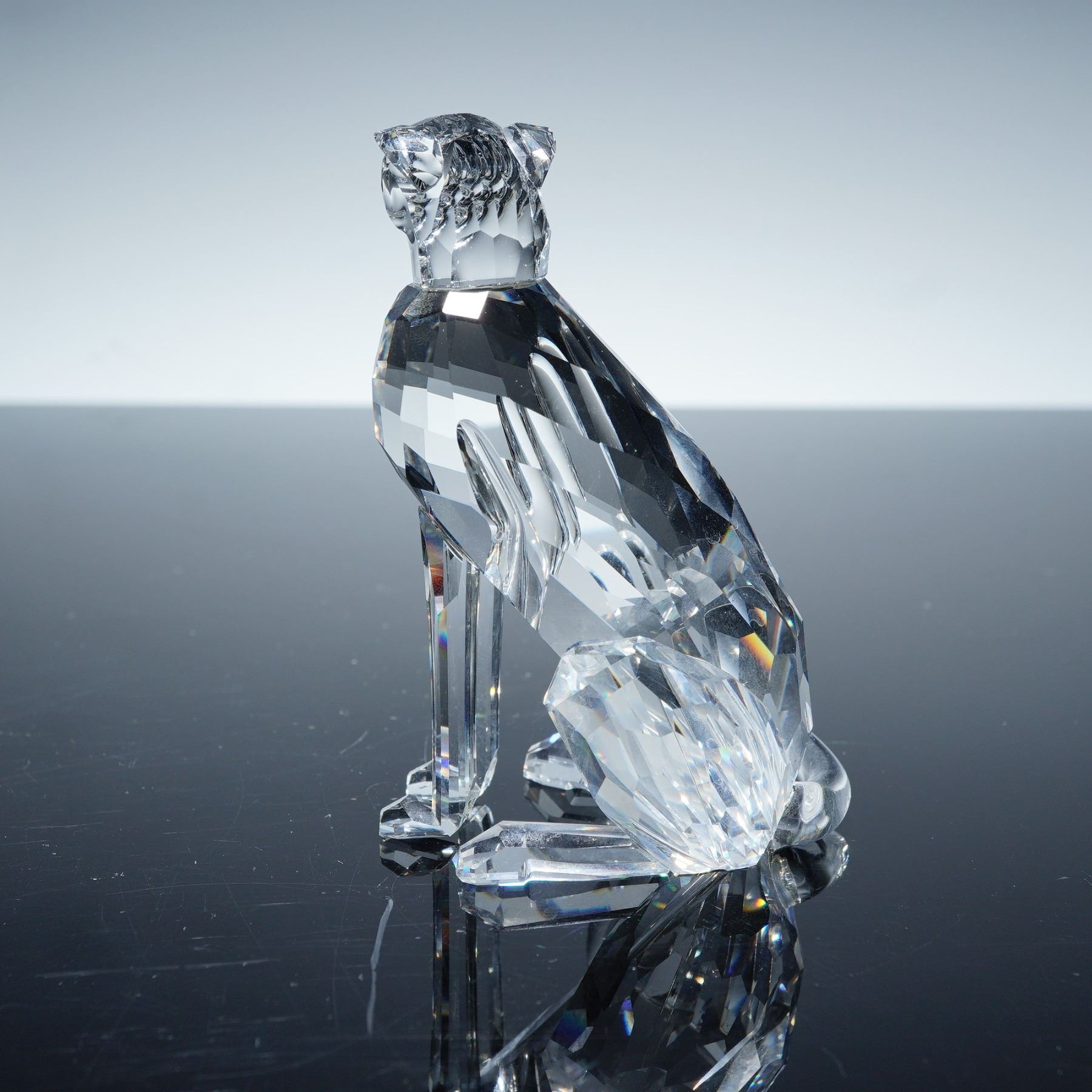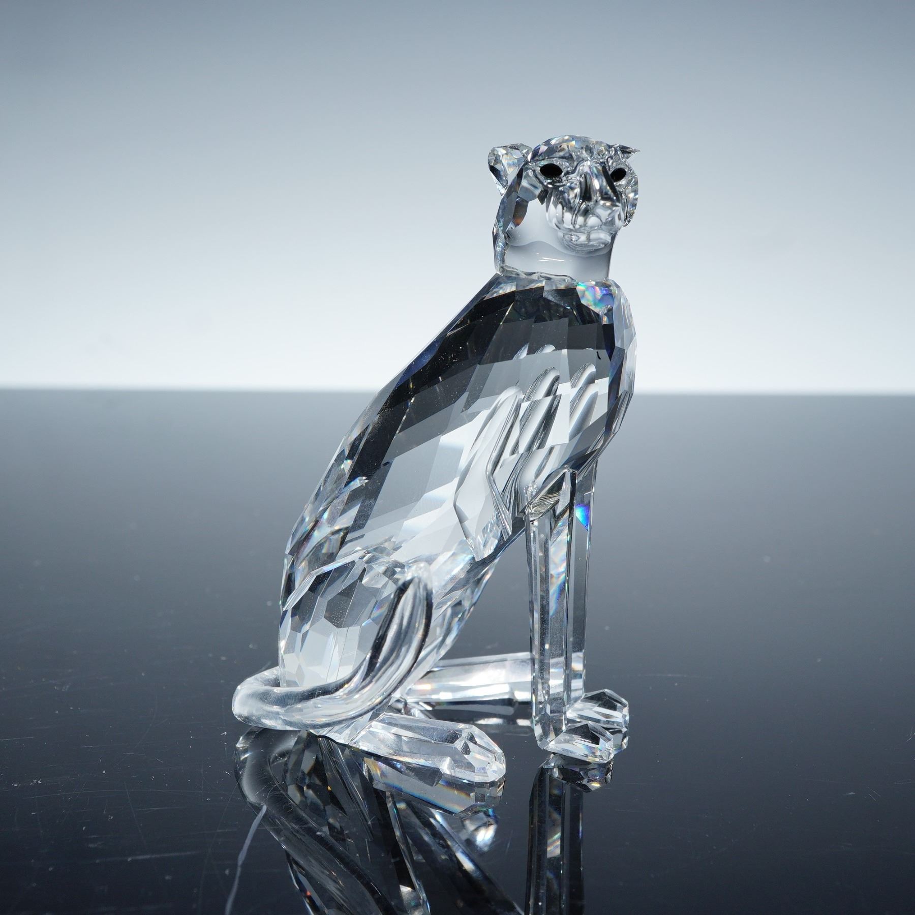 A striking Swarovski crystal figurine depicting a cheetah in a seated pose. Crafted in clear faceted crystal with detailed features and black crystal eyes, this piece highlights Swarovski's signature precision cutting and lifelike artistry. The figurine is etched with the Swarovski swan mark and comes with its original box, making it an ideal addition for collectors or a refined display piece.