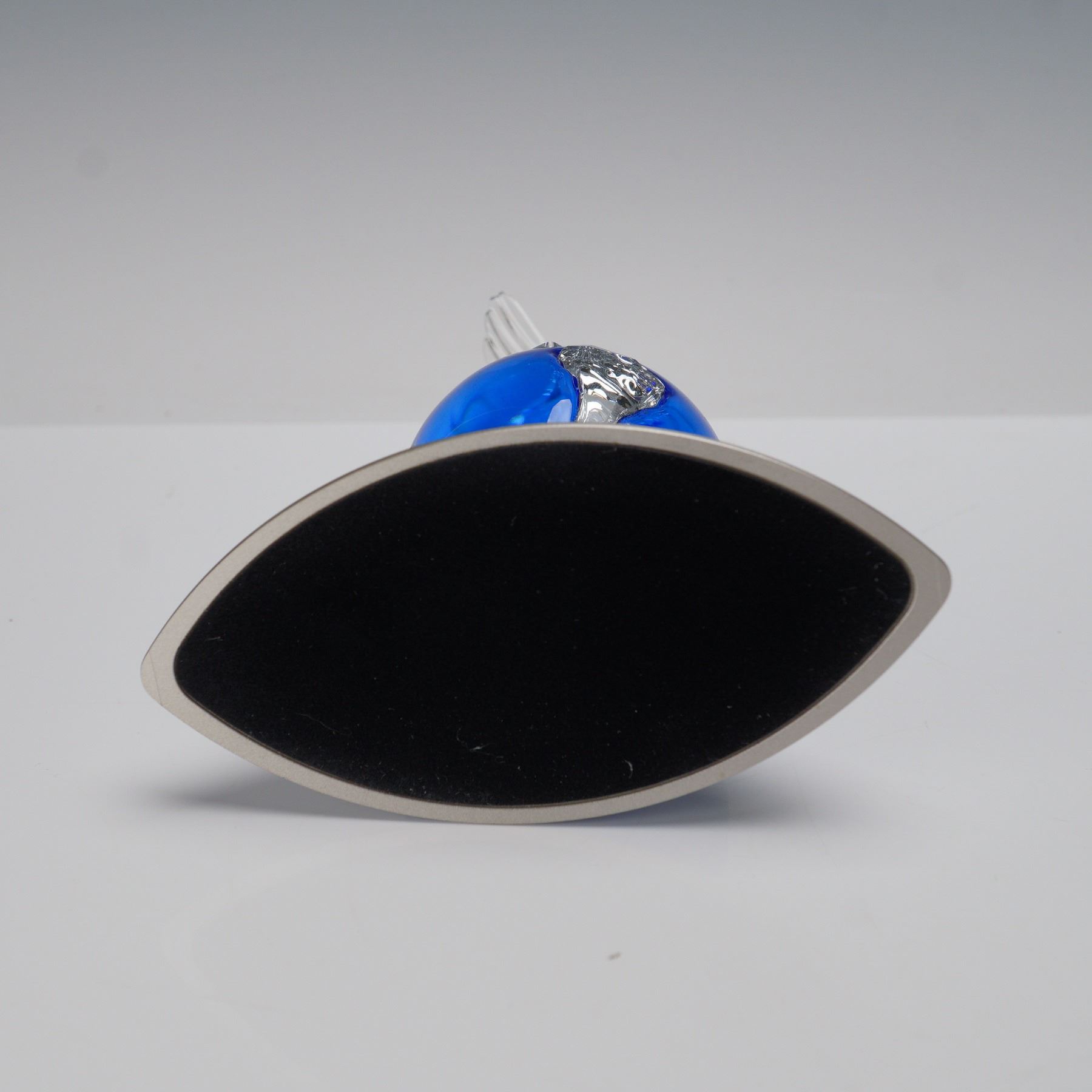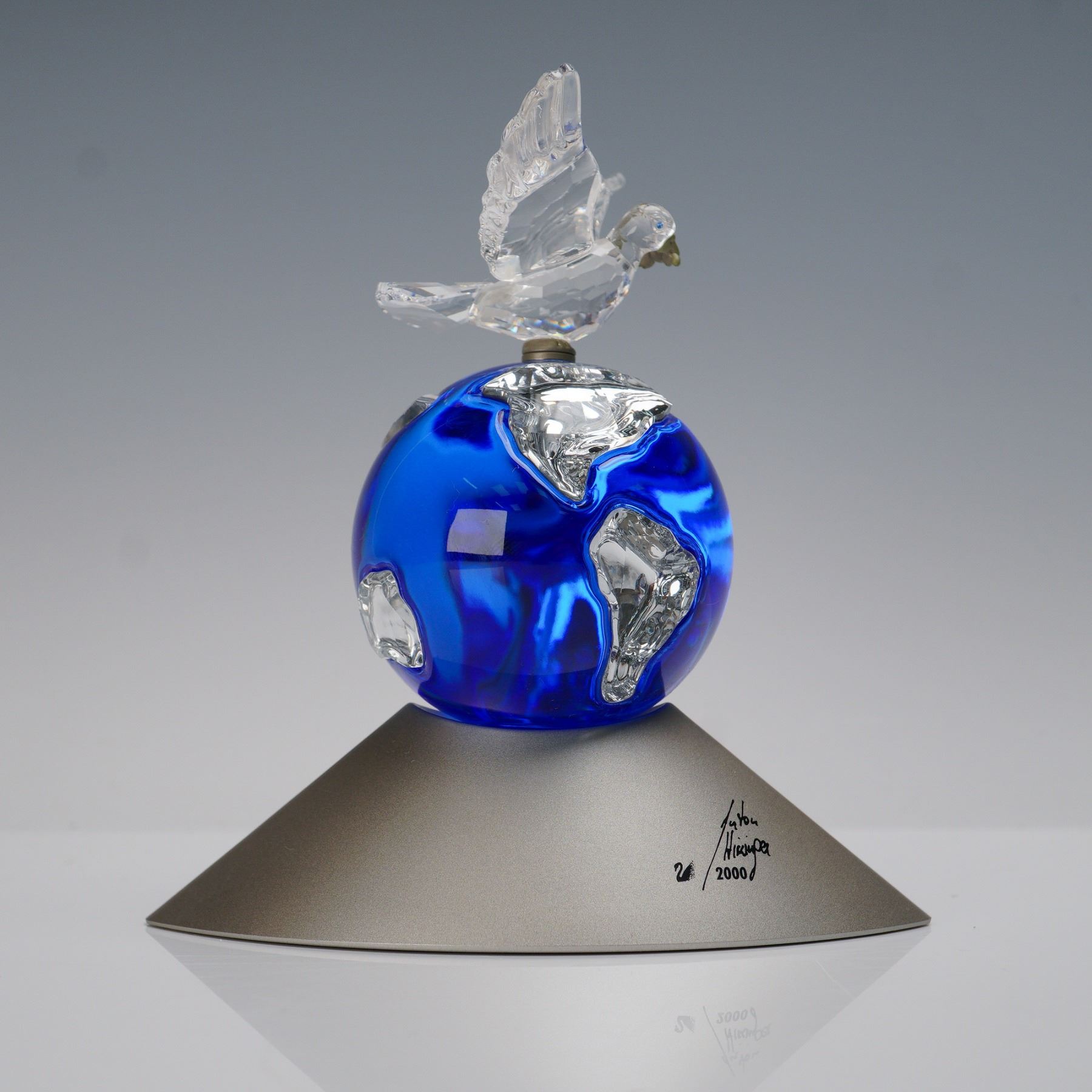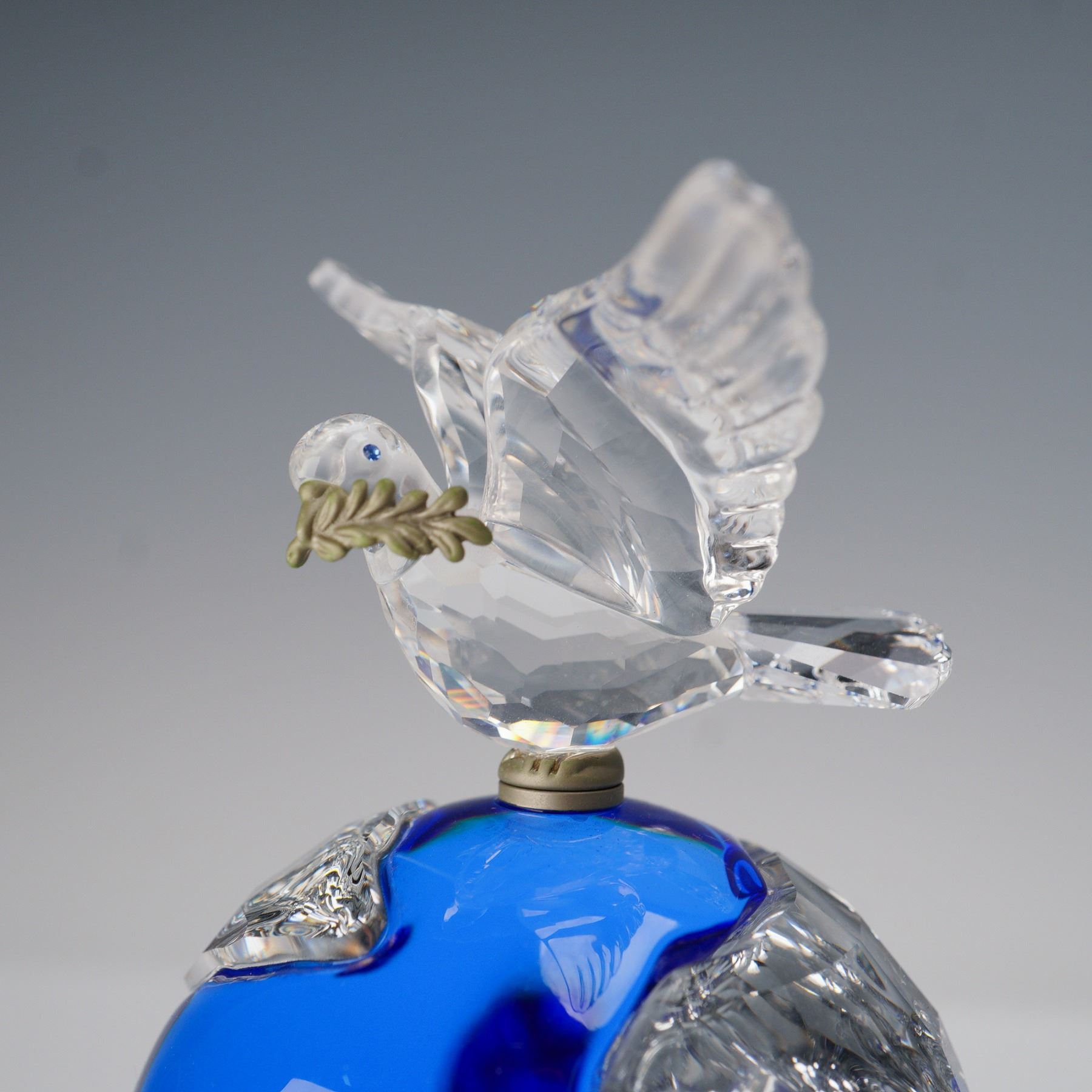 Limited edition Swarovski crystal figurine, depicting a faceted clear crystal dove holding an olive branch perched atop a cobalt blue crystal globe with clear crystal continents. The globe rests on a matte metallic conical base, signed and numbered.