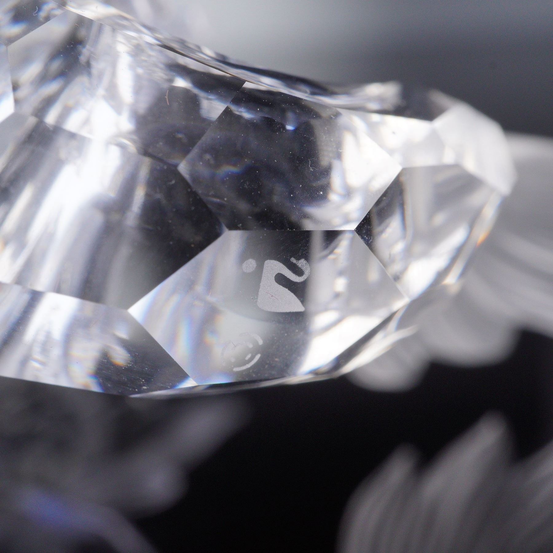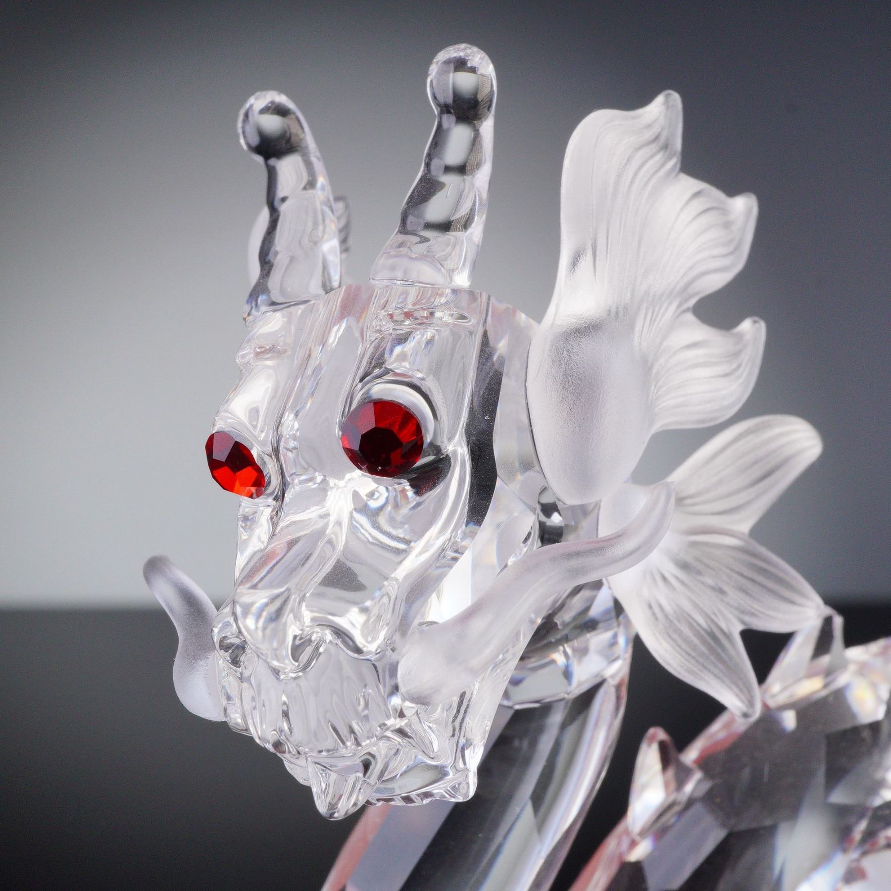 The second edition of the Fabulous Creatures trilogy, the Dragon figurine, was available exclusively to SCS members in 1997. This stunning piece features a faceted clear crystal body with a frosted mane and tail, capturing the mystical power and elegance of the dragon. The figurine is mounted on a red and black base, and it includes the original box. The Swarovski backstamp is present.
