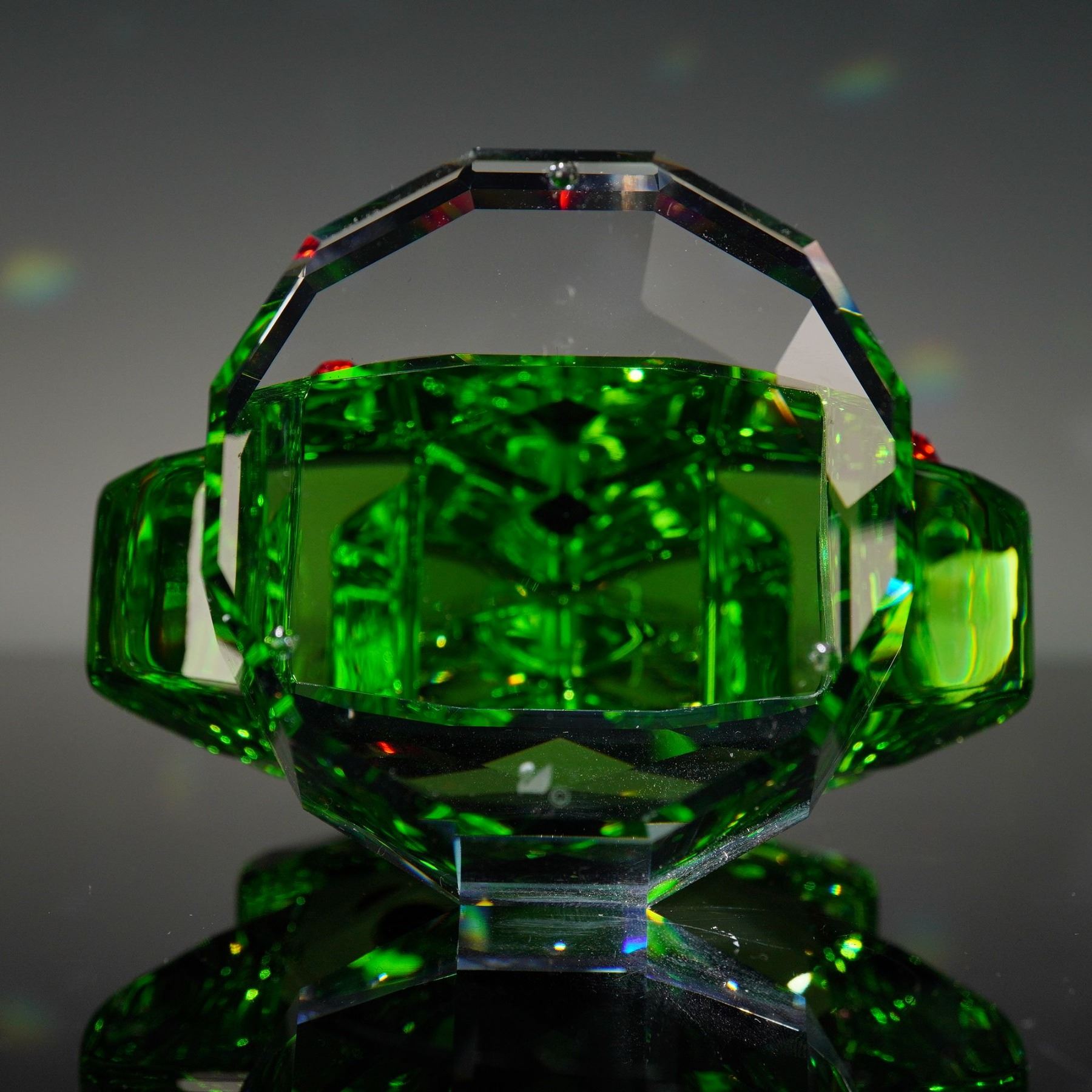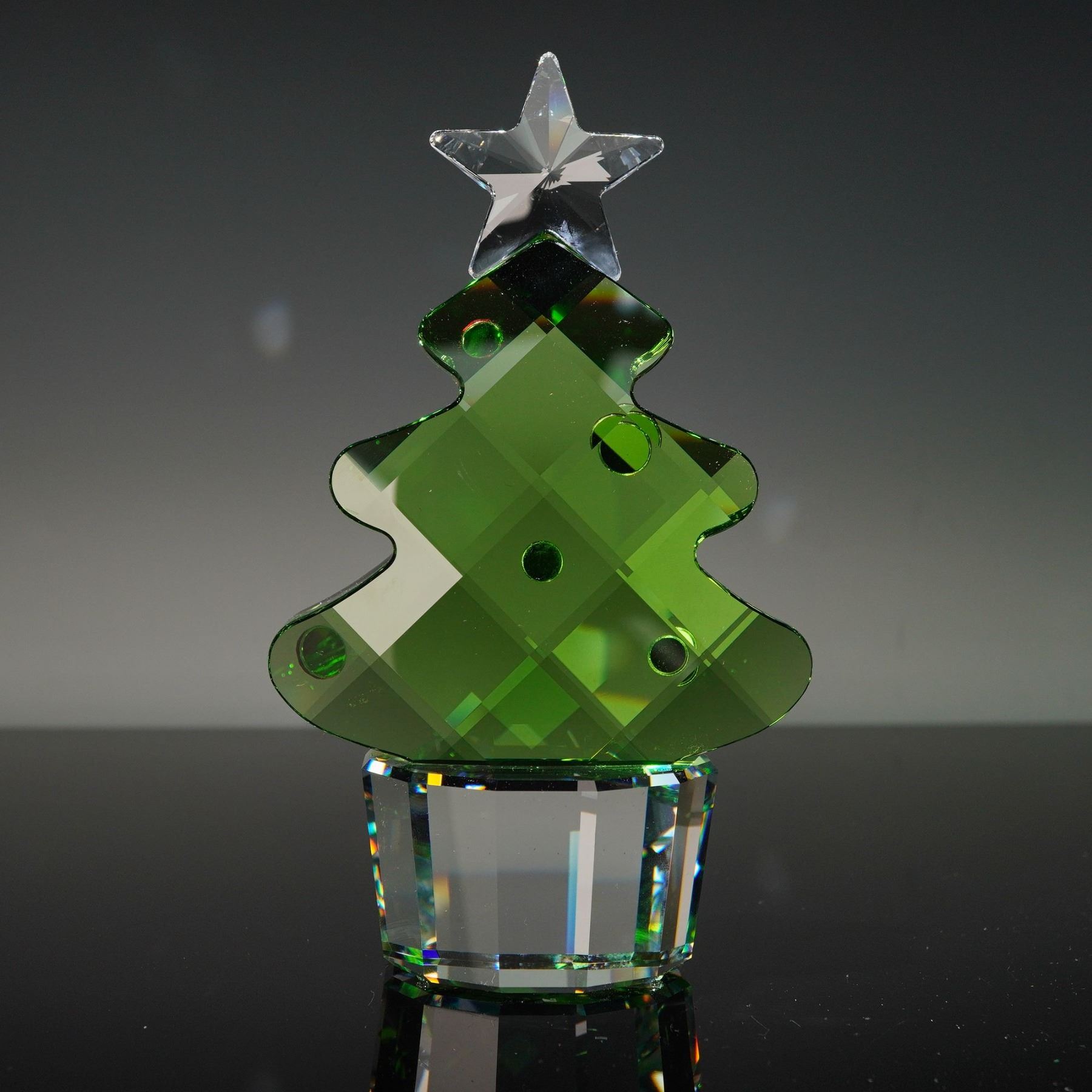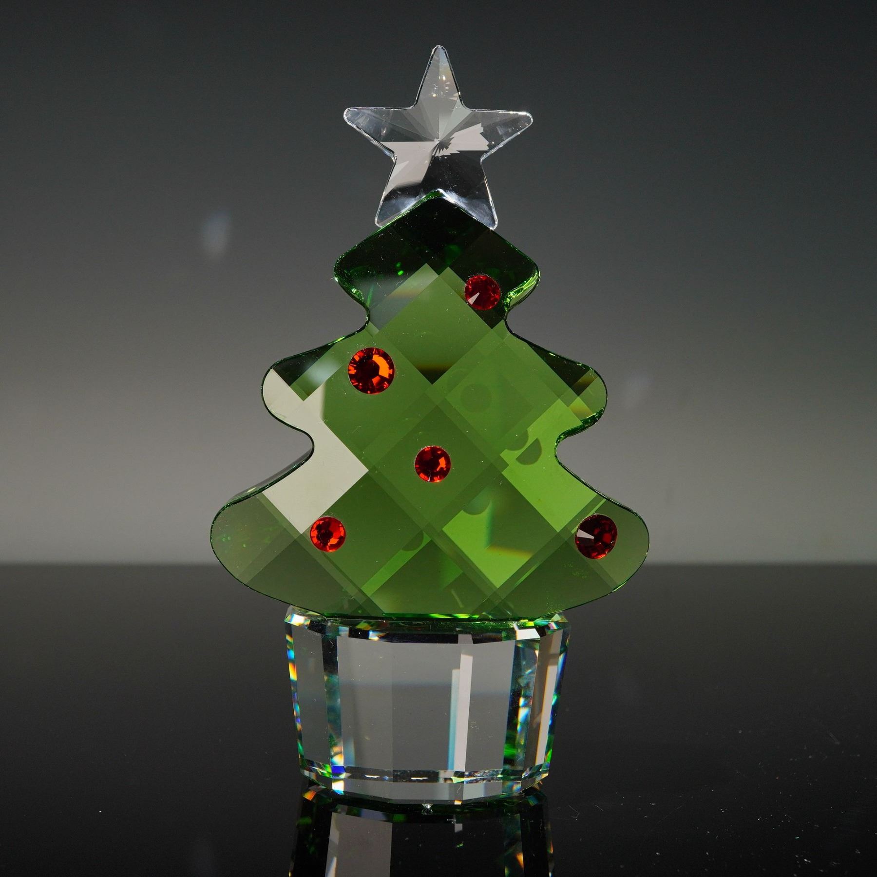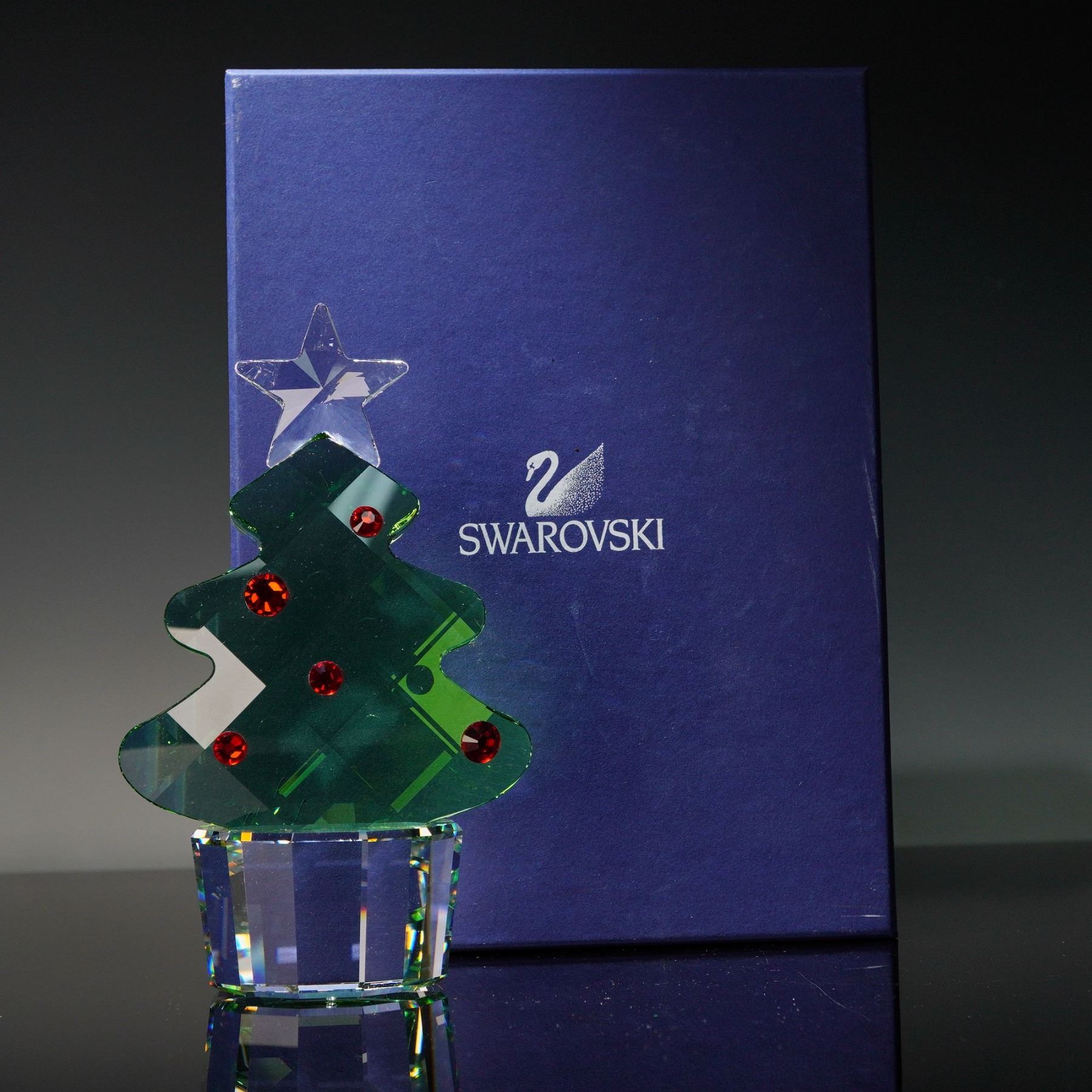 A large size crystal figurine that was part of the Christmas at Home collection. The tree features green, red and clear crystal. Swarovski crystal backstamp. This item has its original box.